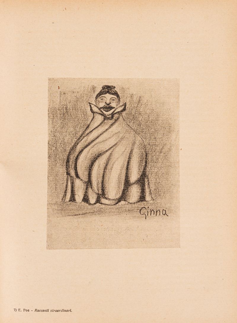 An interesting Italian edition of Edgar Allan Poe's tales, undated but datable to the first two decades of the 20th century. The illustrations are by Arnaldo Ginna (1890-1982), real name Arnaldo Ginanni Corradini, a pseudonym suggested by Giacomo Balla. He began his artistic career among the first Futurists, whom he met at the home of F.T. Marinetti. Among them were Boccioni, Carrà, and Russolo. But Ginna almost immediately distanced himself from the Futurist movement, which he nevertheless enthusiastically embraced, developing a more intimate style of painting, drawing on his strong spiritualist inclinations and his interest in spiritualism and the occult. He was also considered a precursor of Surrealism. The plates he drew for Poe's tales are a fitting example.