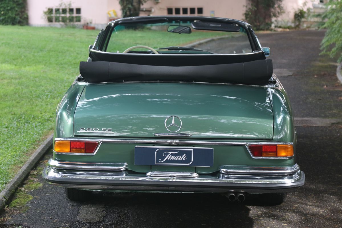 Cabriolets built on the W111 platform were presented at the 1961 Frankfurt Motor Show. In 1965 the 250 SE coupé and convertible (W111 III) were launched. These versions were fitted with disc brakes also at the rear and were then replaced in 1967 by the 280 SE (coupé and cabriolet), equipped with the 2.8 M130 injection, capable of delivering up to 160 hp. This car was delivered new on September 15, 1969 in France, as per the certificate of origin of the parent company, available. The car was registered in Italy in 1994 with Como number plates which it currently has. The car is in an excellent state of conservation. The MOT is valid and renewed until 2024. The livery is an elegant green combination with black leather interior. The car is equipped with automatic transmission, air conditioning, original Becker radio, hood cover.
