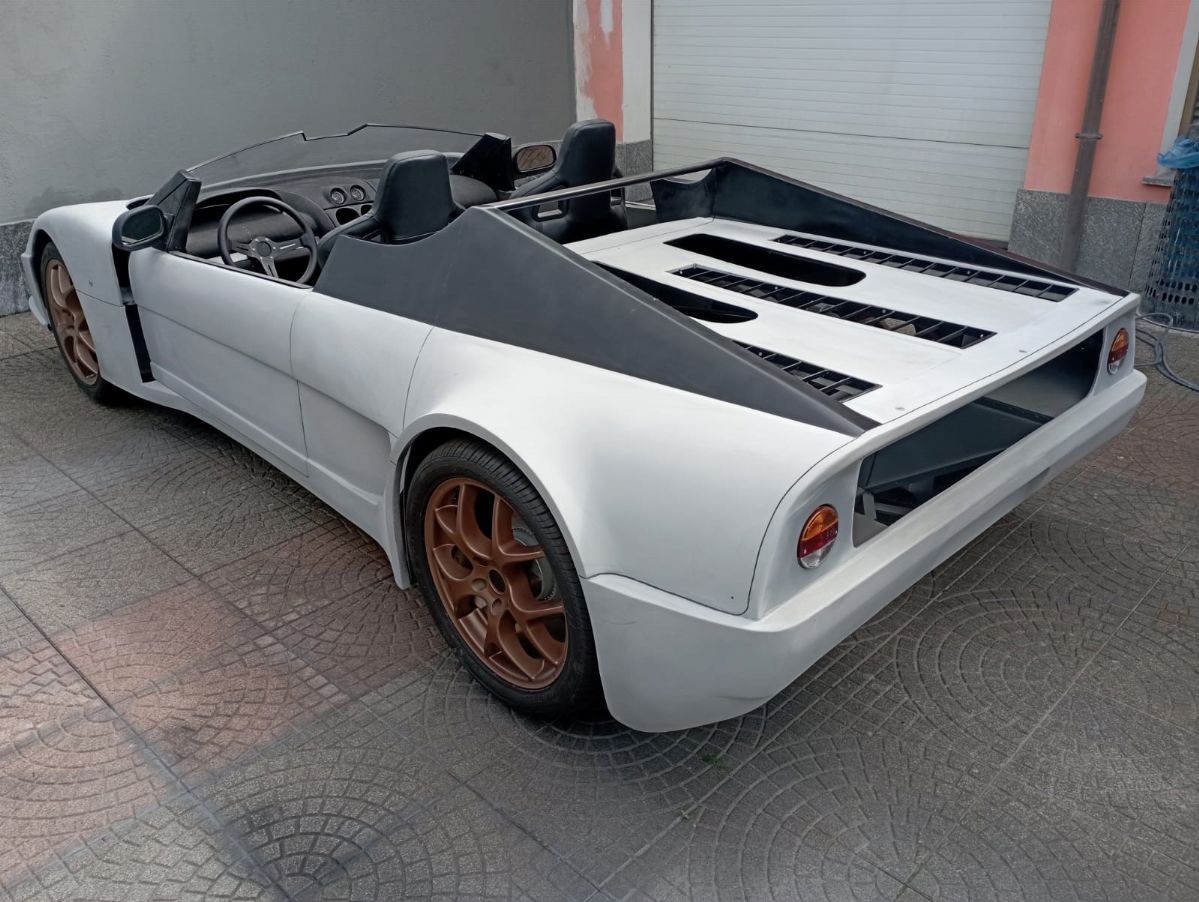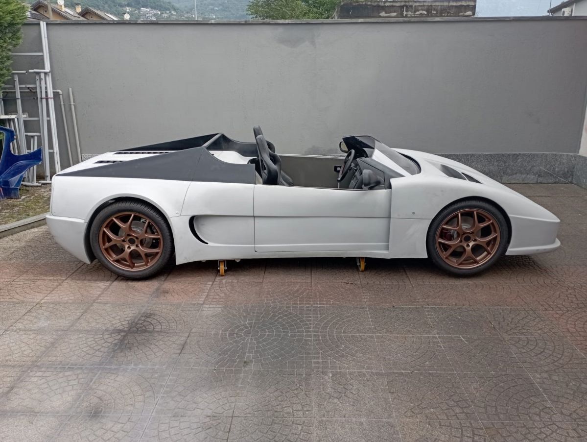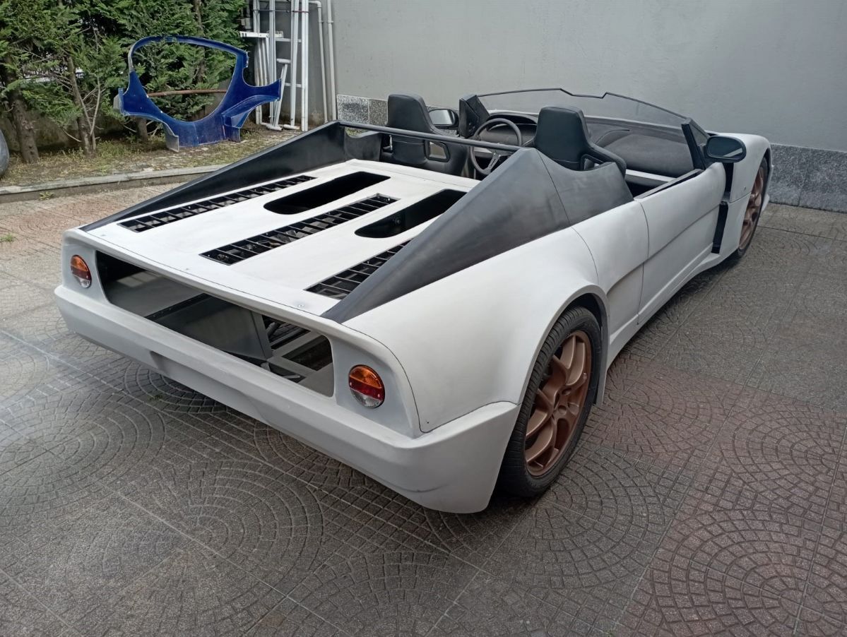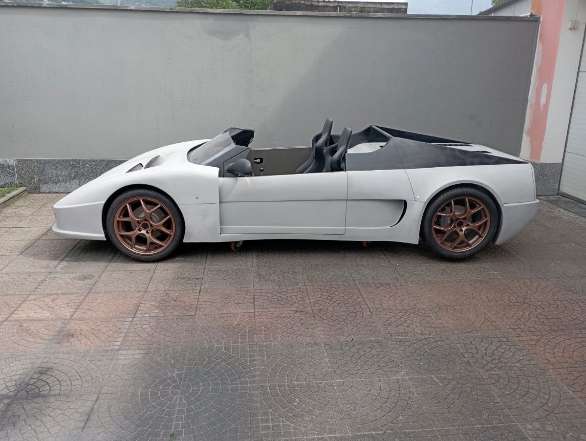 This car, chassis EBM-RSA 99100021, was designed by Pininfarina for an unknown English company called EB Automotive, which designed racing cars. The idea was to create an open sports car that could be used on the road but also on track. The example was never registered, and was ordered by the Sultan of Brunei in silver color with matte black details, bronze/golden wheels and black and gold interiors. It was never finished and delivered, and it always remained in England until 2017 when it arrived in Italy. The car today has a complete engine to be overhauled, the interior has been assembled but the electrical system is missing.