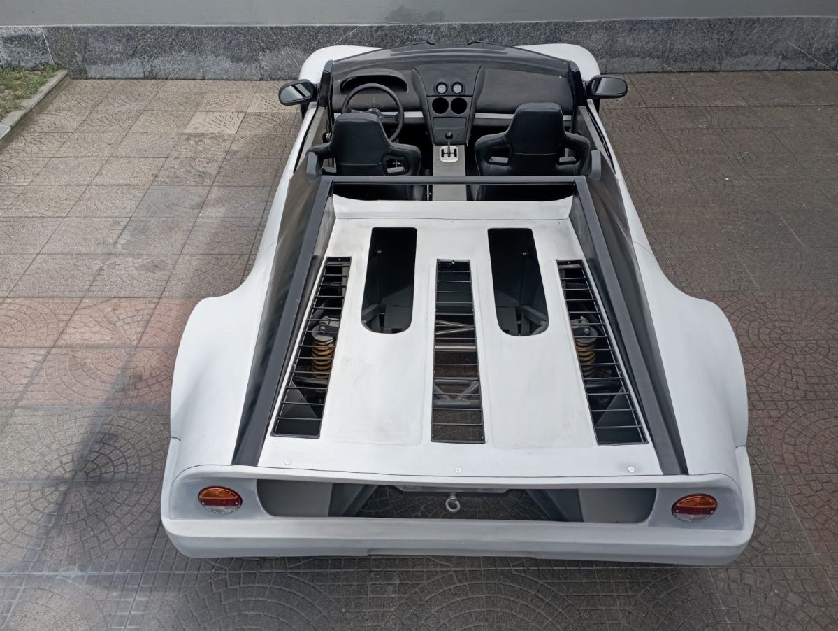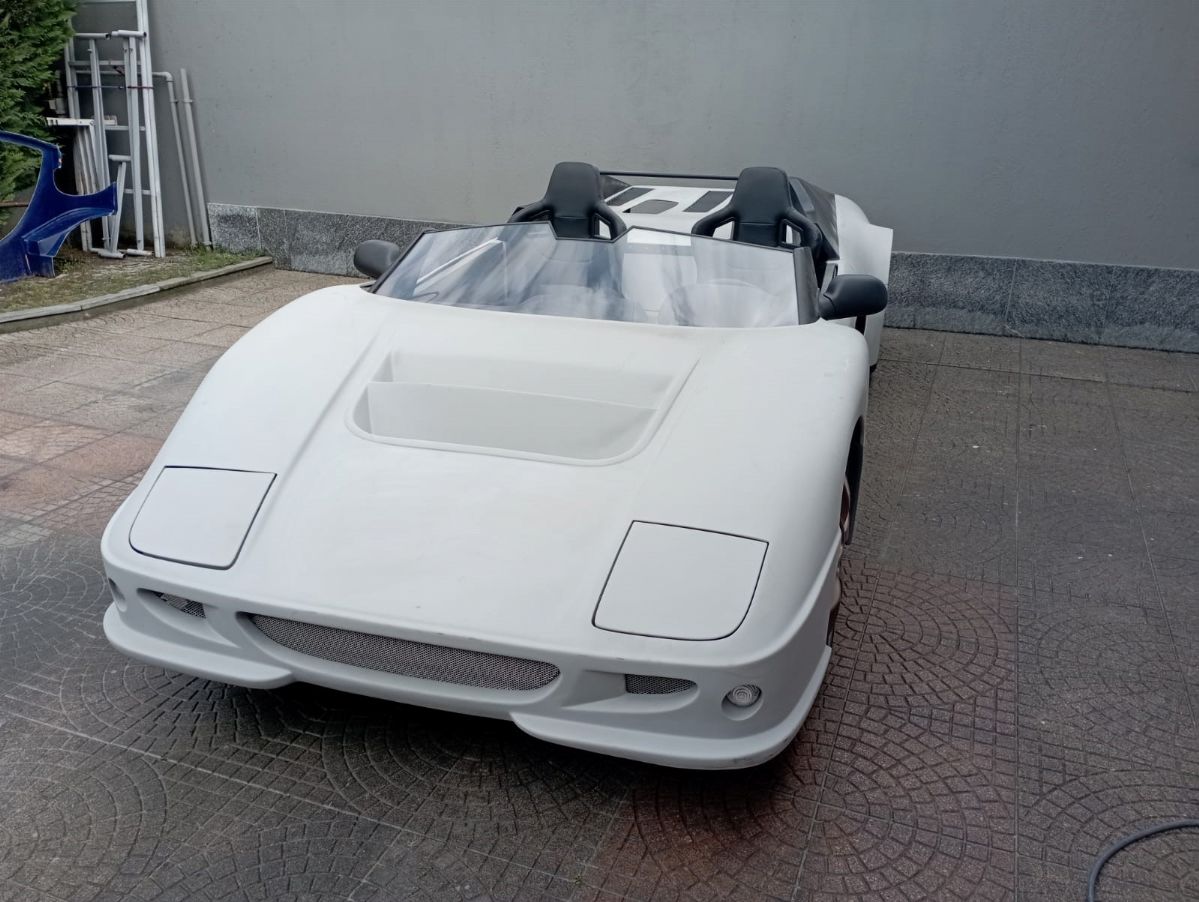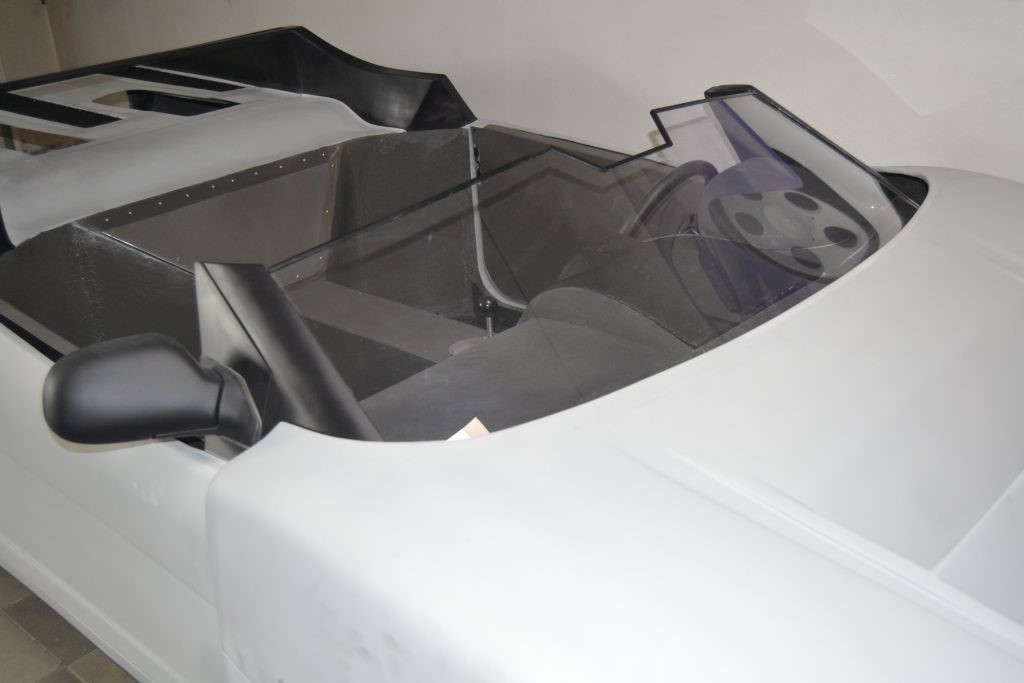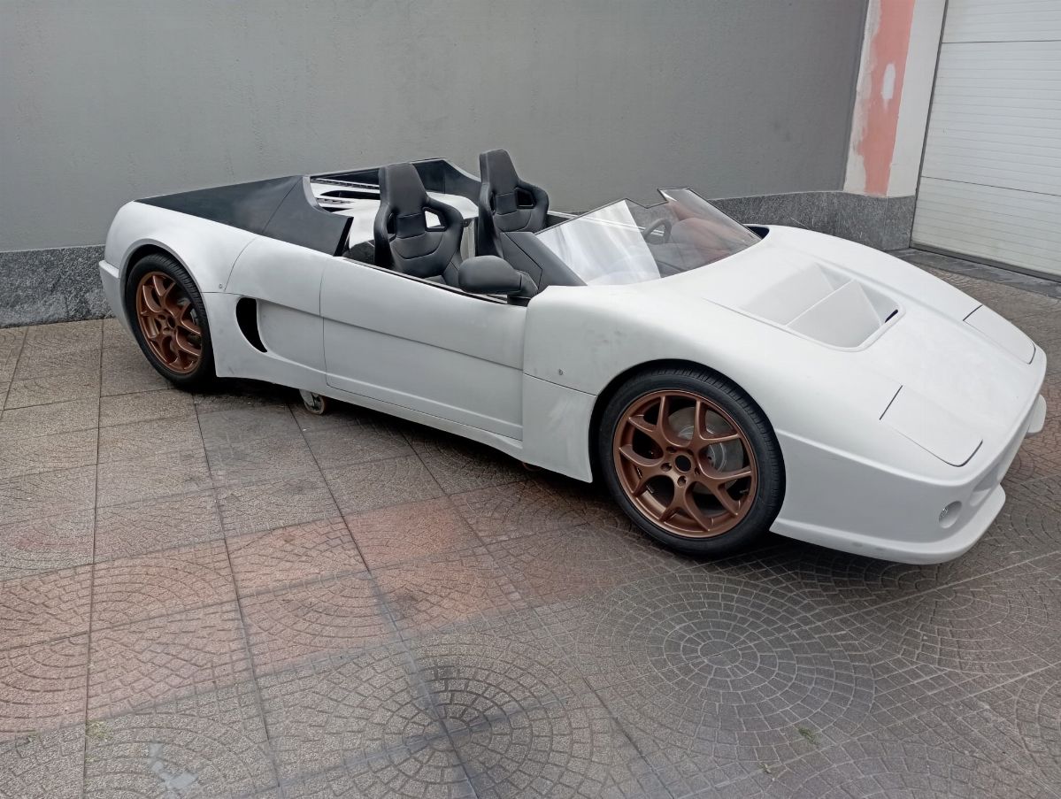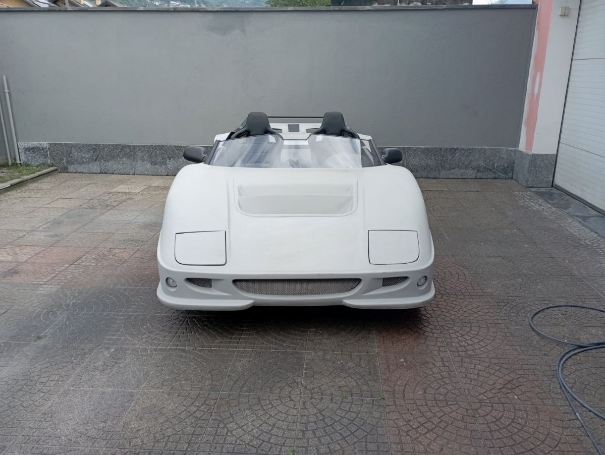 This car, chassis EBM-RSA 99100021, was designed by Pininfarina for an unknown English company called EB Automotive, which designed racing cars. The idea was to create an open sports car that could be used on the road but also on track. The example was never registered, and was ordered by the Sultan of Brunei in silver color with matte black details, bronze/golden wheels and black and gold interiors. It was never finished and delivered, and it always remained in England until 2017 when it arrived in Italy. The car today has a complete engine to be overhauled, the interior has been assembled but the electrical system is missing.