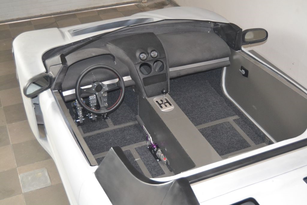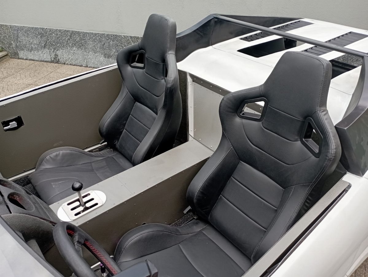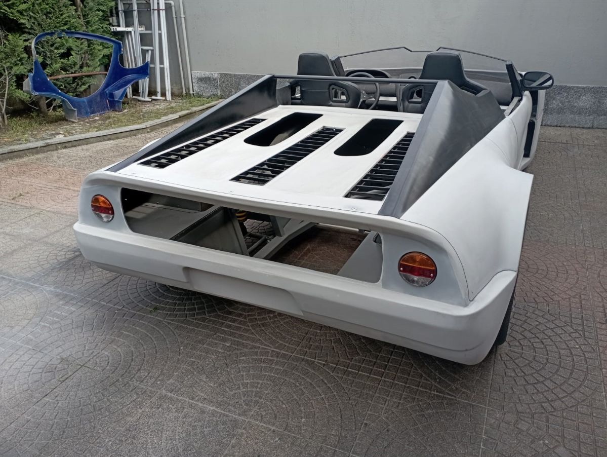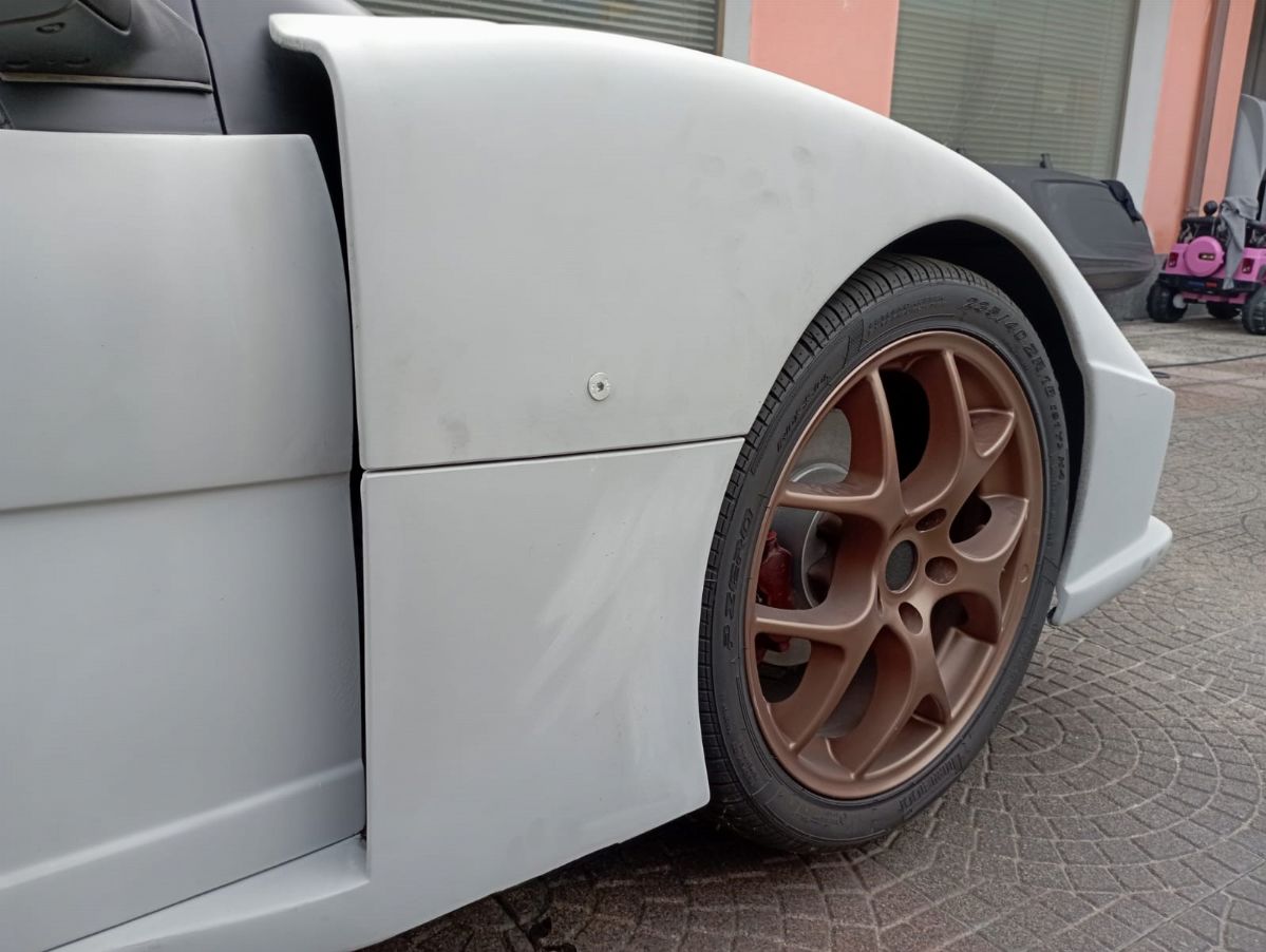 This car, chassis EBM-RSA 99100021, was designed by Pininfarina for an unknown English company called EB Automotive, which designed racing cars. The idea was to create an open sports car that could be used on the road but also on track. The example was never registered, and was ordered by the Sultan of Brunei in silver color with matte black details, bronze/golden wheels and black and gold interiors. It was never finished and delivered, and it always remained in England until 2017 when it arrived in Italy. The car today has a complete engine to be overhauled, the interior has been assembled but the electrical system is missing.
