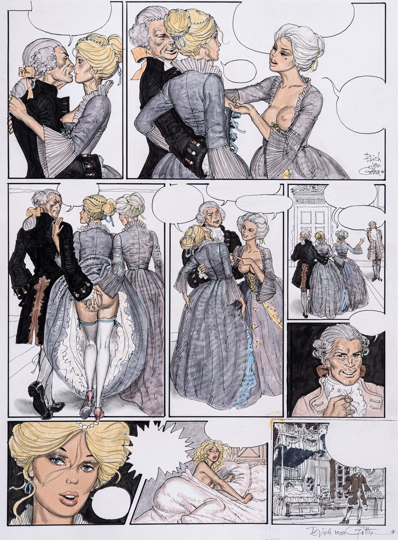Original comic art made by Von Gotha for the erotic saga "Les malheurs de Janice," first published in France between 1988 and 1990. The last panel has been reassembled. Signed.