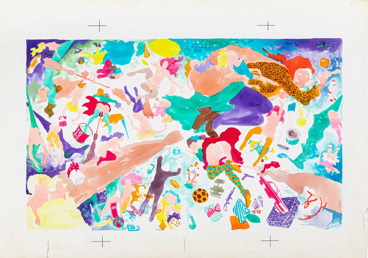 Original illustration made by Buzzelli for the erotic weekly magazine Menelik n. 65 of 1973. Artwork recently published in the volume Buzzelliade on page 102 and 103 by Coconino in 2020. The relationship between Buzzelli and eroticism has always been complex to say the least, leading the Roman master to create works as crazy as they are uncomfortable in crowded compositions poised between the bizarreness of Grosz and the irony of Jacovitti . Watercolored on the back. Small tears on the margins, vertical crease in the center and slight creases on the margins. Signed and titled.