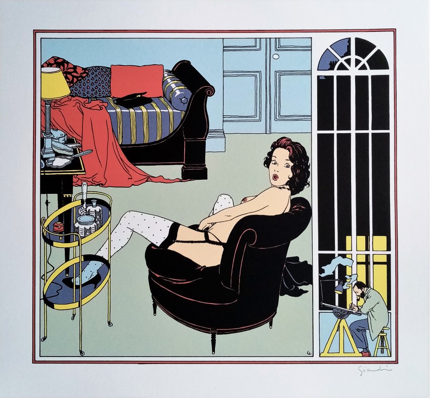 Original illustration made by Giardino for "La Finestra di Notte", a short erotic story without text published for the first time in black and white in the Vittorio Giardino Glamor Book published by Glamor International in 1986. A refined and sensual work which in 1998 with the title "Fenêtres de nuit" became a portfolio containing 8 color silkscreens (reproducing the drawings of '86 in color) printed by the famous Raspoutine bookshop in Lausanne in just 200 copies. Giardino stages the turbulent night of a designer (a clear self-portrait) caught spying from the window on a beautiful girl who unknowingly becomes his muse until an abrupt epilogue. Signed on the front and back with the artist's stamp.