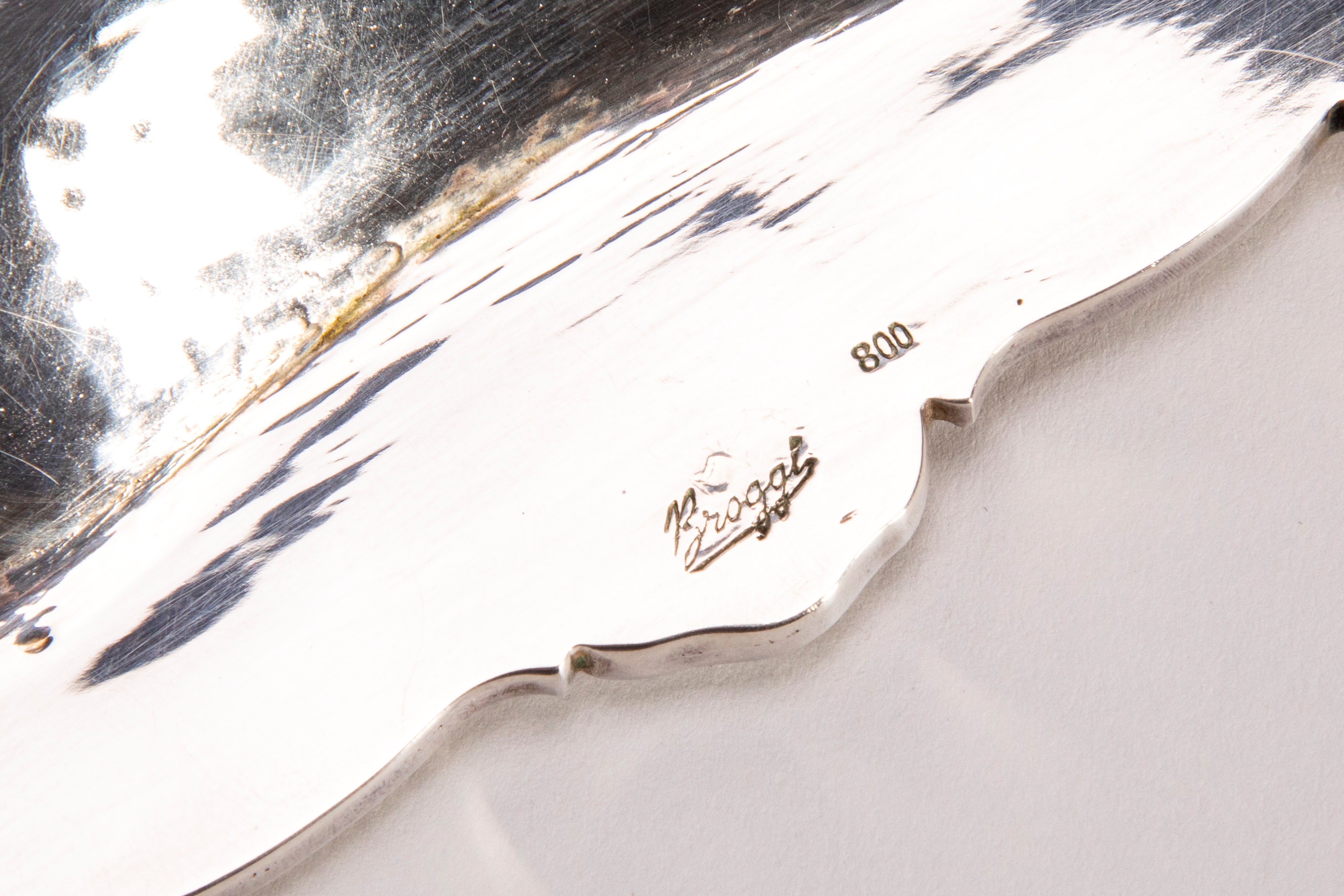 rectangular in shape with a shaped edge, a band chiseled with flowers, scrolls and stylised shell valves, and an engraved heraldic coat of arms in the centre of the hollow.