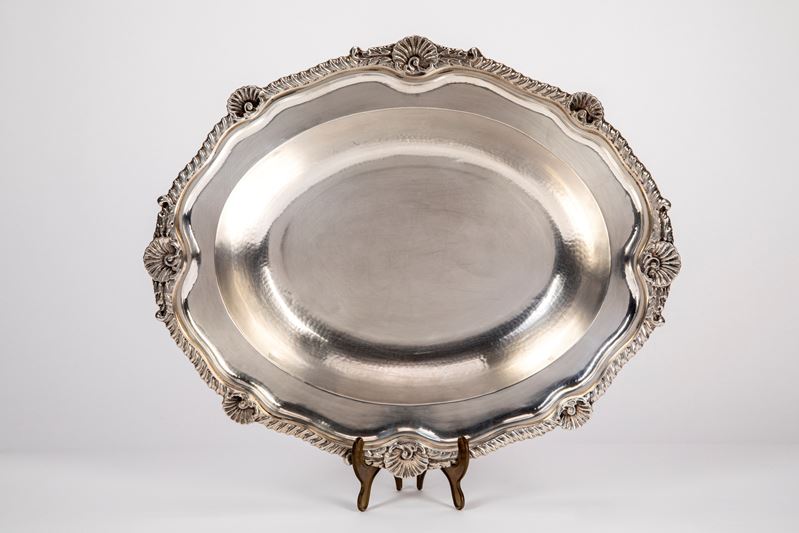 ovoid in shape with a hollow decorated with light hammering and a chiseled edge with an alternating shell valve motif.