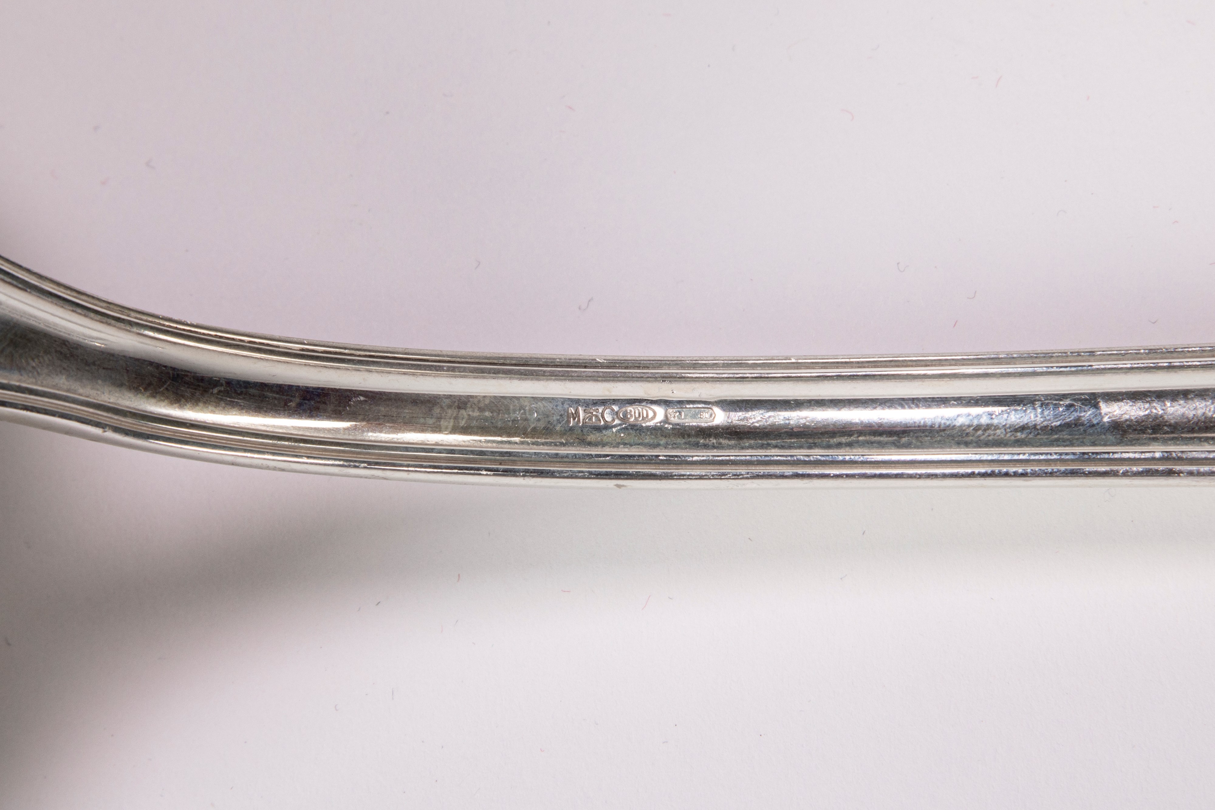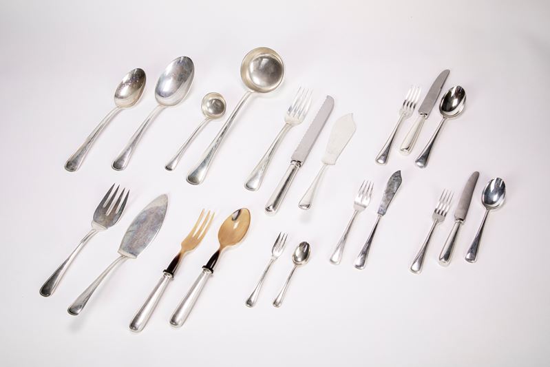 12 forks, 12 knives, 12 spoons, 12 fish forks, 12 fish knives, 12 appetizer forks, 12 appetizer knives, 12 appetizer spoons, 12 teaspoons, 12 dessert forks, 1 bread knife, 2 salad servers, 1 ladle, 2 turners, 2 serving forks, and 3 serving spoons.