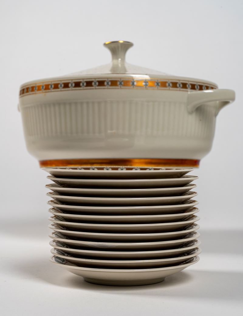 Consisting of 9 soup plates, 20 dinner plates, 4 small plates, 3 serving plates (one circular and two oval), a salad bowl, a tureen with lid, 10 cups with 12 saucers, a sugar bowl, and a coffee pot. Minor chipping.