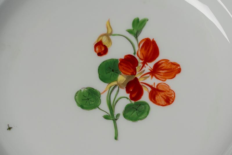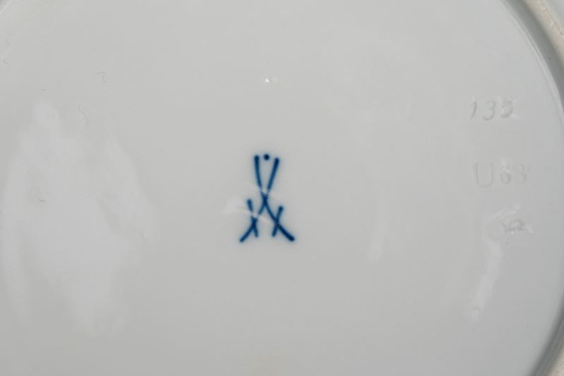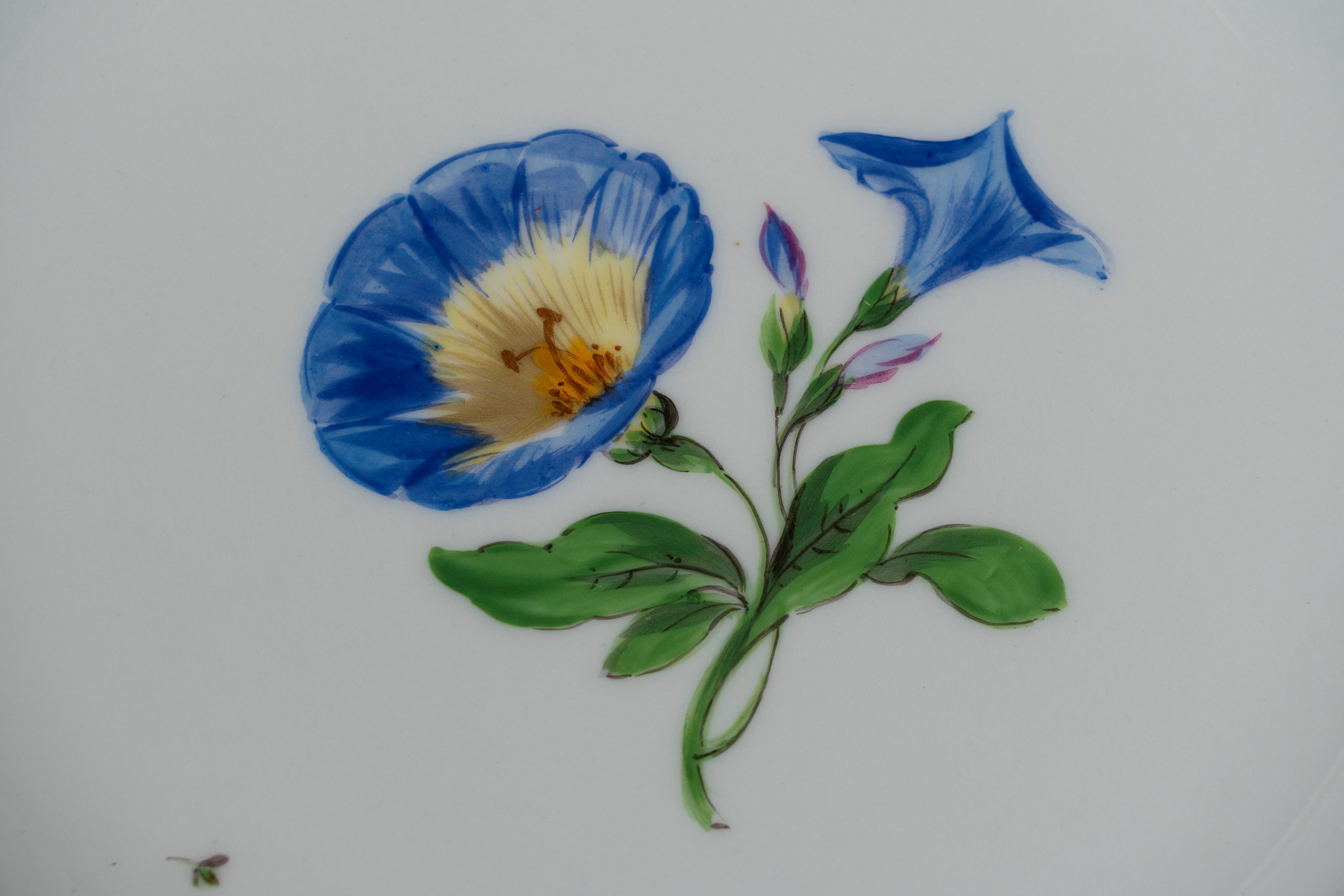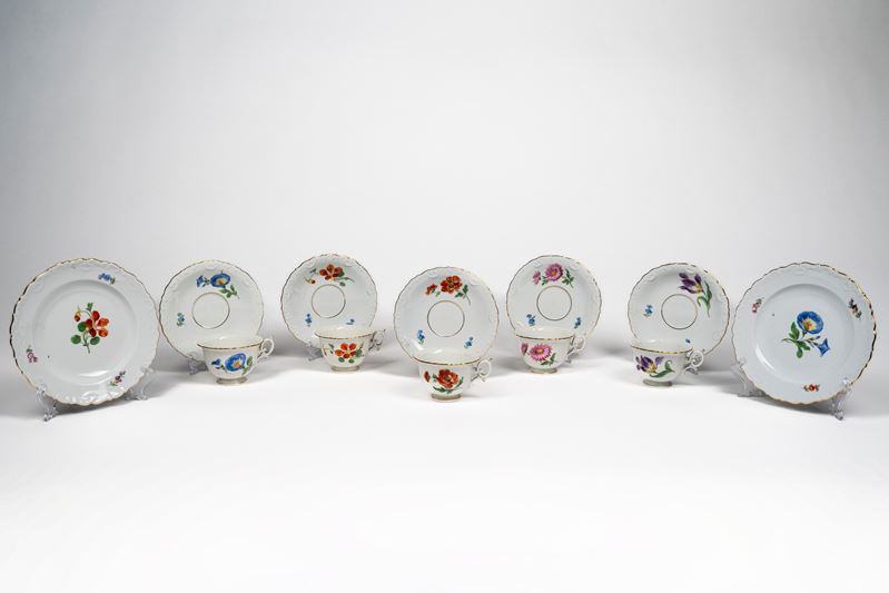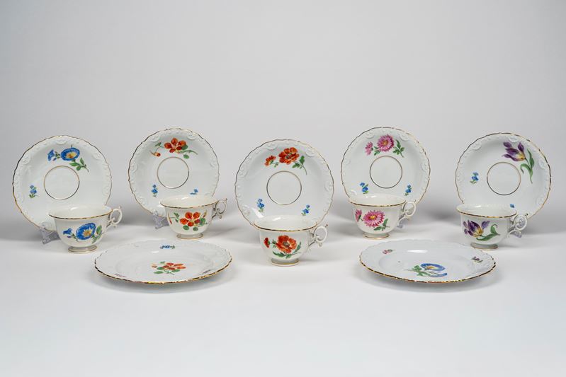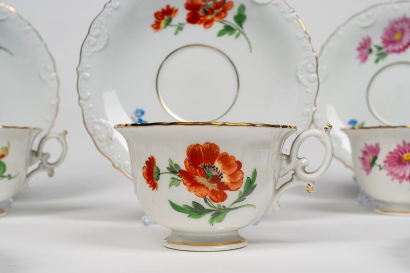 Five porcelain cups with saucers and two dessert saucers, decorated with flowers. Meissen, late 19th-20th century