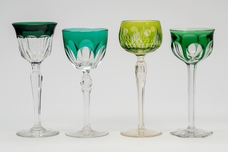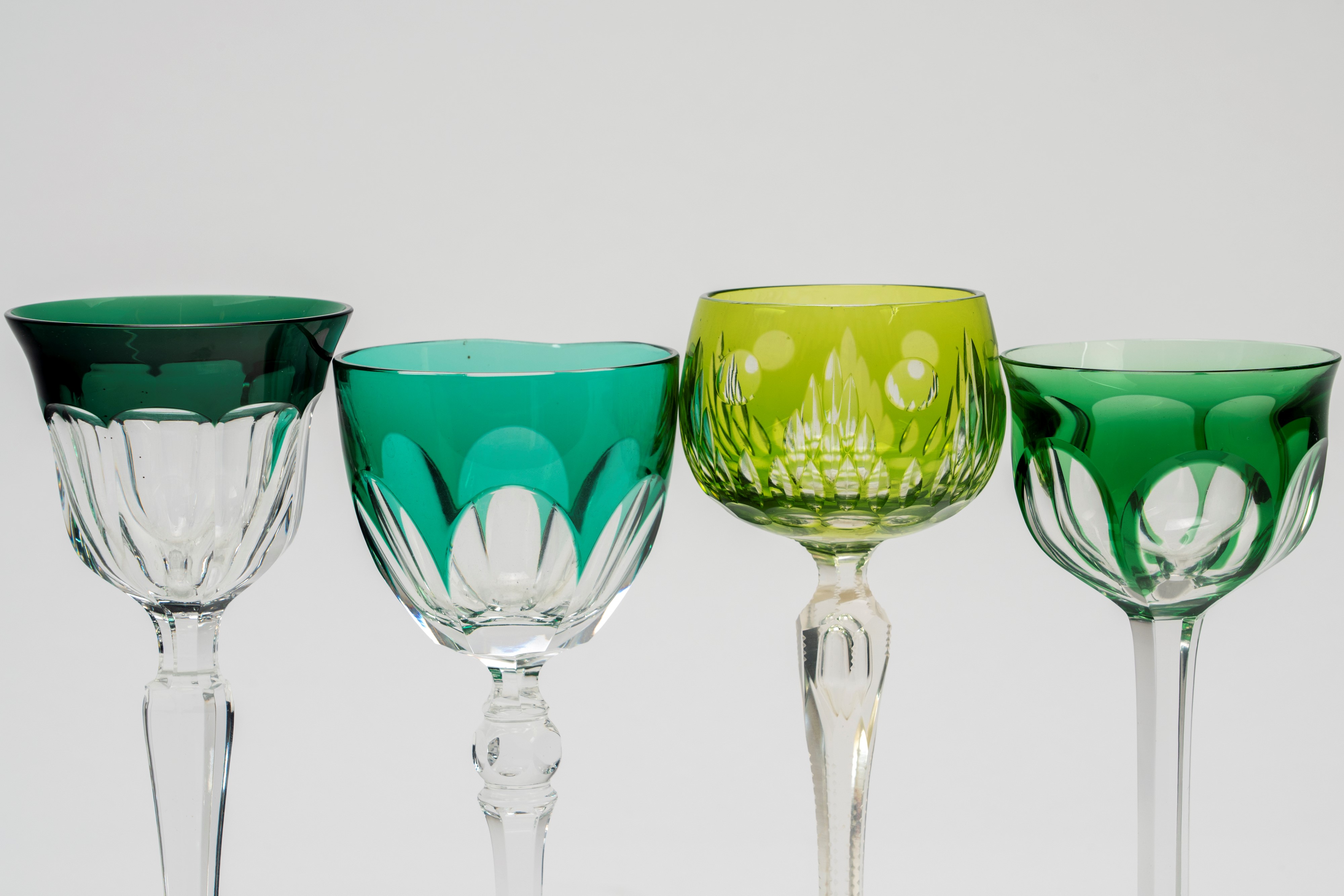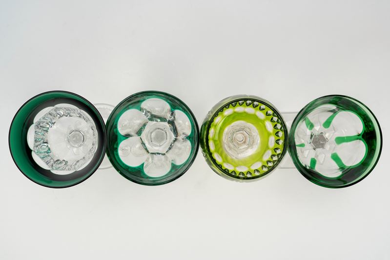 Four different glasses in clear crystal and in shades of green, three resting on a circular base and one on a hexagonal base