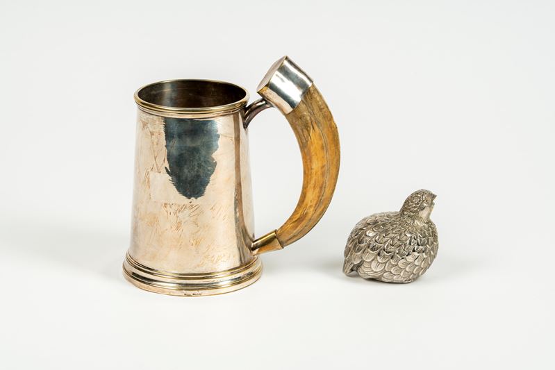 Chick-engraved, with a silver-plated metal tankard with a horn handle