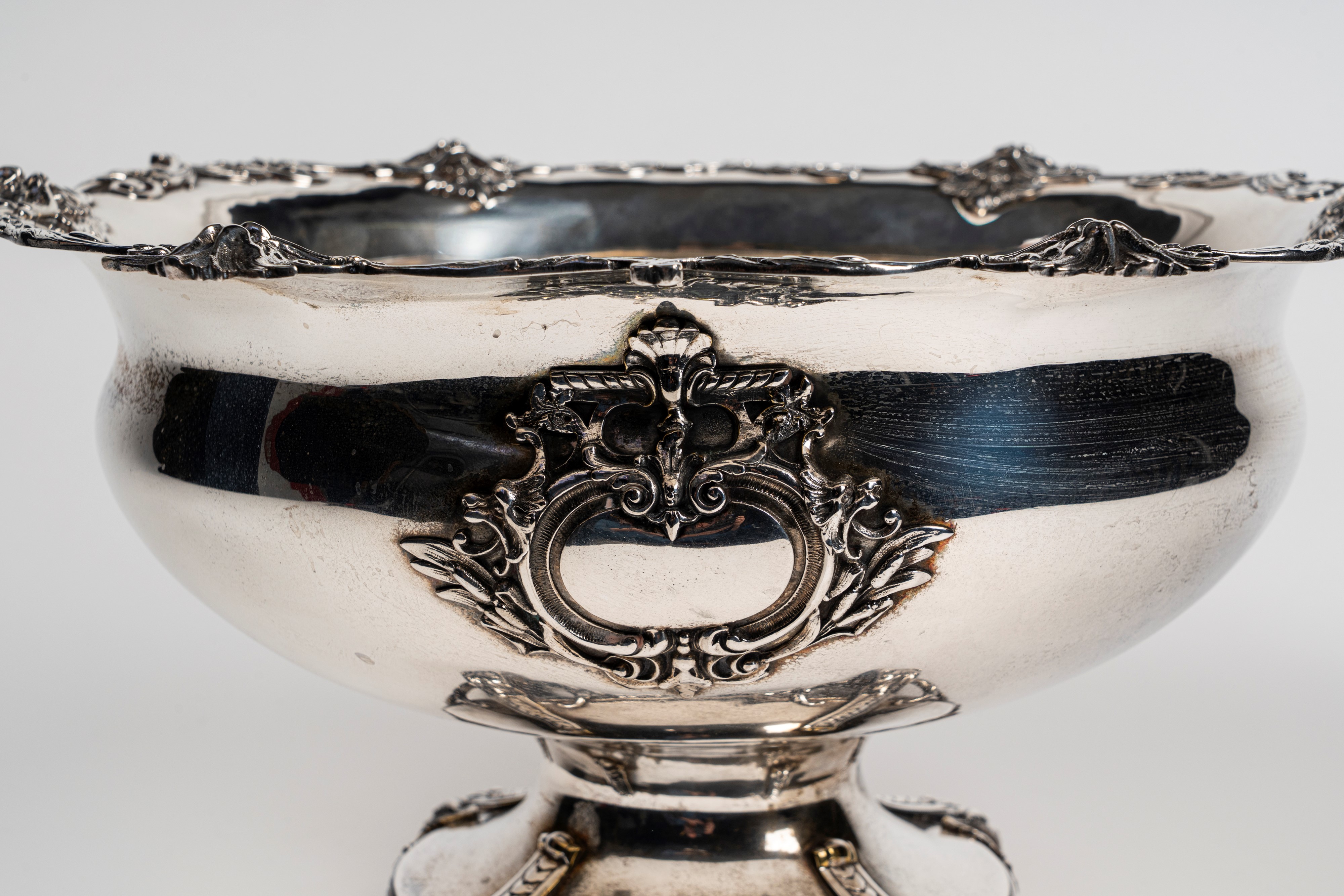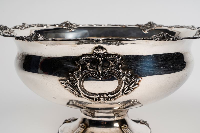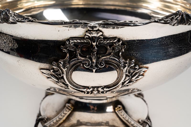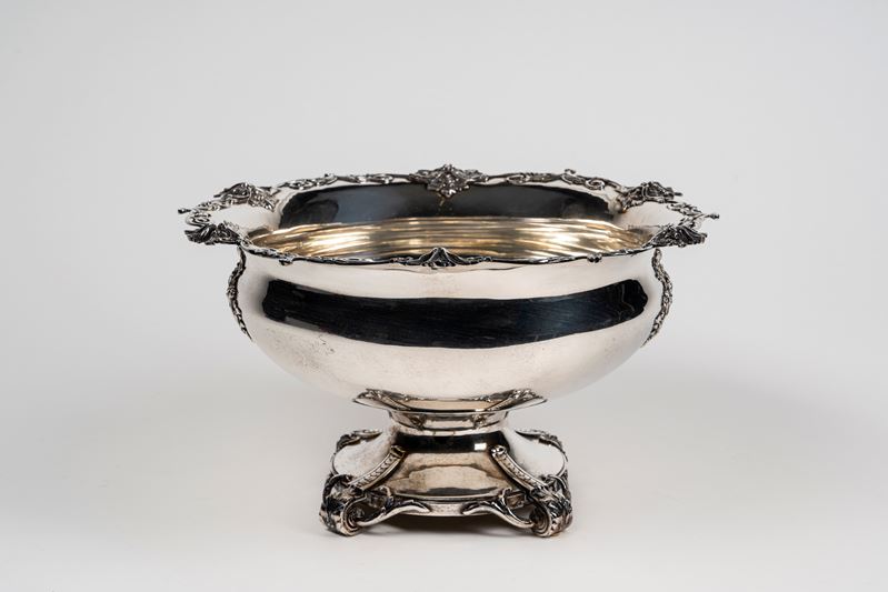 Large silver-plated metal centrepiece cup on four feet with leafy scrolls and a wavy edge with six masks and leaf swirls
