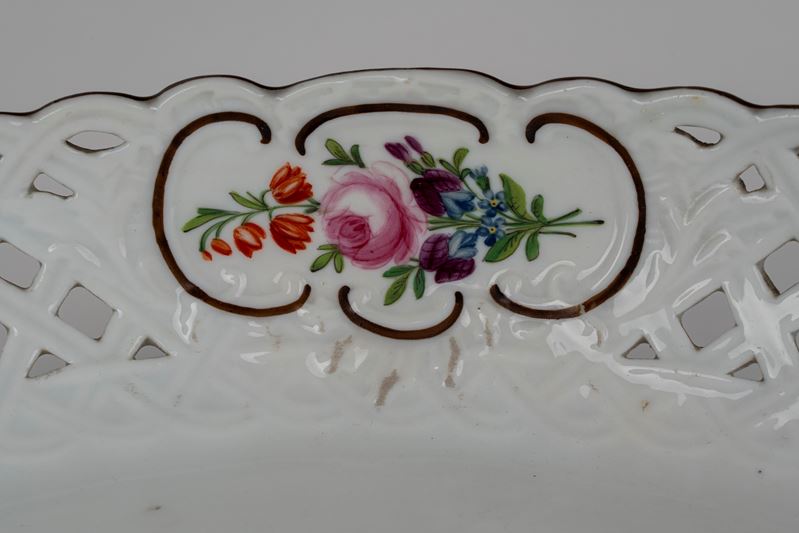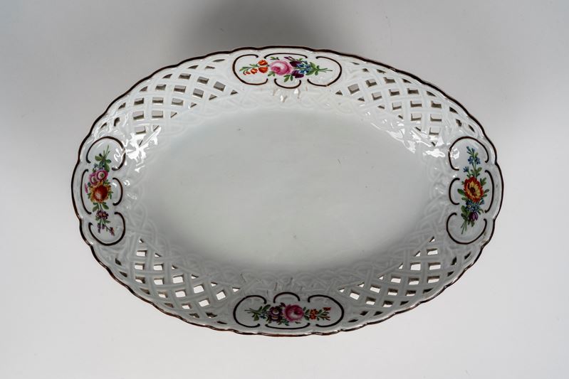 oval in shape with a perforated edge featuring geometric motifs with decorations alternating with a floral bouquet.