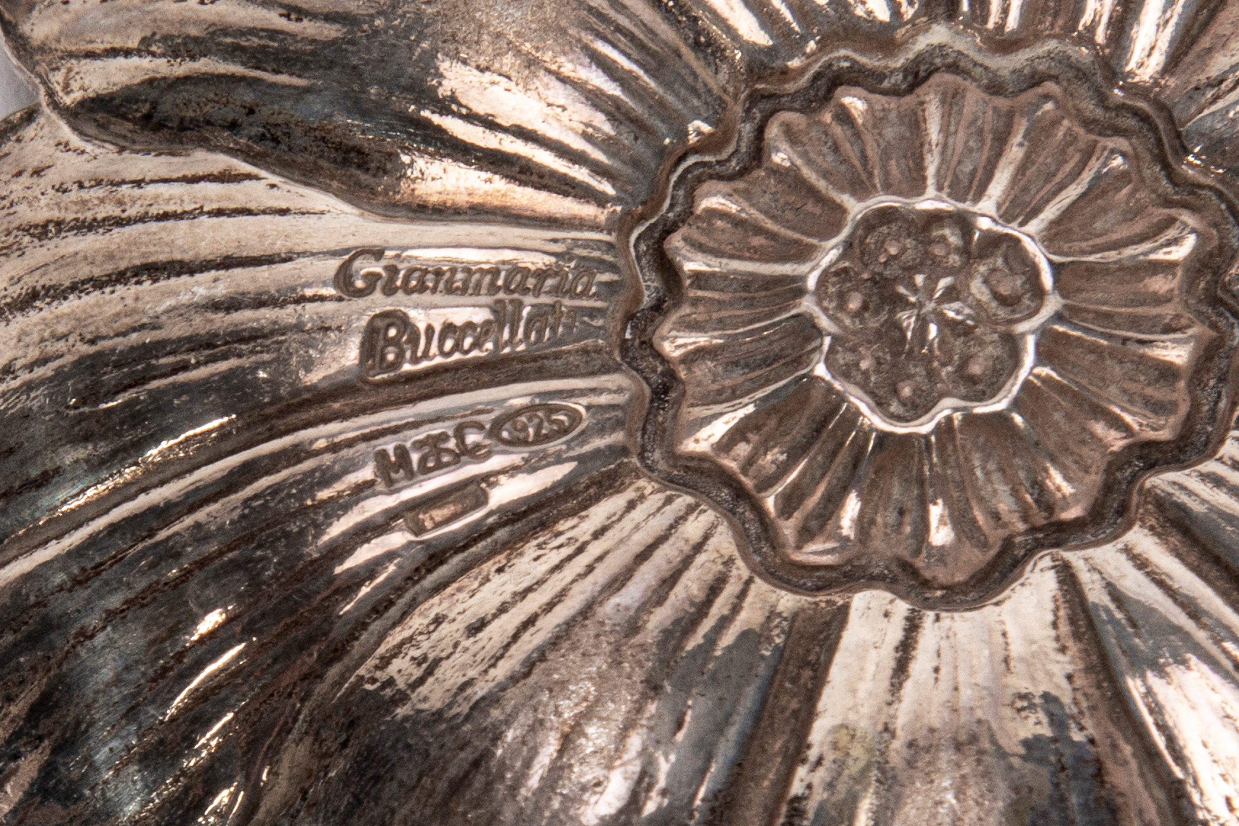 in silverthe bowls embossed in a realistic way with flowers.