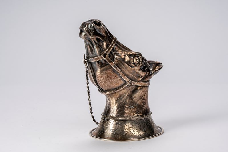 embossed horse head with finely engraved hair, edge with decorative motif decoration.