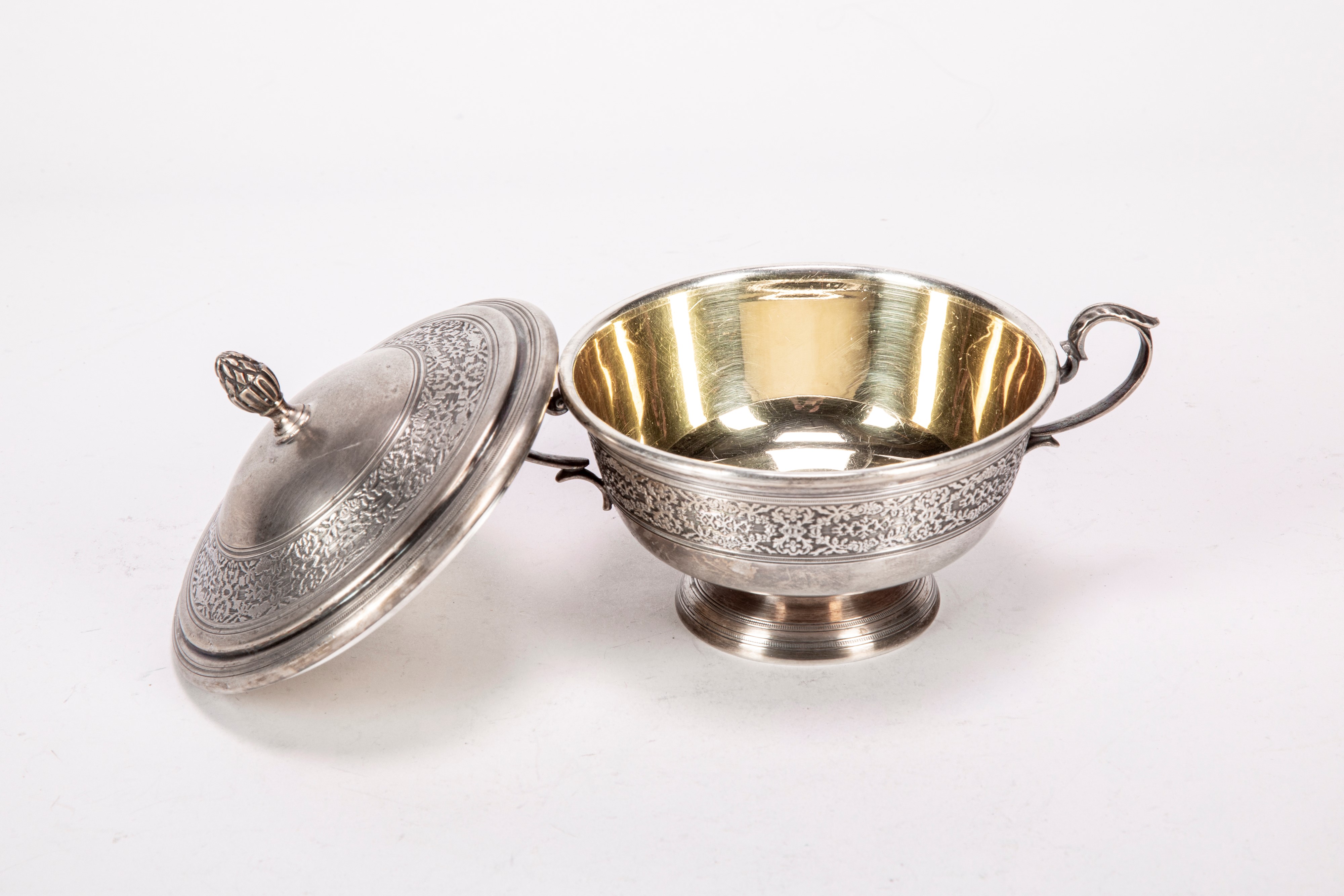 Curved side grips, rounded pine cone knob. Gilded interior.