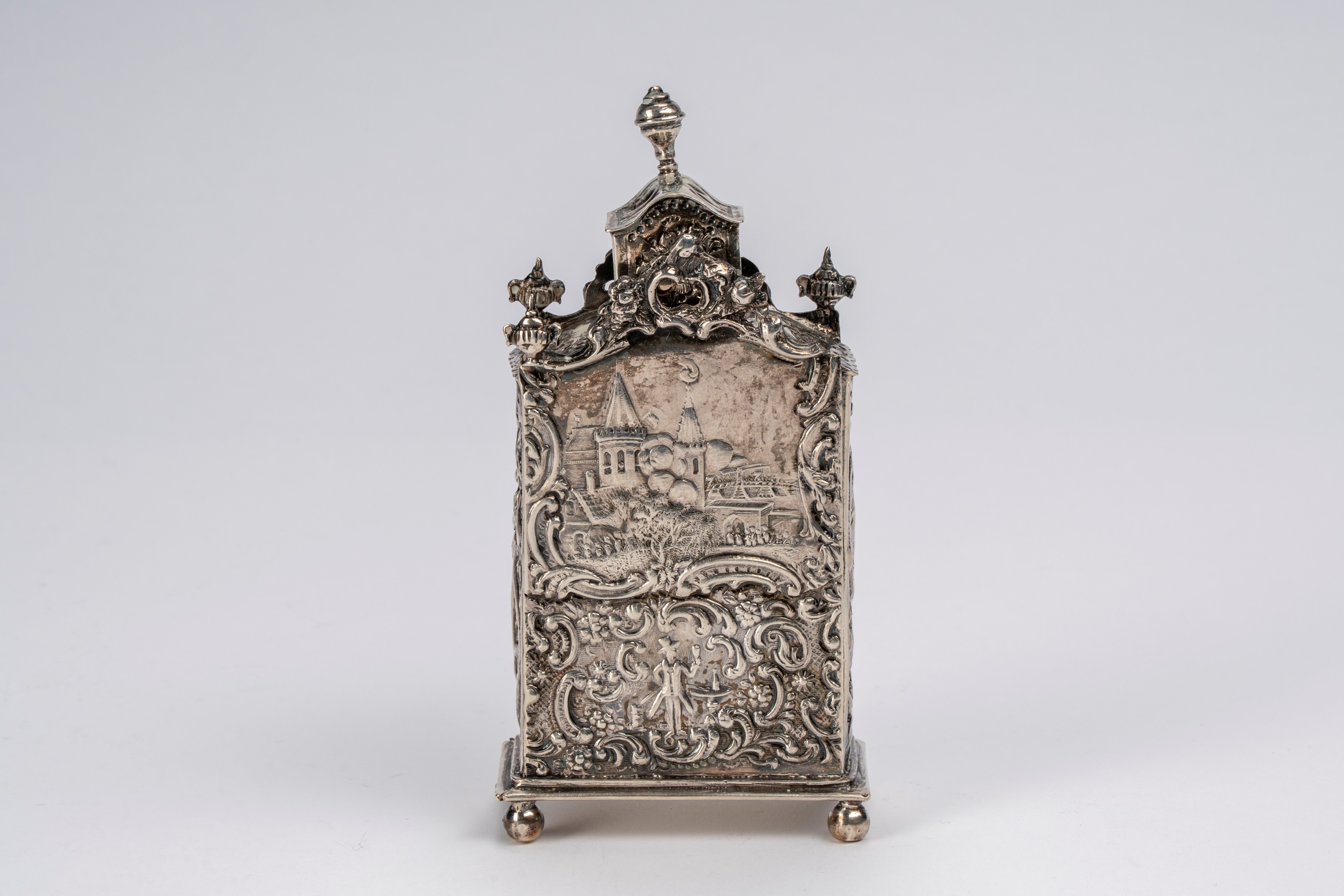 in silverwith a square body supported by four spherical feet decorated in embossed relief with scenes of life and figures within landscapes, lateral bands embossed with intertwined scrolls, square lid with turned pinnacle. (Minor defects).