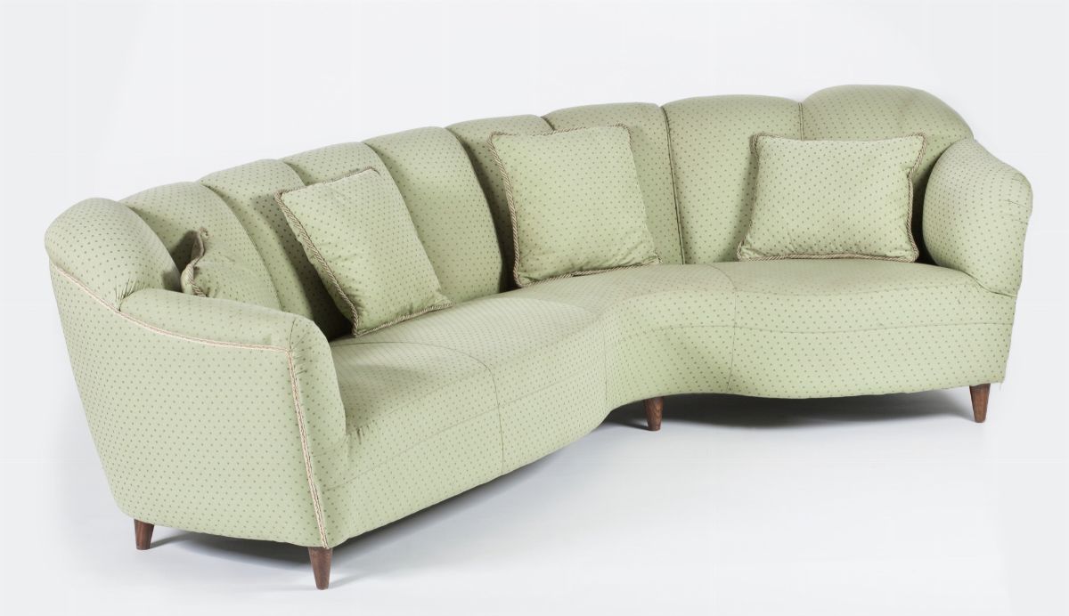 Coppia di poltrone con divano serie Casa e Giardino, struttura in legno con imbottitura e rivestimento in tessuto di colore verde chiaro, quattro cuscini con tessuto originale. Divano a sei piedi leggermente curvato.