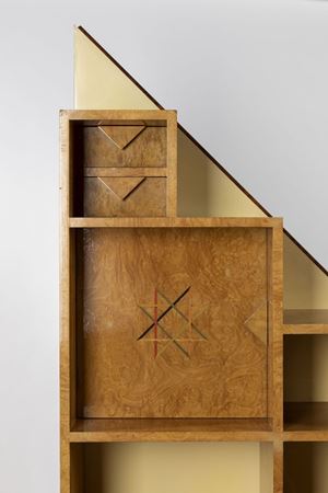 ash wood bookcase with stained wood inlaid geometric designs.
