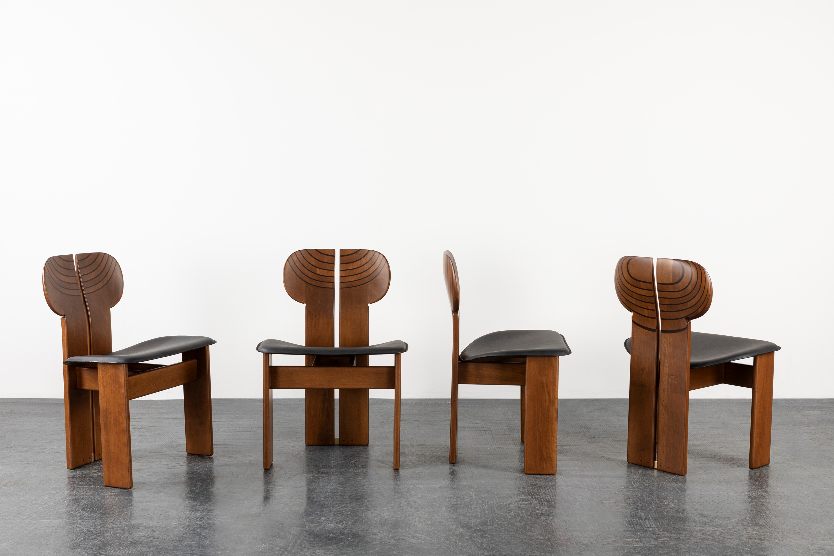 Chairs with wooden structure and seat in curved plywood covered in leather.