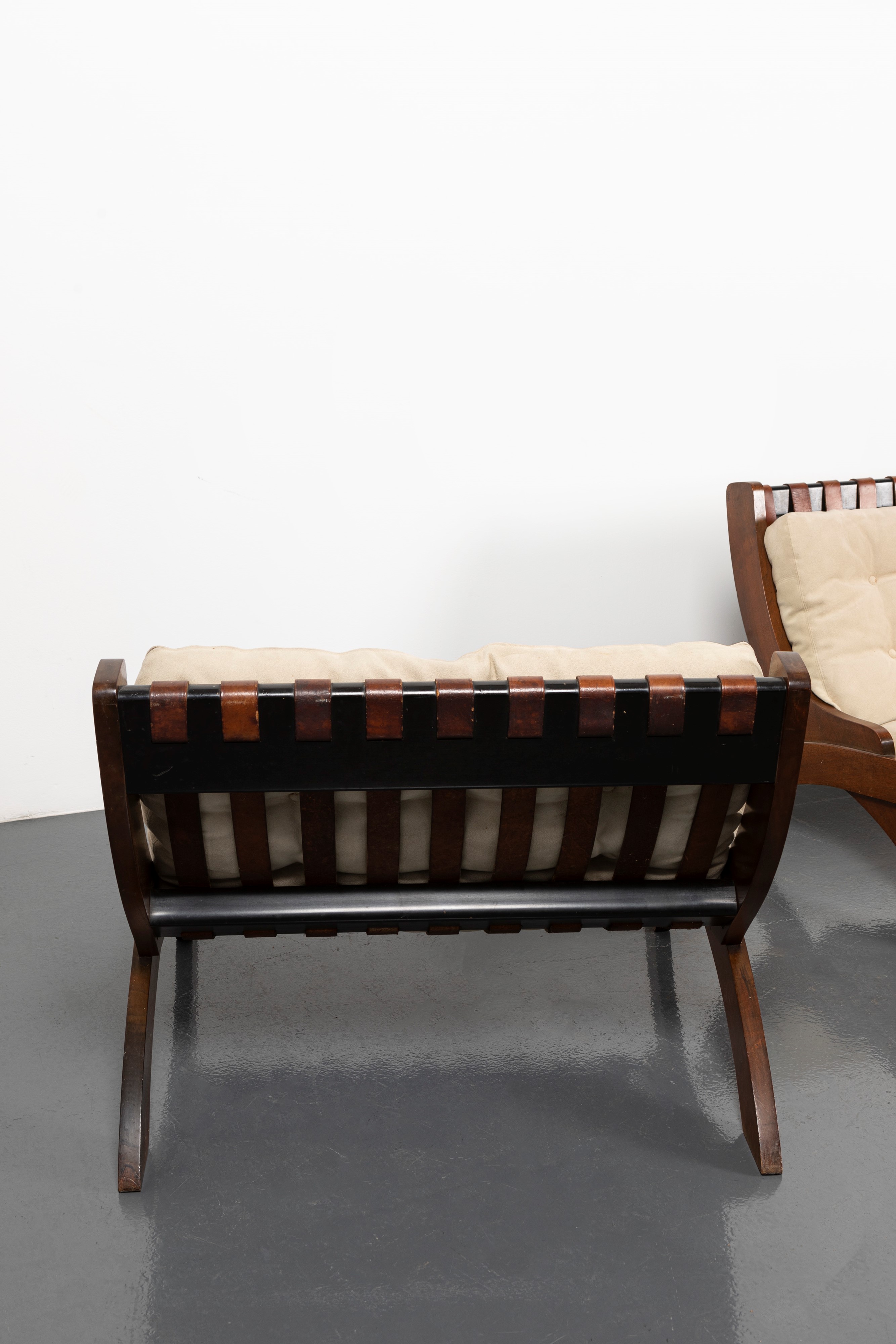 CP1 model, composed of sofa and armchair with wooden structure, leather strips and fabric covering.
