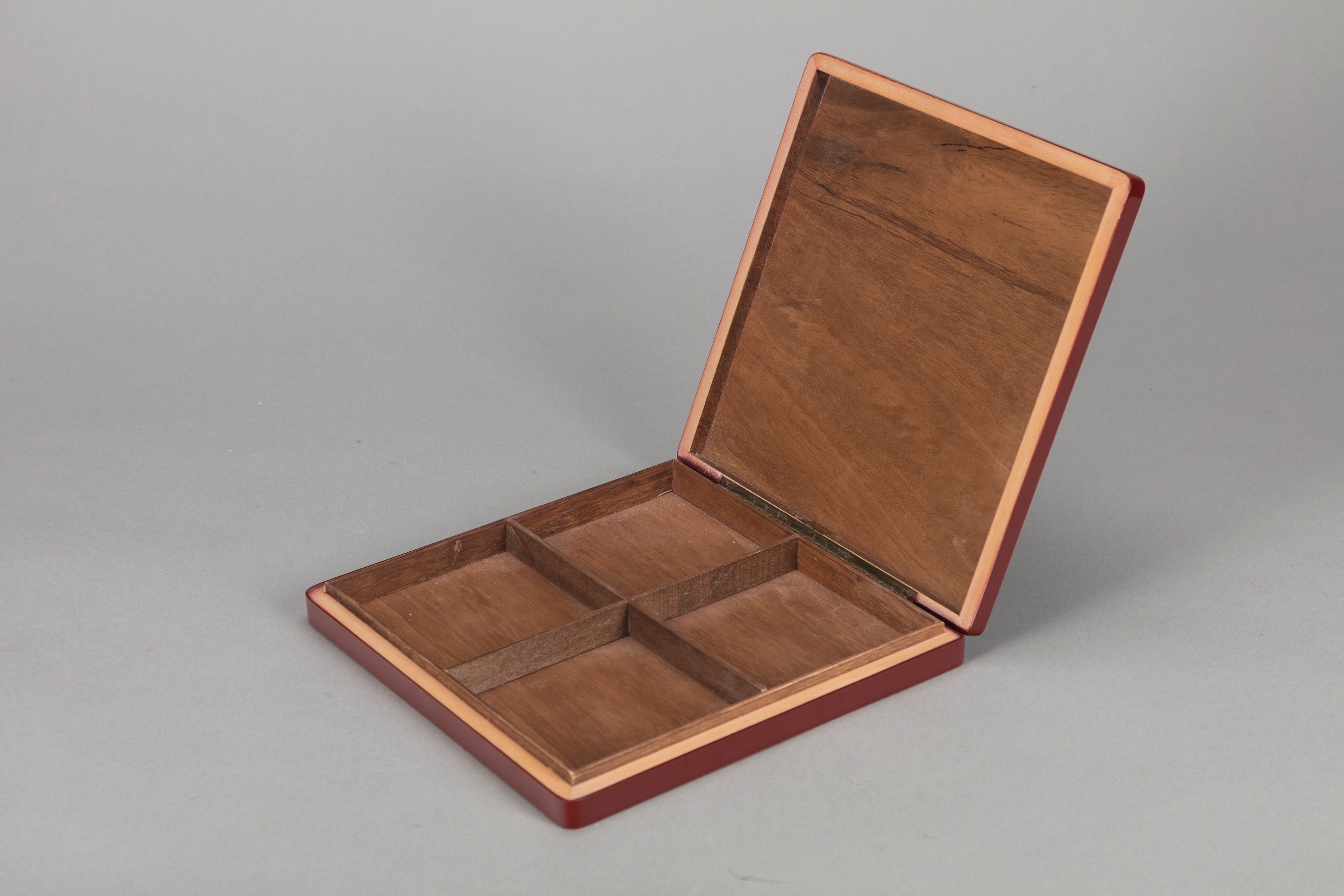in burgundy lacquered wood with polished brass coat of arms