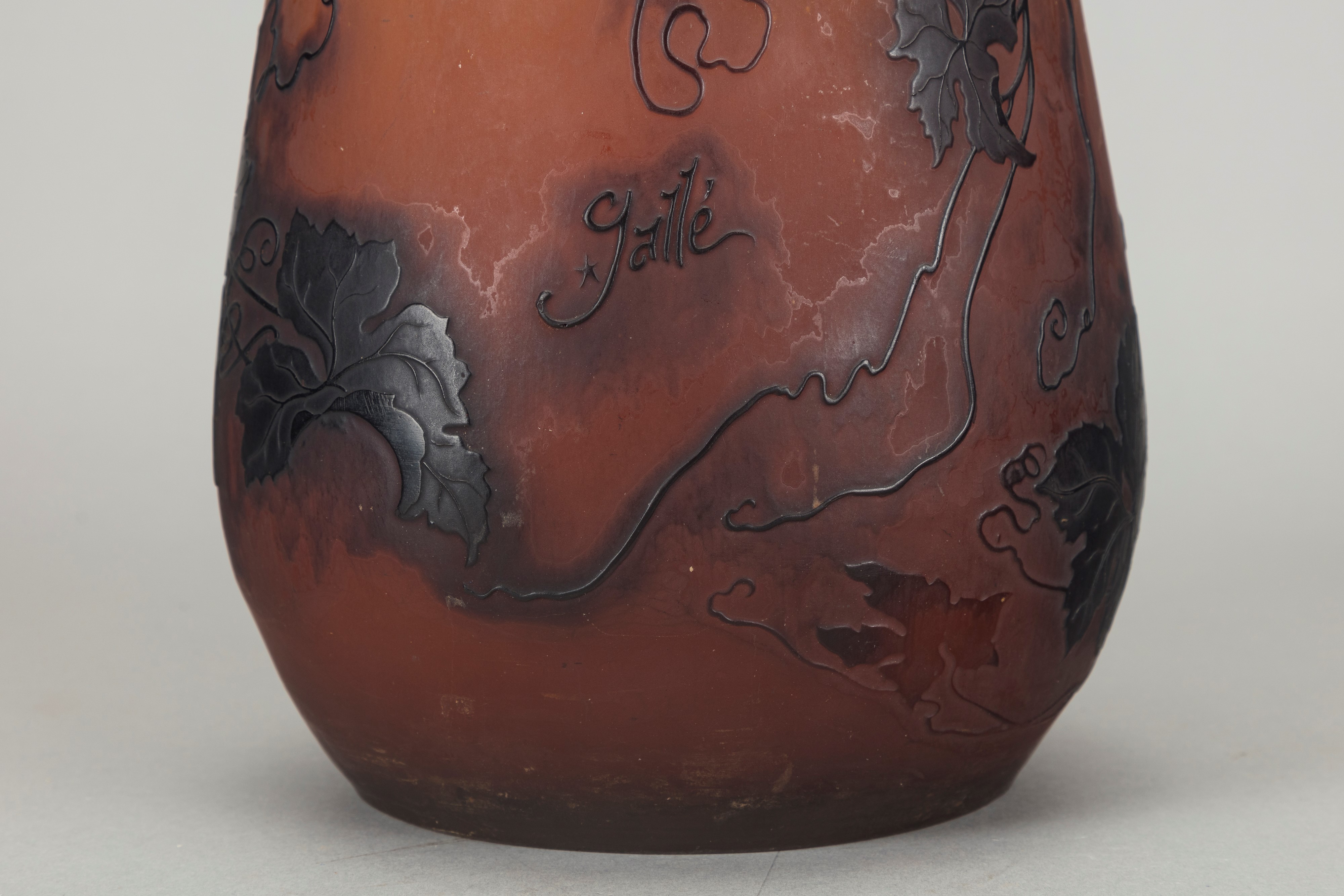 multilayer cameo glass, climbing vine shoots and bunches of grapes decoration.