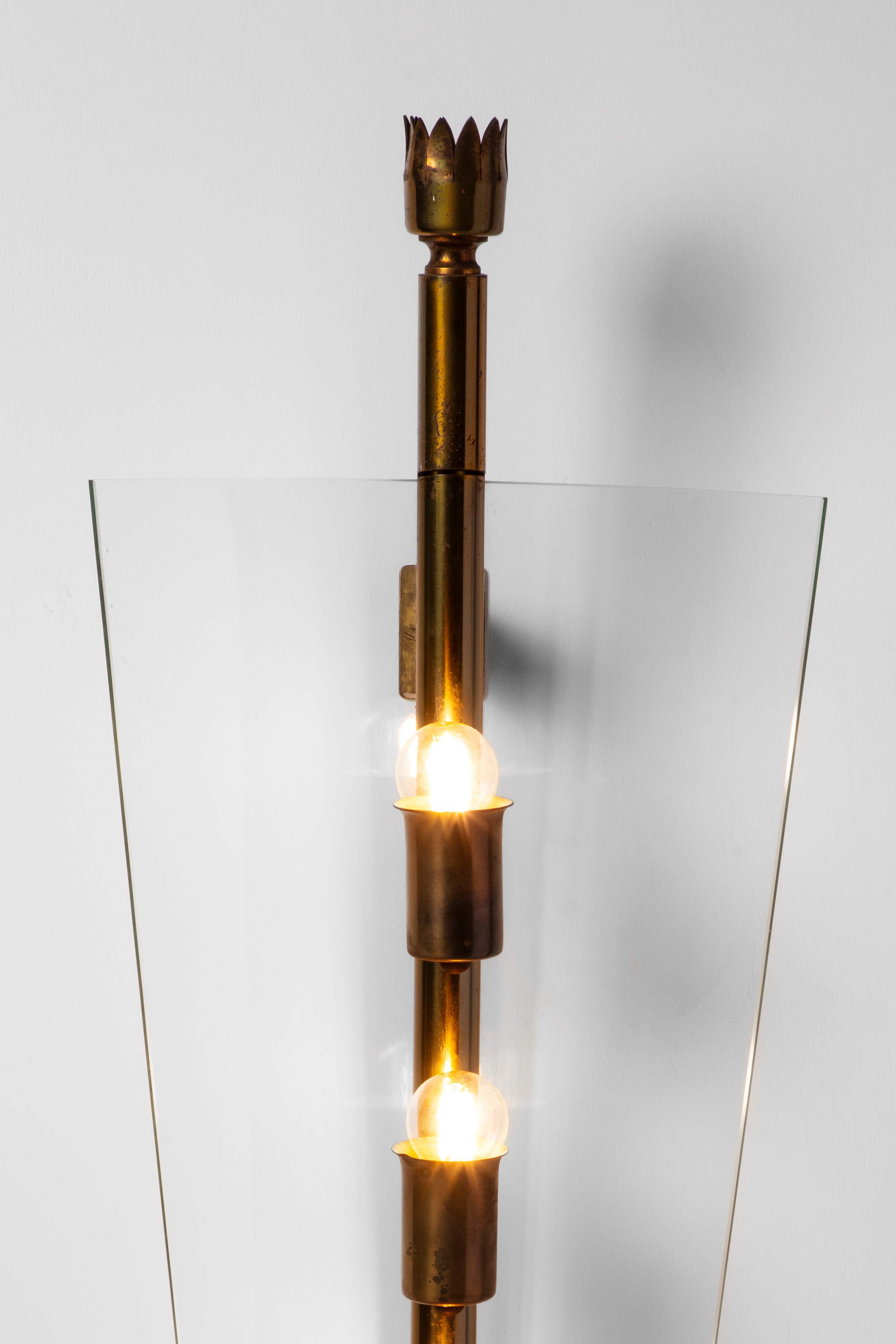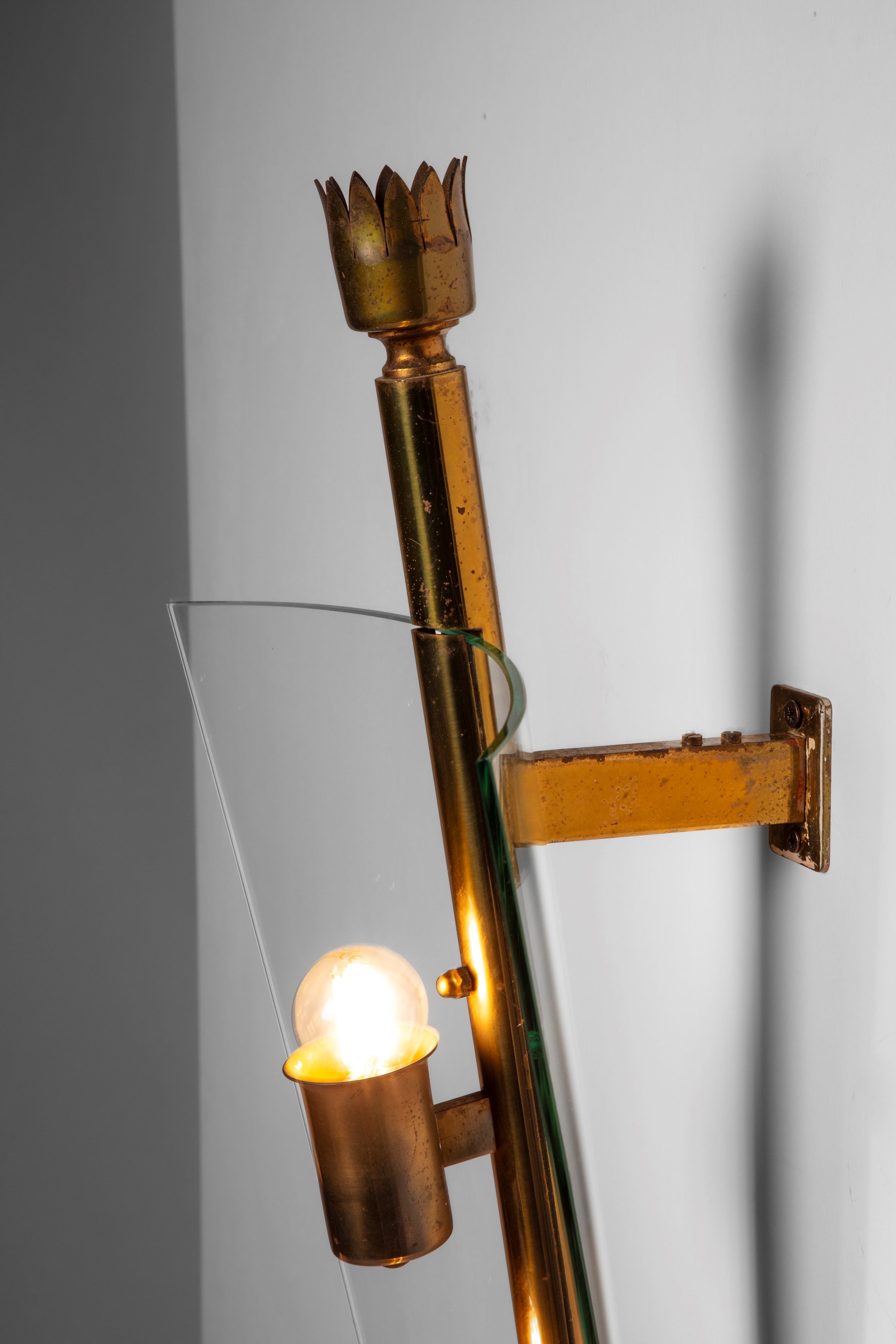 This rare model of wall lamp called Lancia for the spear-shaped form of the brass structure, was selected by Gio Ponti in 1939 to be part of the project of Palazzo Liviano, head office of the University of Padua, Italy.