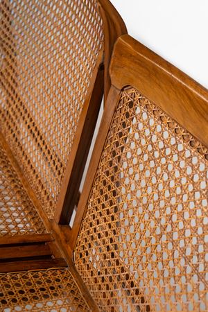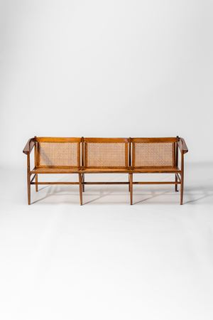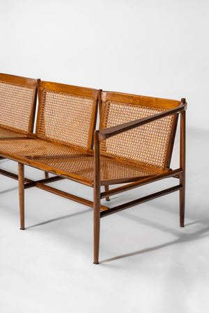 Rare three-seater sofa in solid wood, backrest and seat in cane