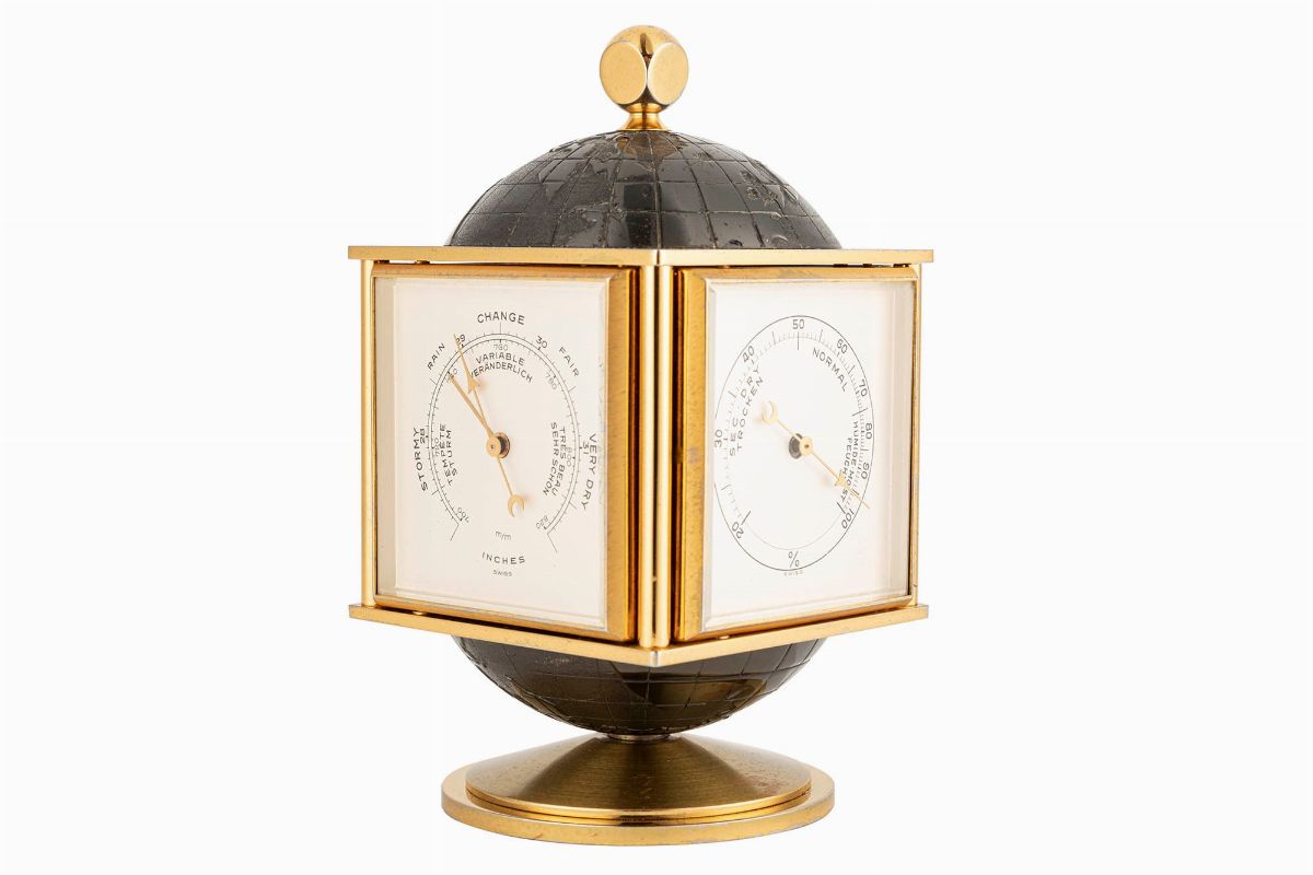 Gilded brass and black acrylic cubic case, with upper and lower side in the shape of a globe.Argenté dials, primary dial retailed by Bucherer, applied arabic numerals and indexes.Hand-winding movement.Size: 9 x 9 x 16.5 cm.
