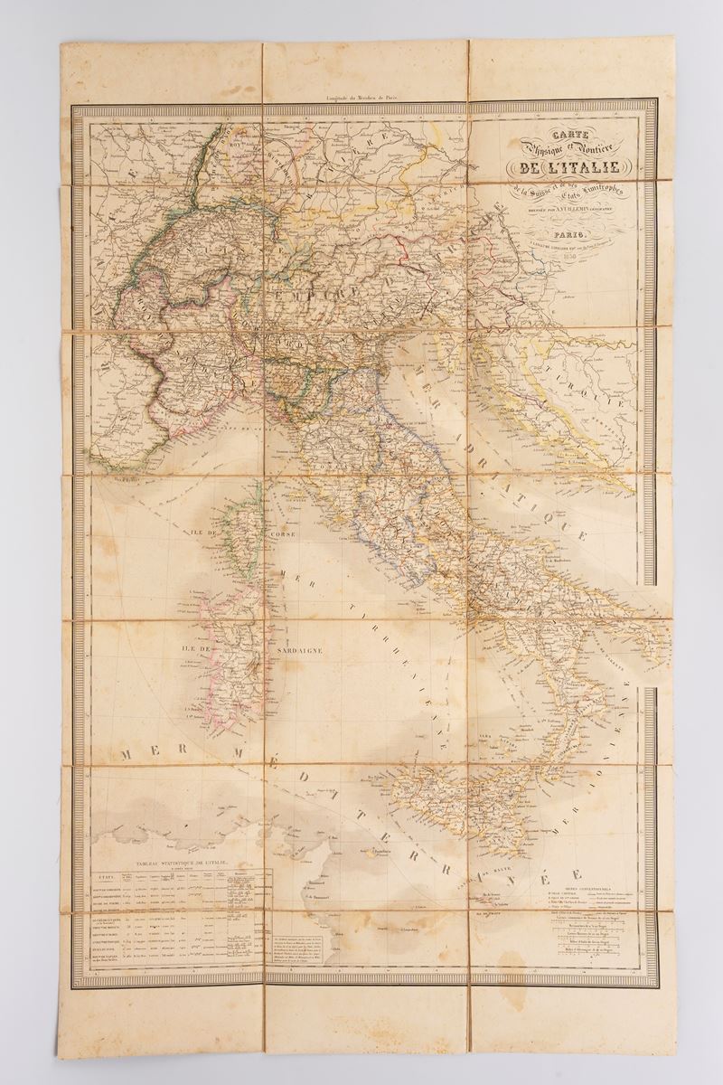 Paris, J. Langlumé Libraire Ed., 1850. 87x52.5 cm. Lithograph with contemporary coloring applied to canvas and folded several times, some stains.