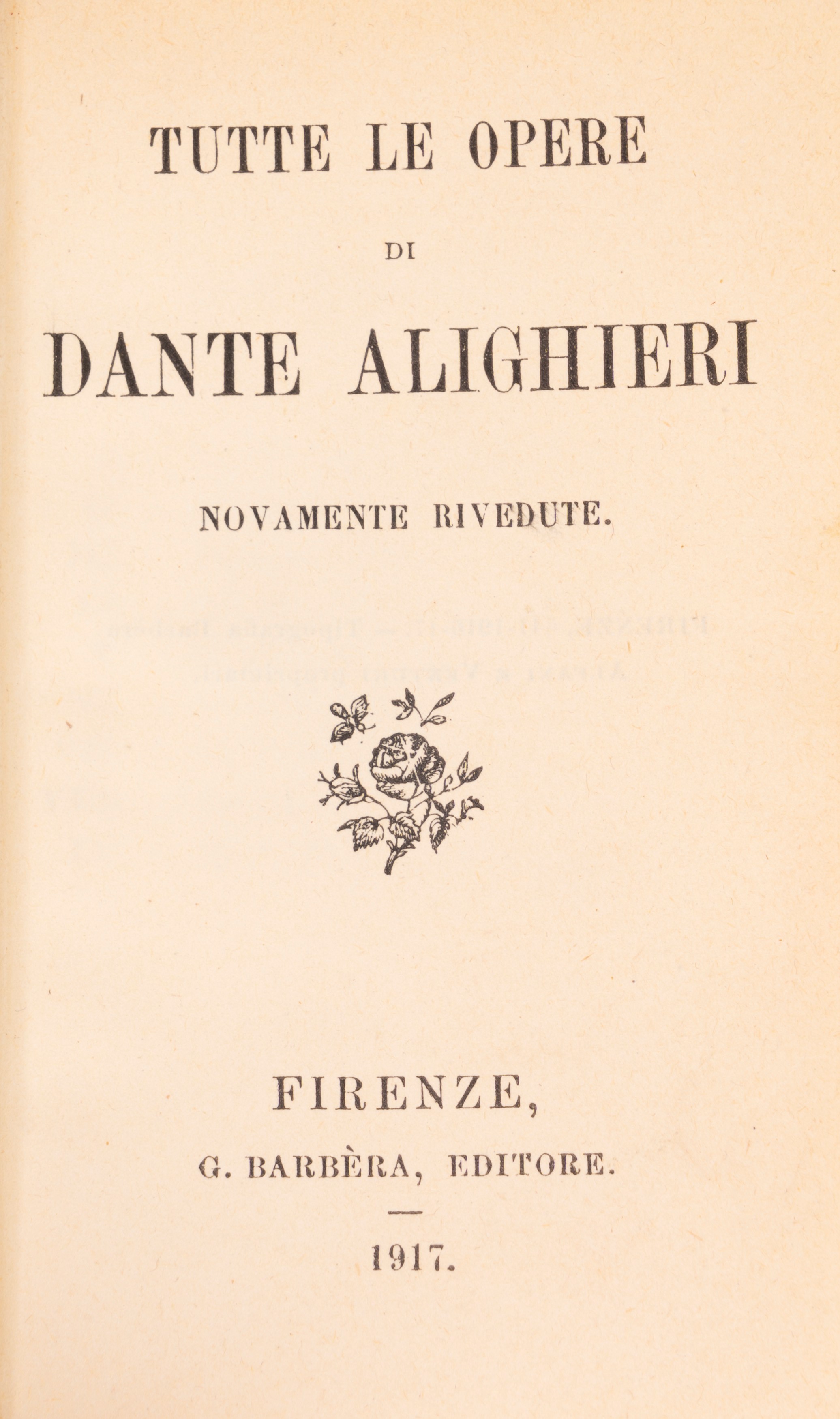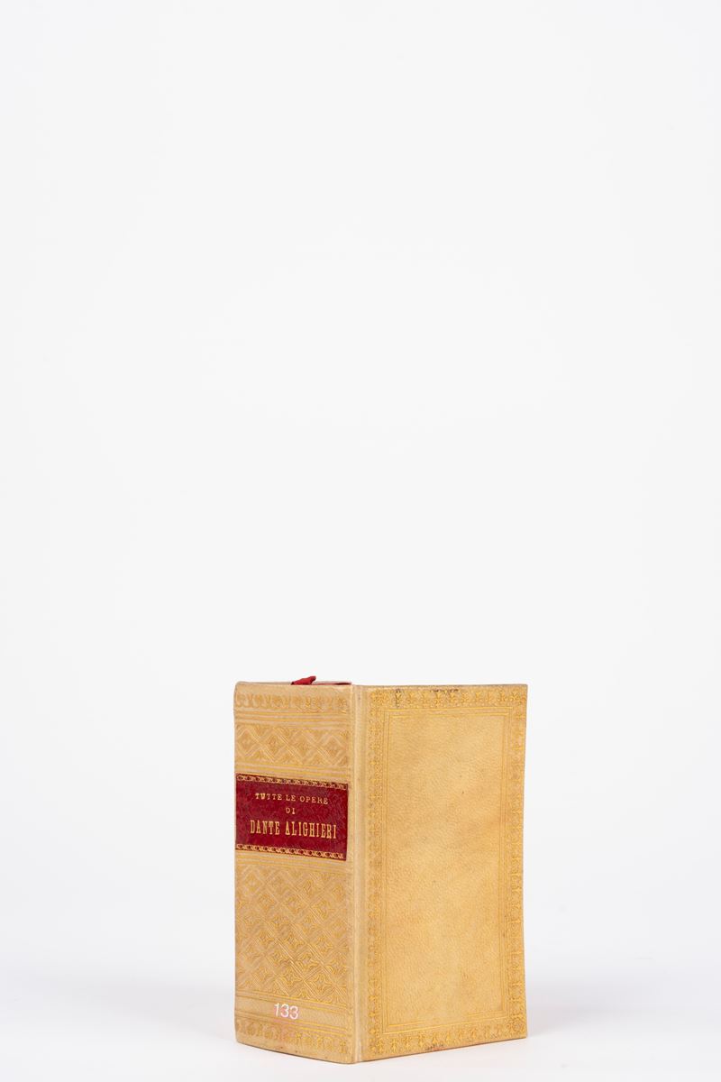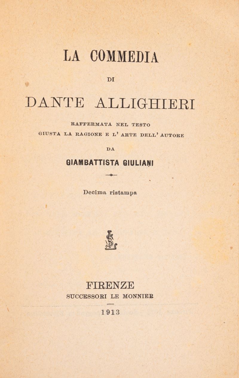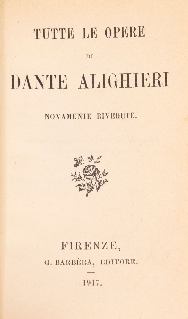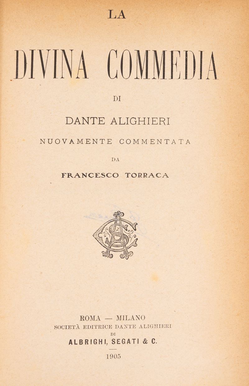 Rome-Milan, Società Editrice Dante Alighieri di Albrighi, Segati & C., 1905. 3 volumes. Publisher's mark on the title page, handwritten notes in pencil in the text. Burgundy half-leather binding, gold title and decorations on the smooth spine. § Together in the lot: The Divine Comedy by Dante Alighieri with commentary by T. Casini , Florence, GC Casoni, Editore, 1899. Black chagrin binding, defects and losses. § The Comedy by Dante Alighieri , Florence Successori Le Monnier, 1913. Editorial paperback, restored spine. § All the works of Dante Alighieri , Florence, G. Barbera Editore, 1917. Parchment binding, boards framed in gold, gold title and decorations impressed on the spine, red edges. § The Divine Comedy by Dante Alighieri with Fraticelli's commentary , G. Barbera, Editore - Florence, 1920. Inside three plates, one of which is folded with a small tear without loss and a tear without loss on page 401. Editorial paperback in blue paper with title within a frame decorated with plant motifs, restored spine.