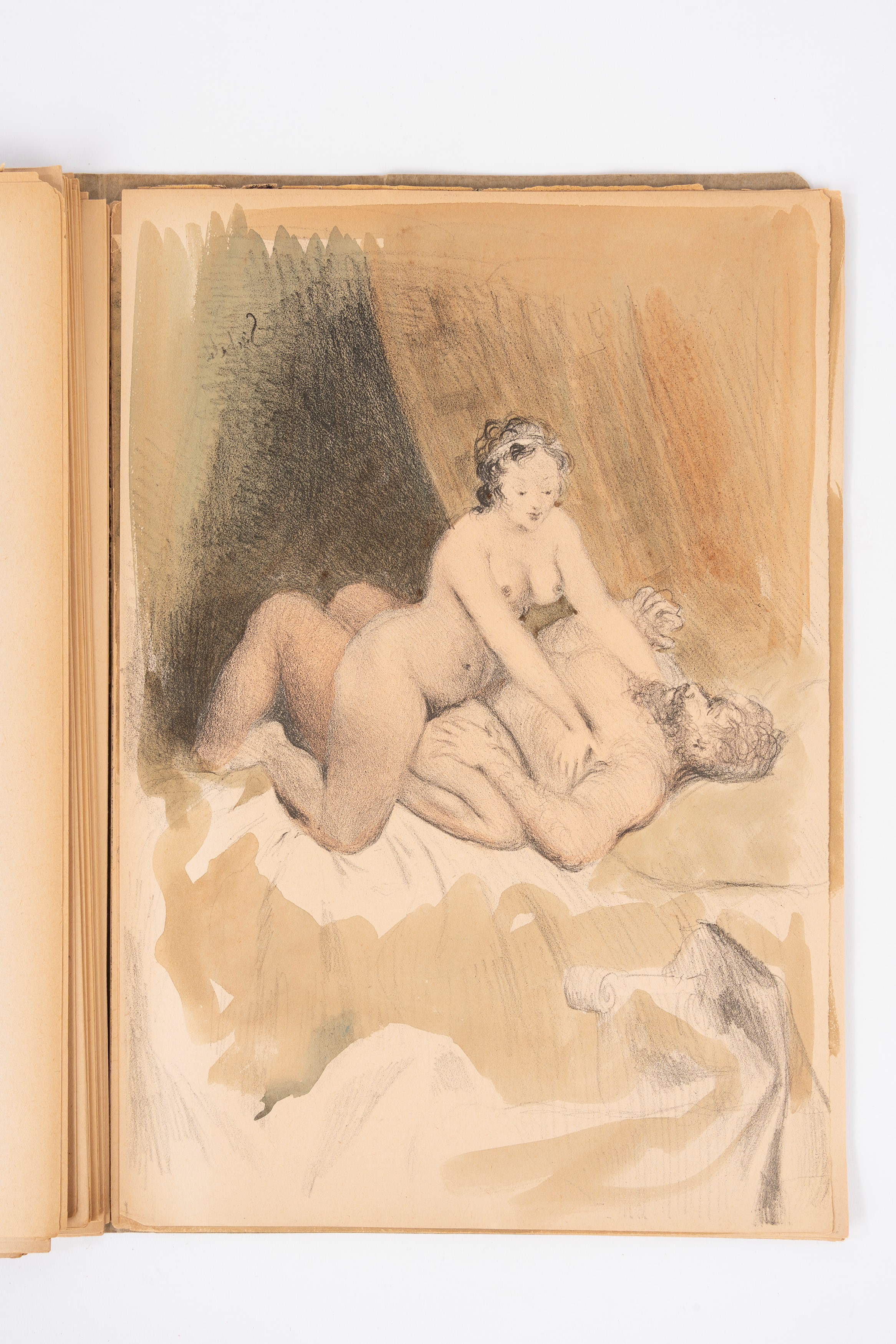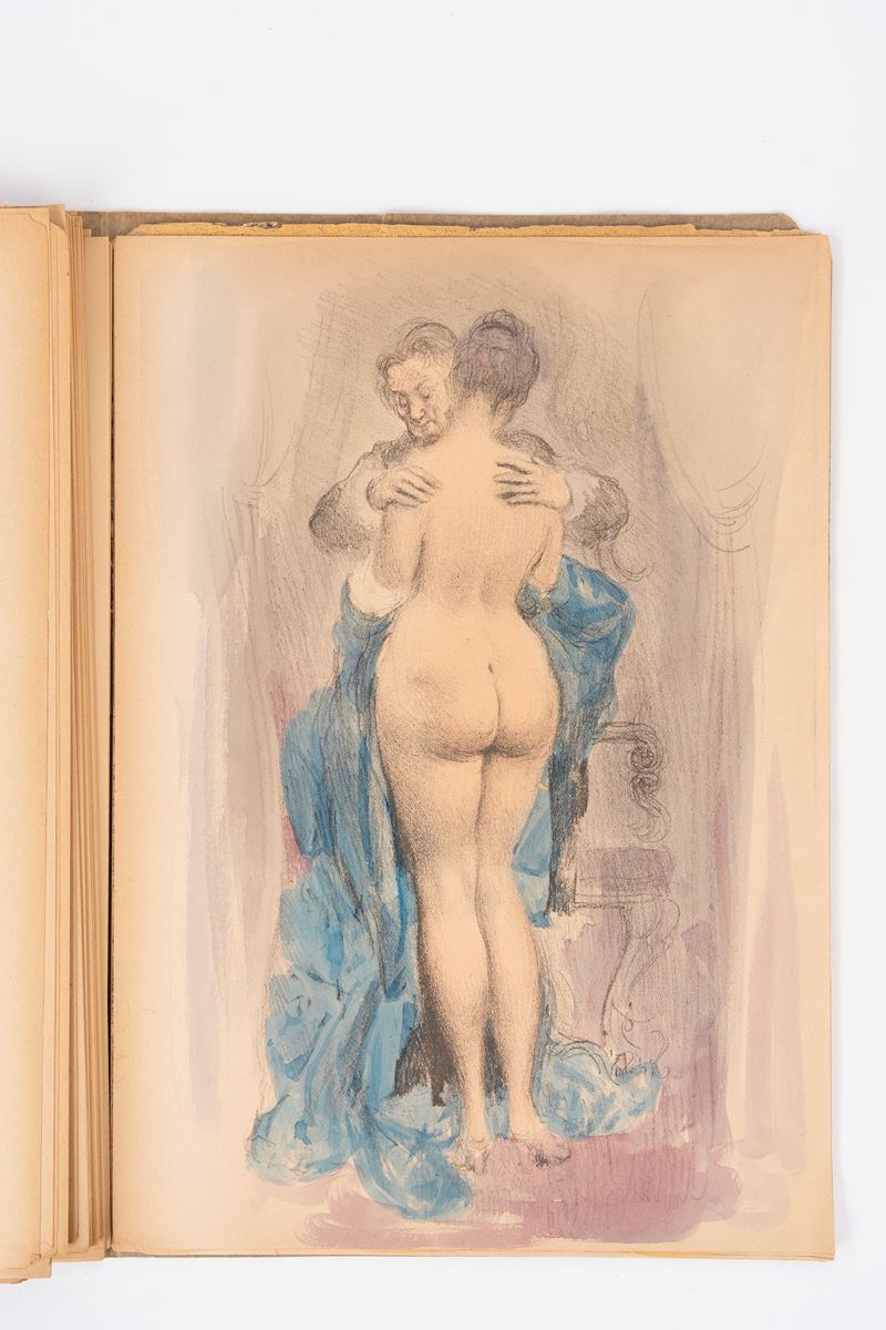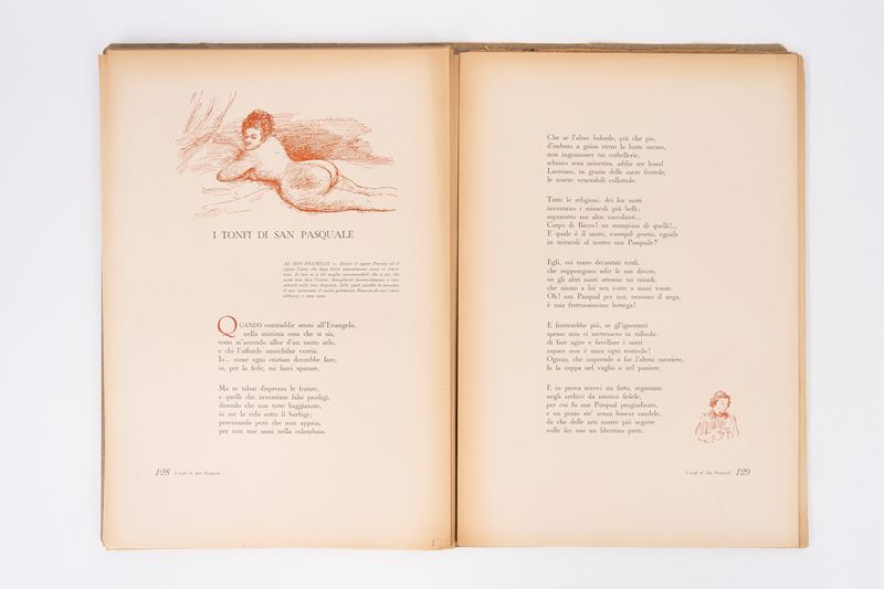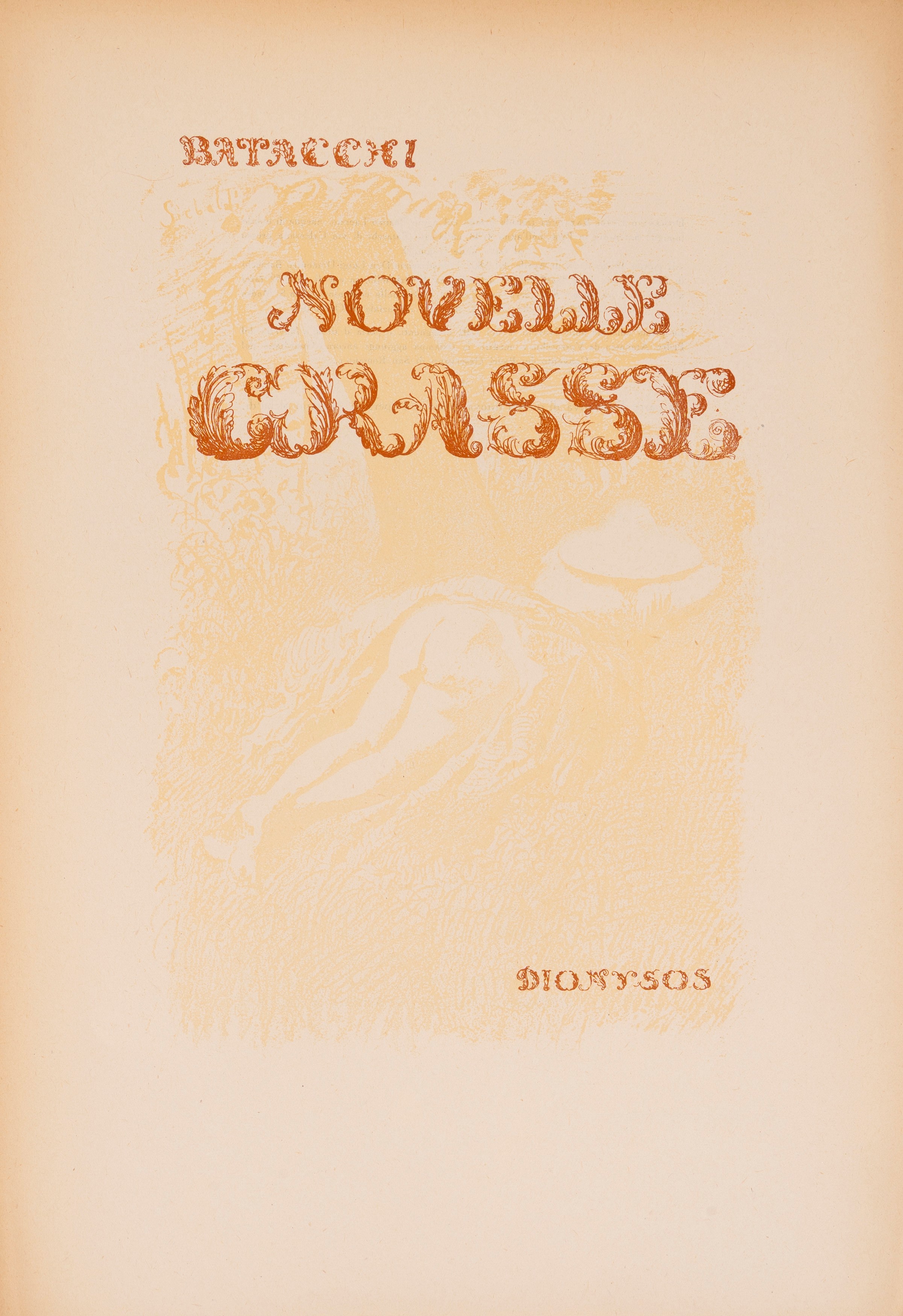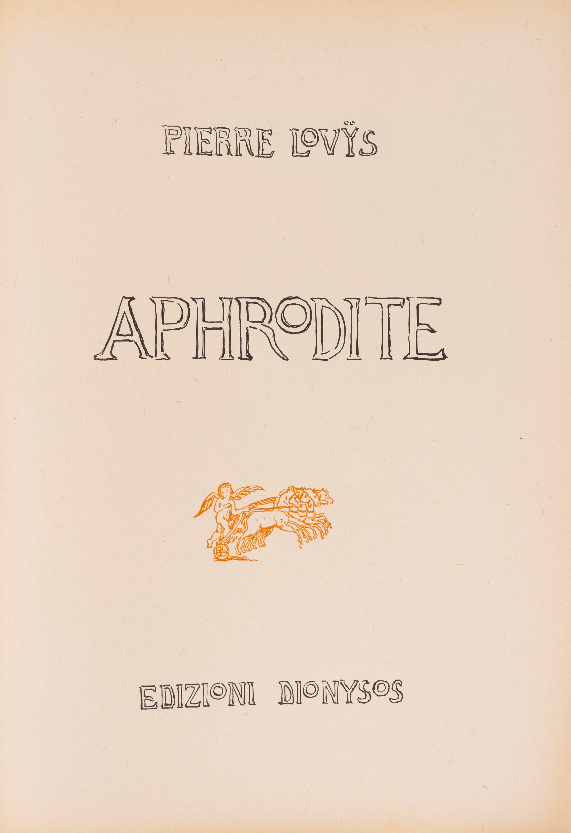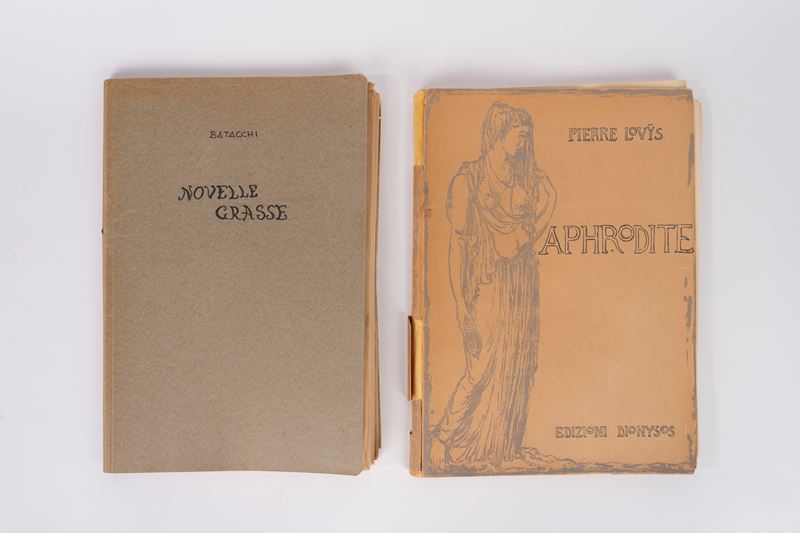 Turin, Dionysos - editore Vogliotti, 30 June 1948. Copy 29/296 common, enriched with 16 plates outside the text (lithographs) by the artist Adriano Sicbaldi, the images depict licentious and erotic scenes in keeping with the satirical and "fat" tone of Batacchi's stories, very fragile paper, untouched copy. § Pierre Louys. Aphrodite . Turin, Dionysos - editore Vogliotti, 30 June 1948. Copy 7/299 common, enriched with twelve plates outside the text painted in watercolor by the painter Gariazzo, all Pierre Louys. Aphrodite. Original, with tears and defects.