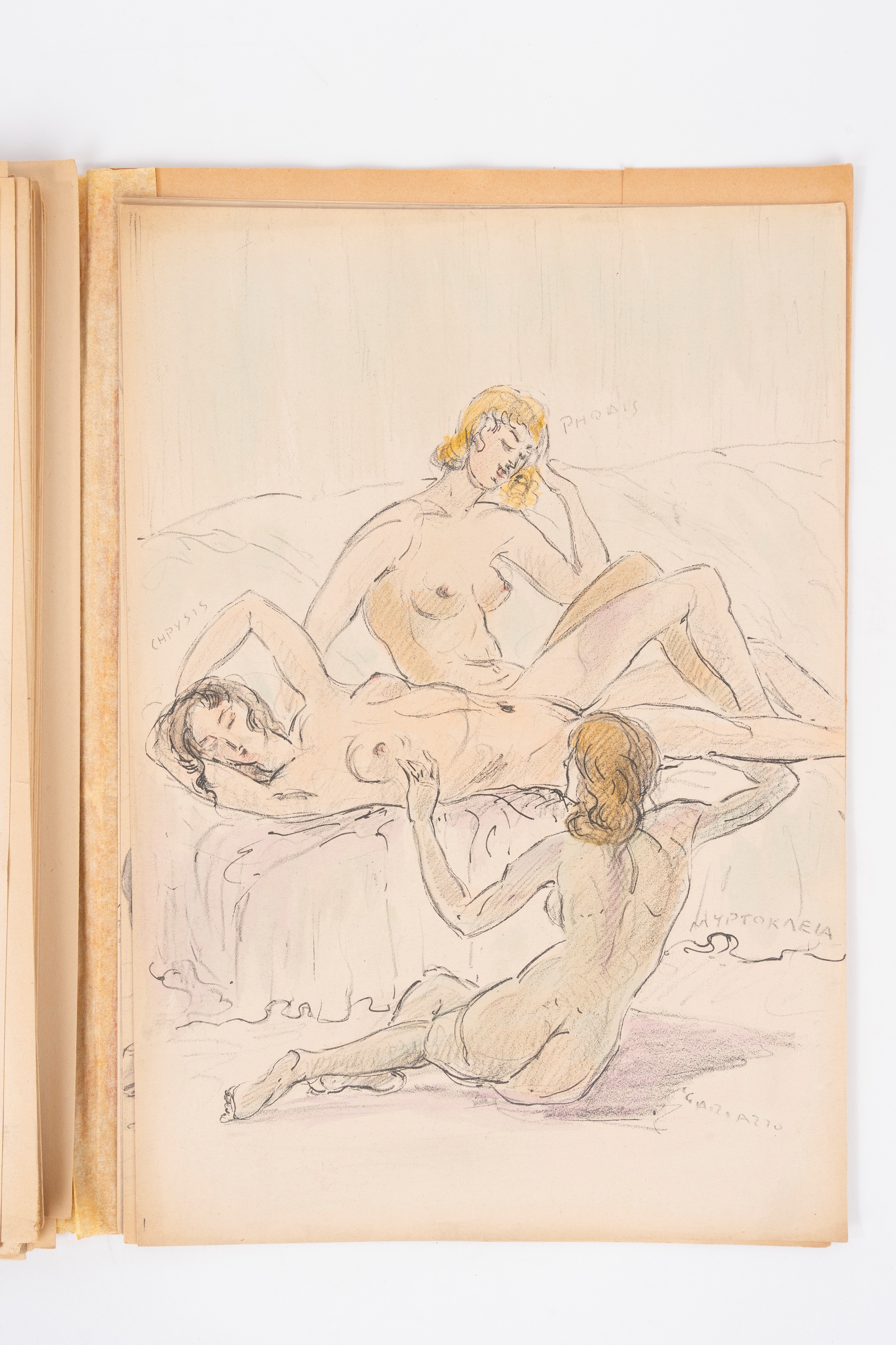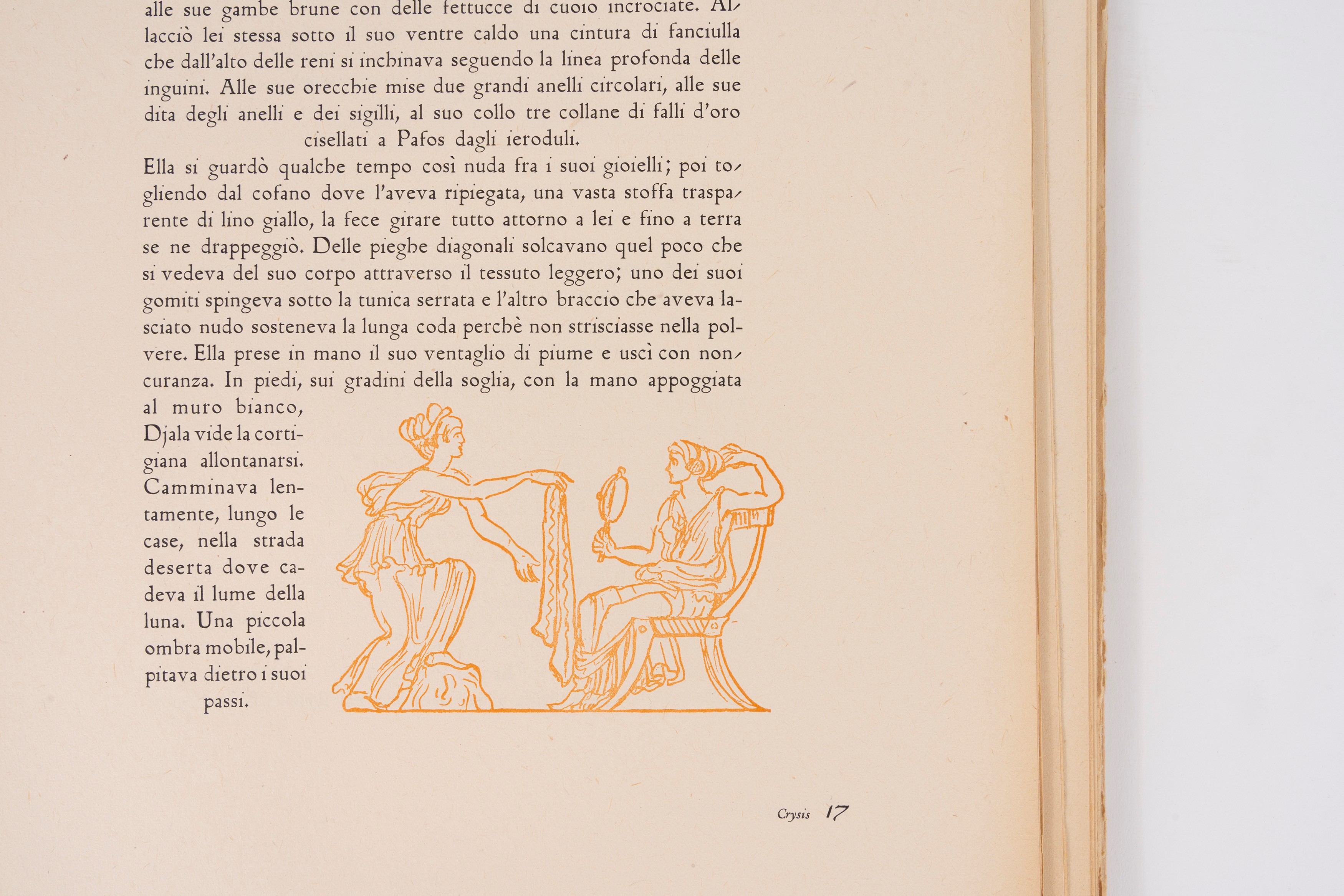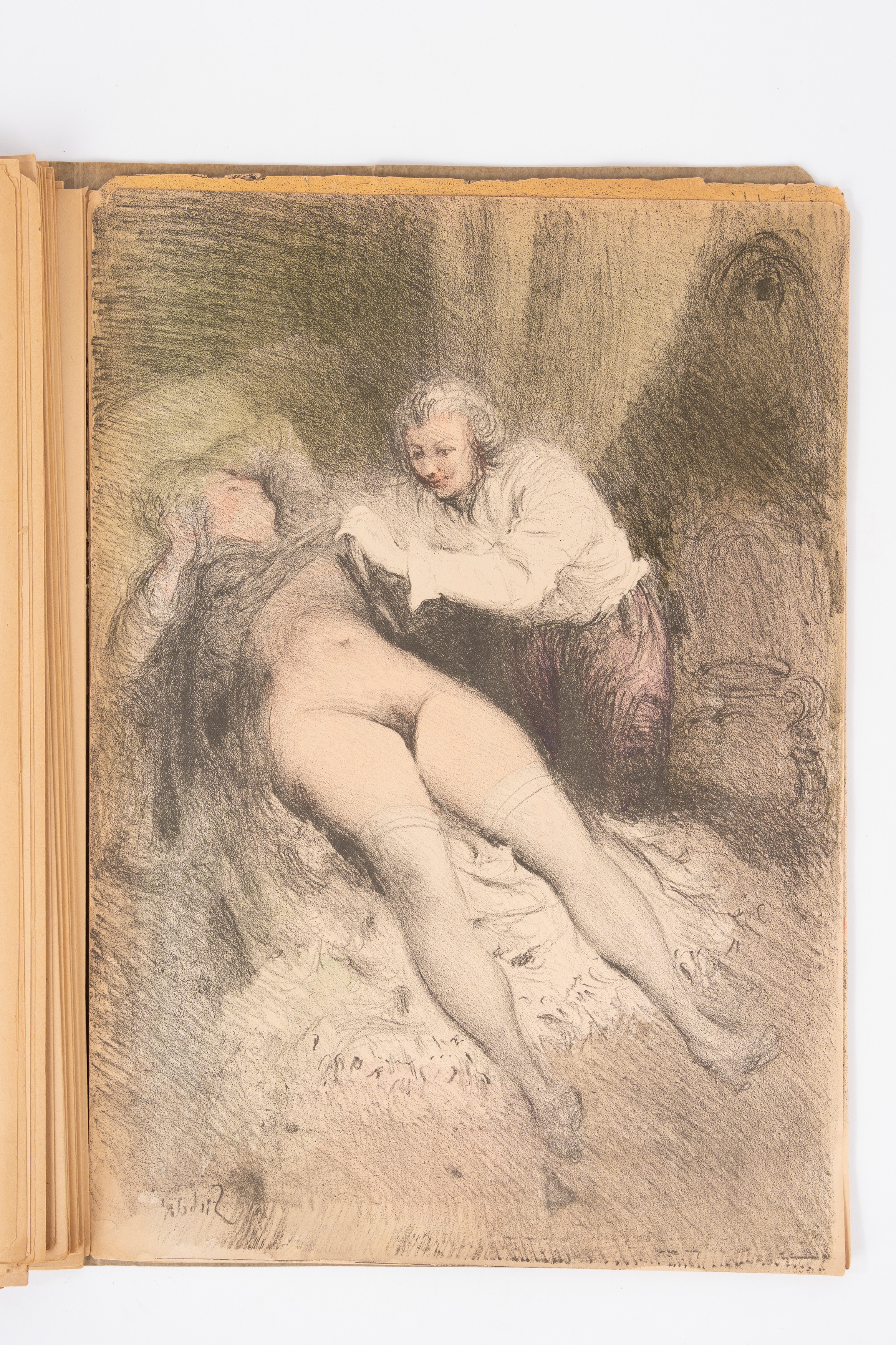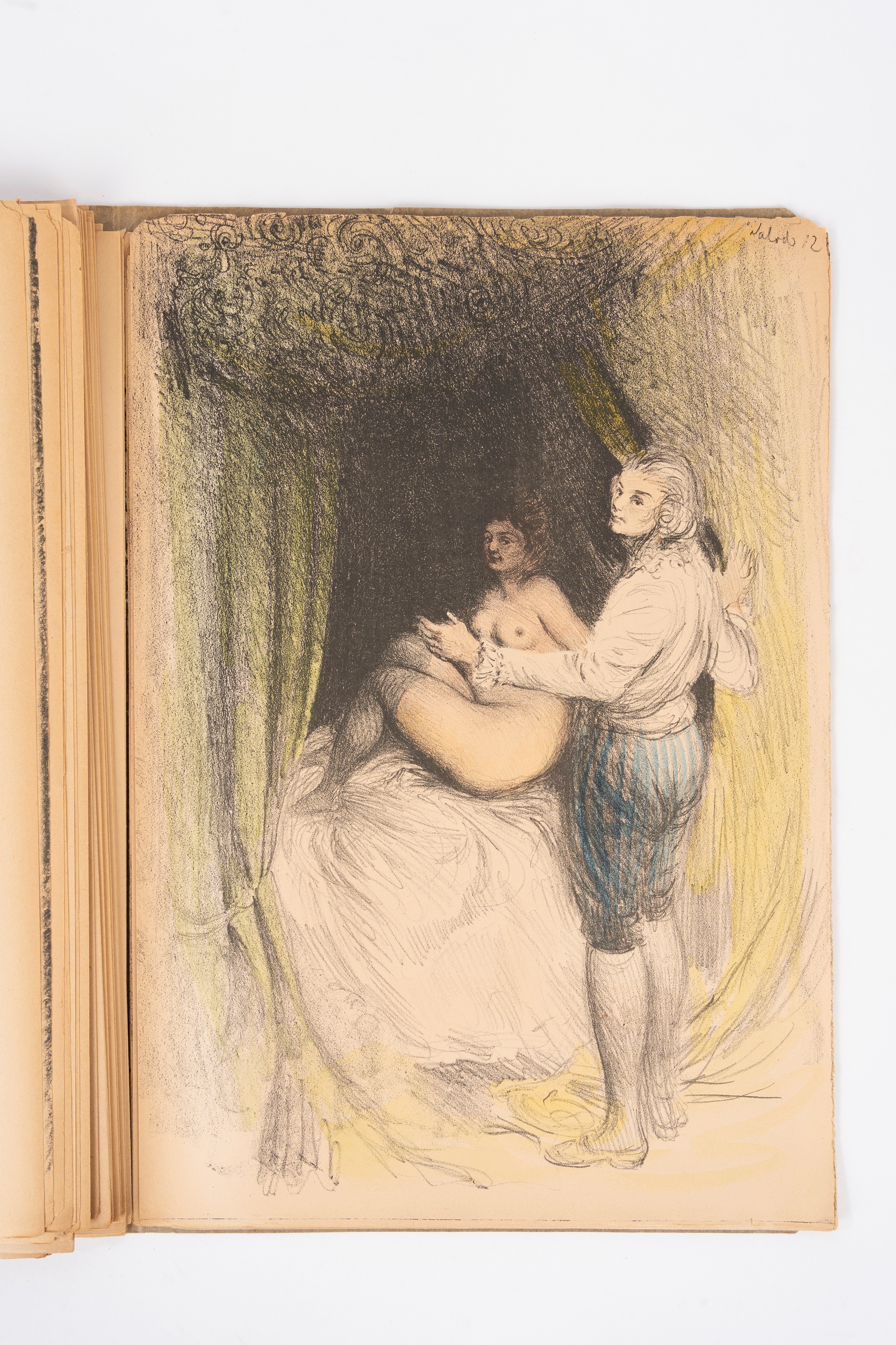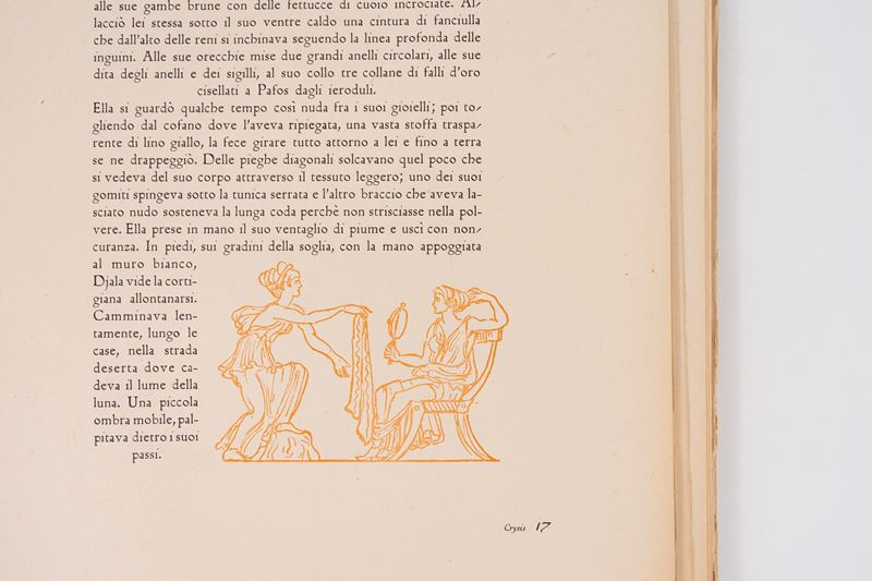 Turin, Dionysos - editore Vogliotti, 30 June 1948. Copy 29/296 common, enriched with 16 plates outside the text (lithographs) by the artist Adriano Sicbaldi, the images depict licentious and erotic scenes in keeping with the satirical and "fat" tone of Batacchi's stories, very fragile paper, untouched copy. § Pierre Louys. Aphrodite . Turin, Dionysos - editore Vogliotti, 30 June 1948. Copy 7/299 common, enriched with twelve plates outside the text painted in watercolor by the painter Gariazzo, all Pierre Louys. Aphrodite. Original, with tears and defects.