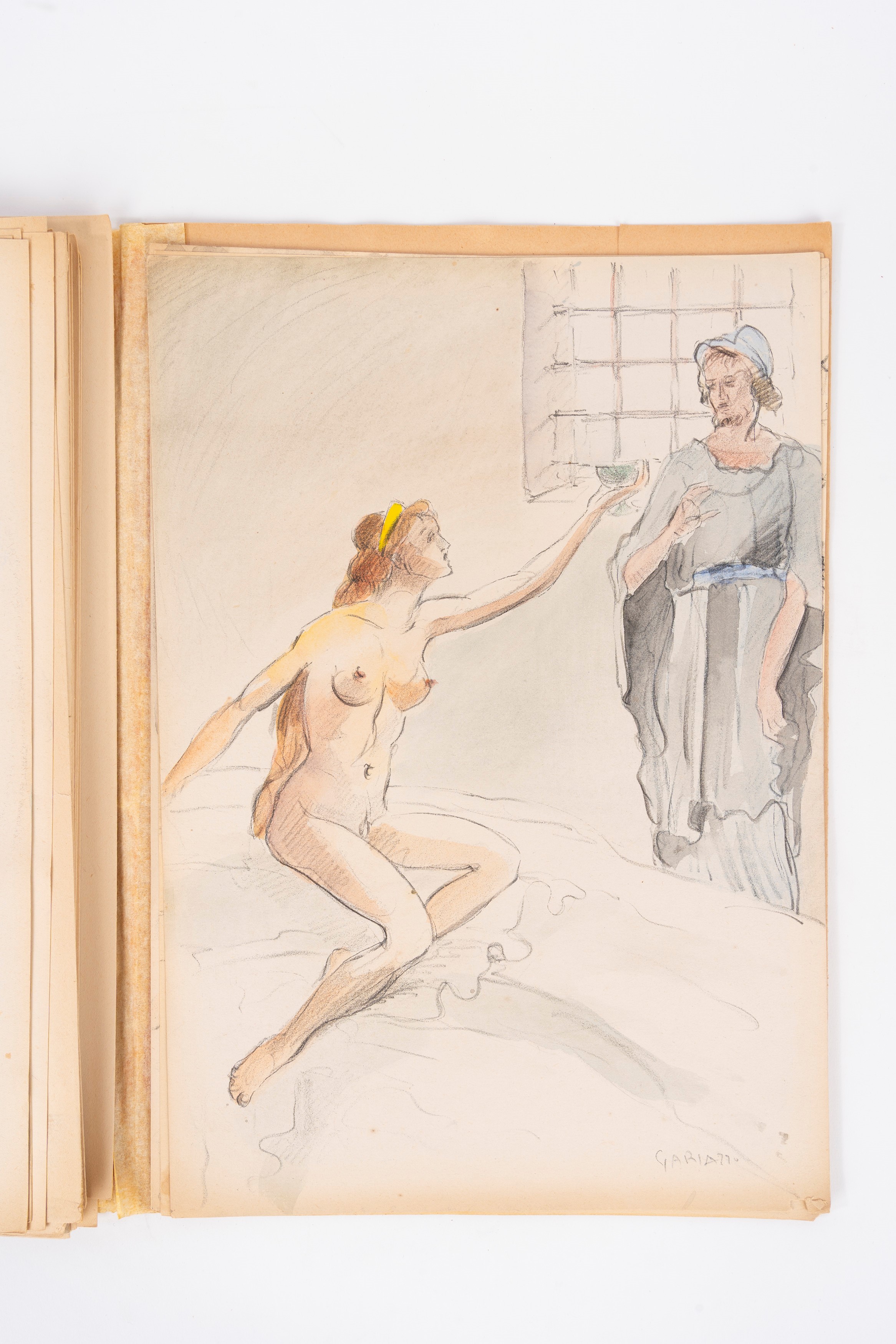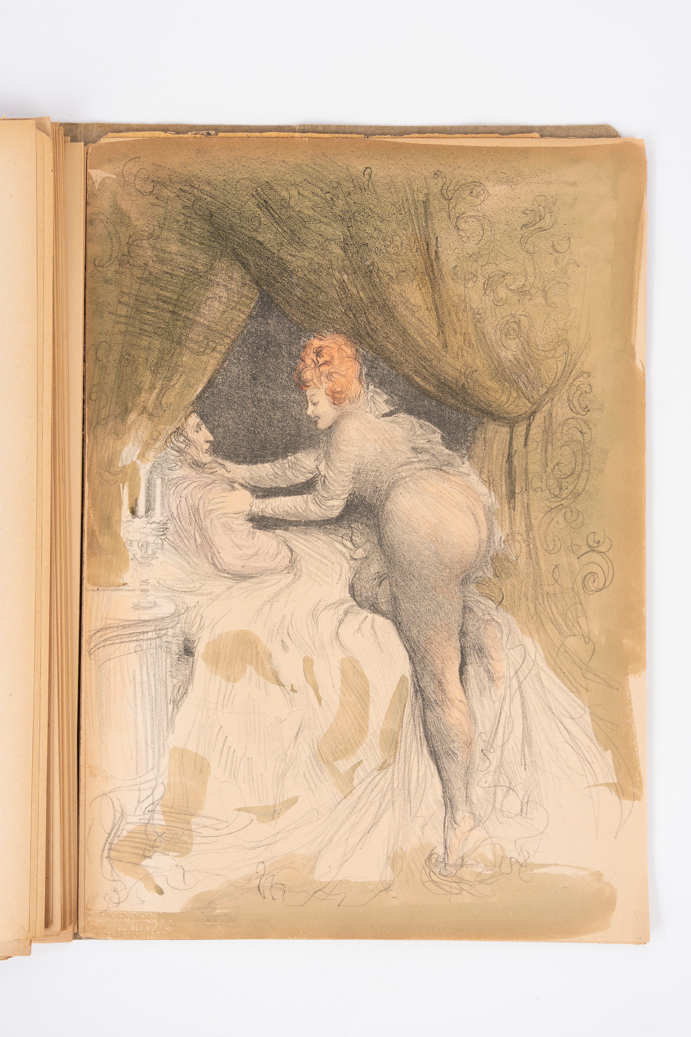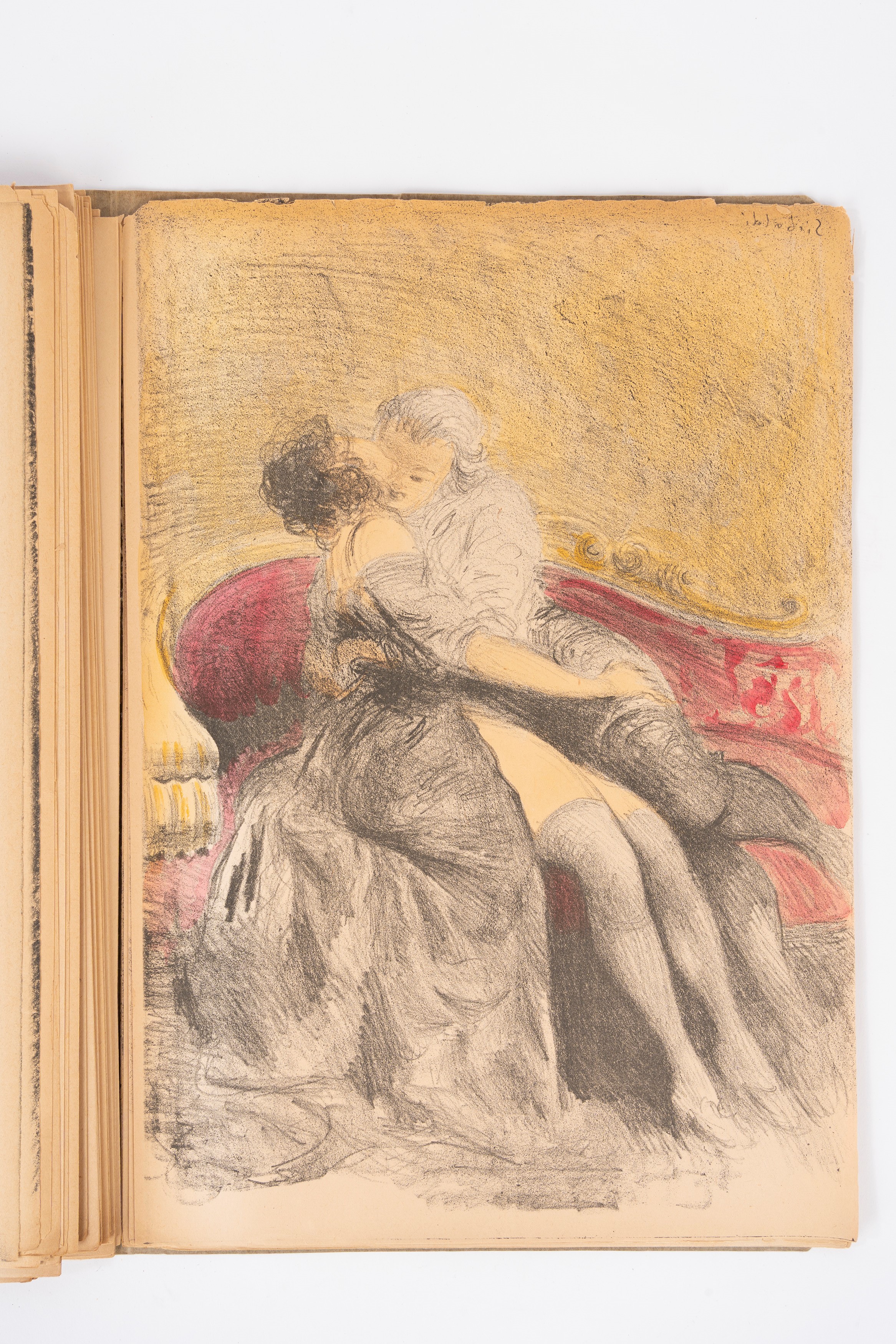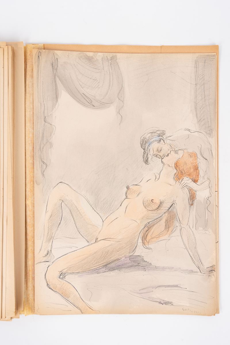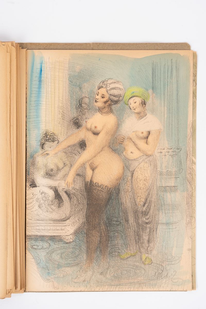 Turin, Dionysos - editore Vogliotti, 30 June 1948. Copy 29/296 common, enriched with 16 plates outside the text (lithographs) by the artist Adriano Sicbaldi, the images depict licentious and erotic scenes in keeping with the satirical and "fat" tone of Batacchi's stories, very fragile paper, untouched copy. § Pierre Louys. Aphrodite . Turin, Dionysos - editore Vogliotti, 30 June 1948. Copy 7/299 common, enriched with twelve plates outside the text painted in watercolor by the painter Gariazzo, all Pierre Louys. Aphrodite. Original, with tears and defects.