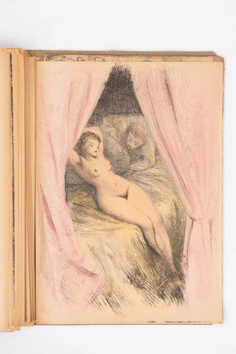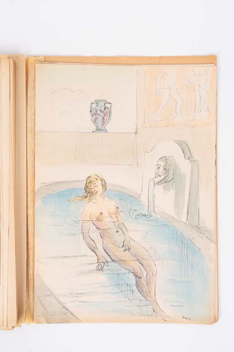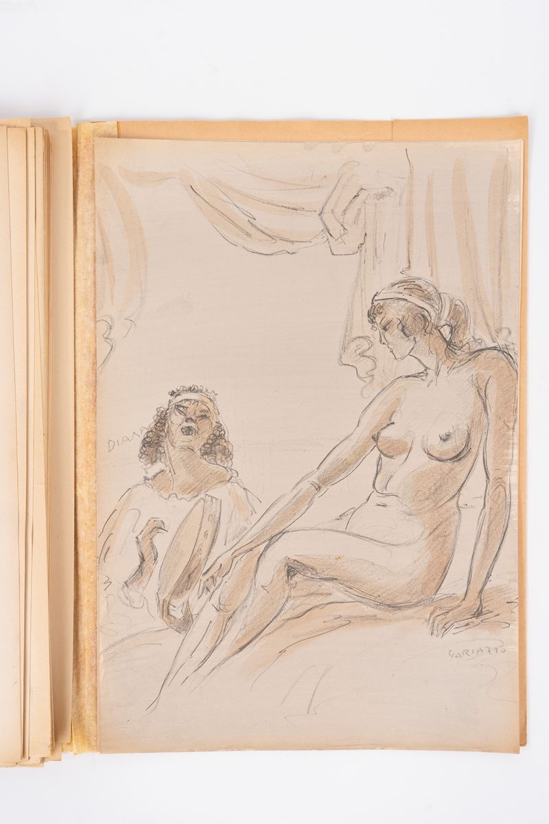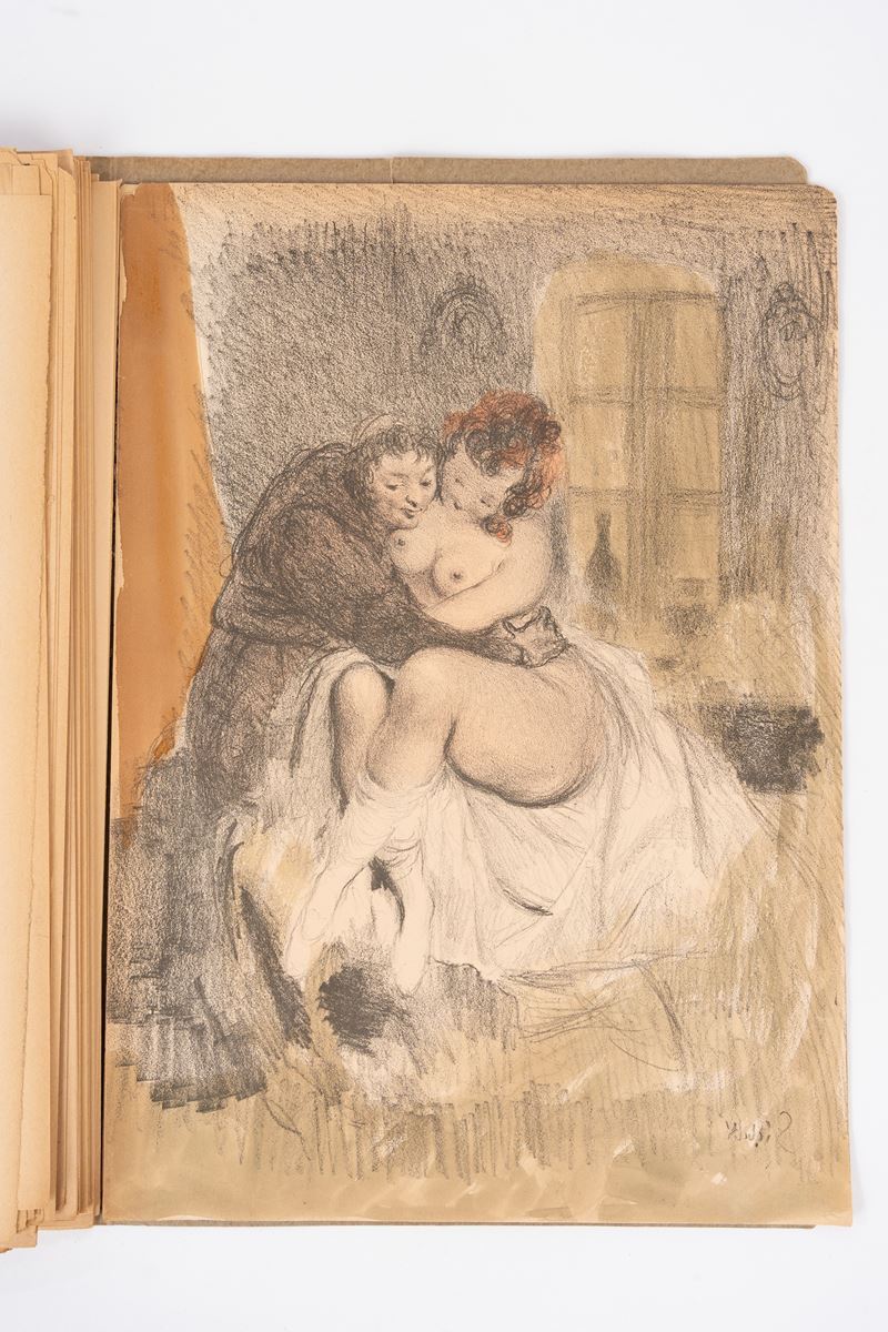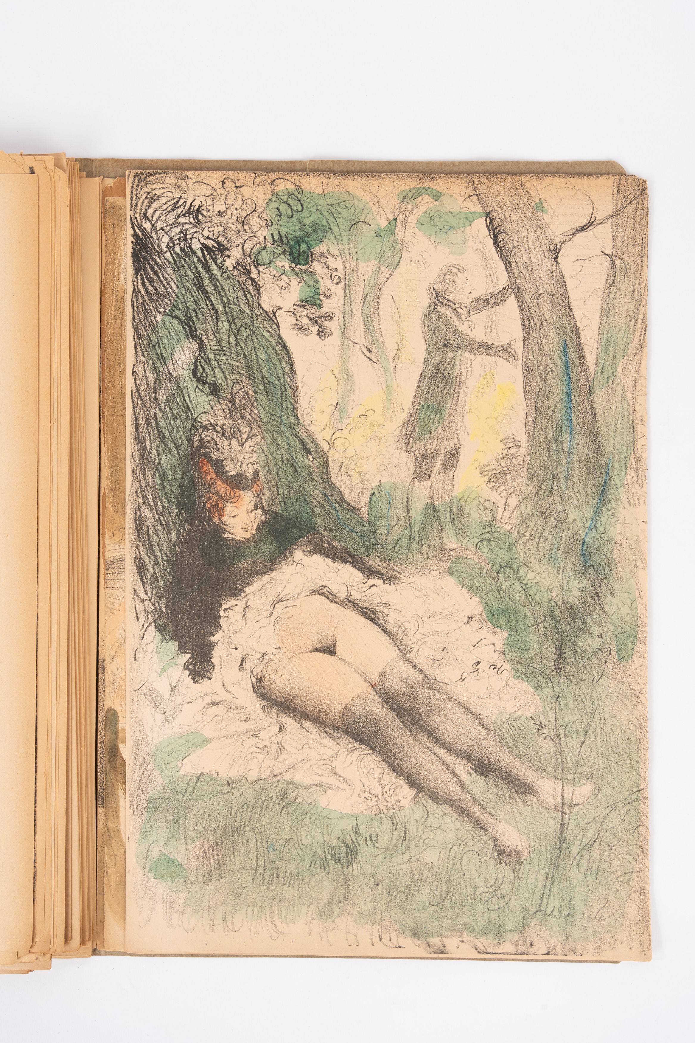 Turin, Dionysos - editore Vogliotti, 30 June 1948. Copy 29/296 common, enriched with 16 plates outside the text (lithographs) by the artist Adriano Sicbaldi, the images depict licentious and erotic scenes in keeping with the satirical and "fat" tone of Batacchi's stories, very fragile paper, untouched copy. § Pierre Louys. Aphrodite . Turin, Dionysos - editore Vogliotti, 30 June 1948. Copy 7/299 common, enriched with twelve plates outside the text painted in watercolor by the painter Gariazzo, all Pierre Louys. Aphrodite. Original, with tears and defects.