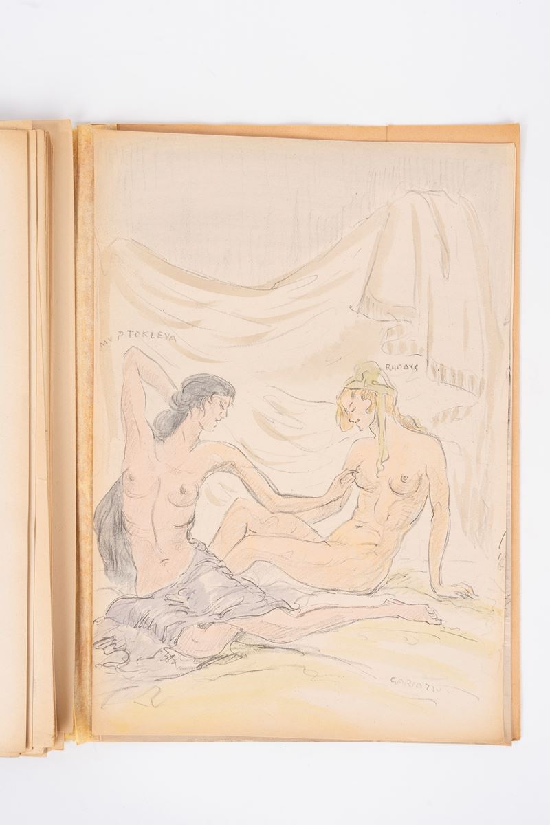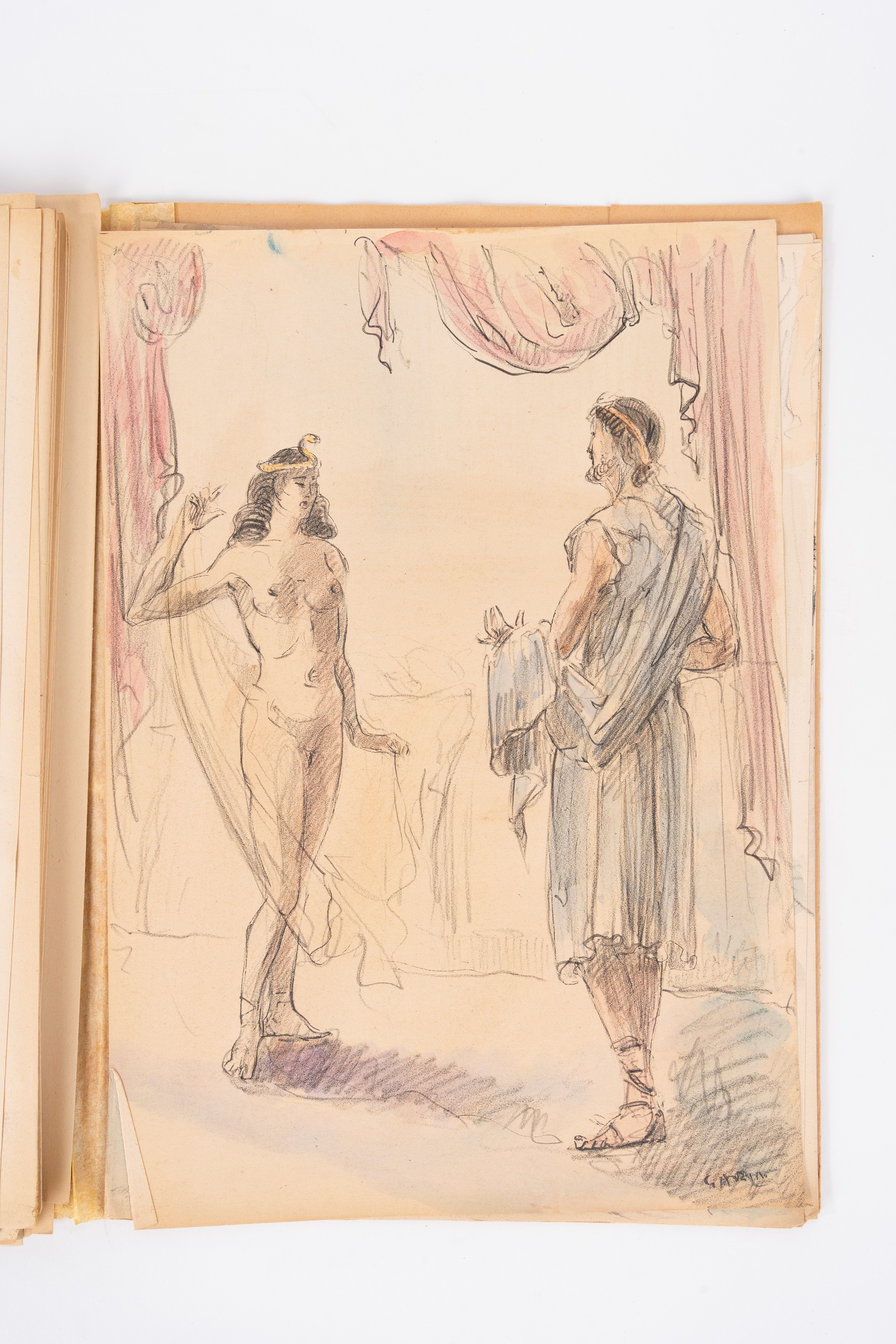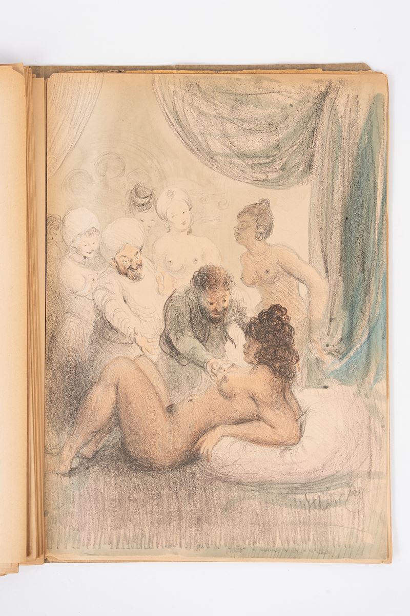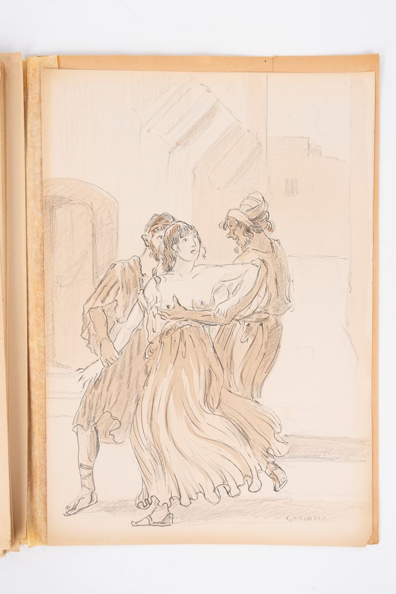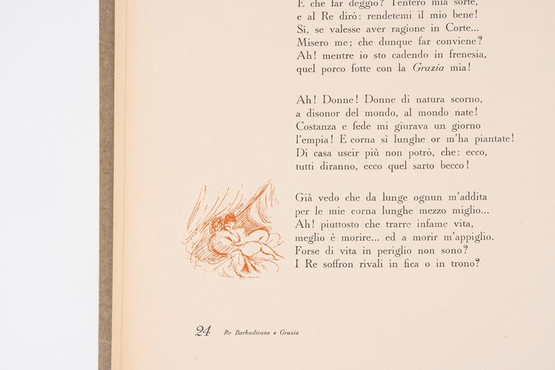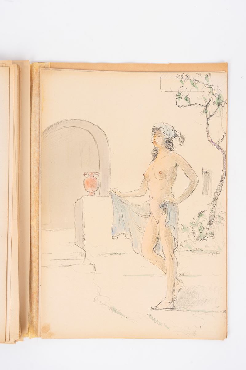 Turin, Dionysos - editore Vogliotti, 30 June 1948. Copy 29/296 common, enriched with 16 plates outside the text (lithographs) by the artist Adriano Sicbaldi, the images depict licentious and erotic scenes in keeping with the satirical and "fat" tone of Batacchi's stories, very fragile paper, untouched copy. § Pierre Louys. Aphrodite . Turin, Dionysos - editore Vogliotti, 30 June 1948. Copy 7/299 common, enriched with twelve plates outside the text painted in watercolor by the painter Gariazzo, all Pierre Louys. Aphrodite. Original, with tears and defects.