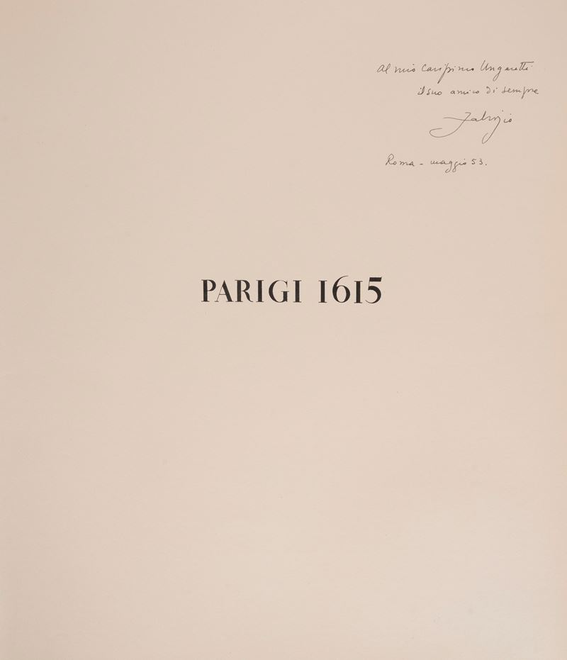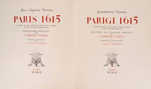 Rome, SE, 1952. In-folio. Double title page in red and black in Italian and French, with 10 original full-page lithographs by Clerici in the text, black and white illustrations, loose issues in editorial paperback with decorated paper dust jacket, decorated paper slipcase. Dedication by Fabrizio Clerici to Ungaretti.