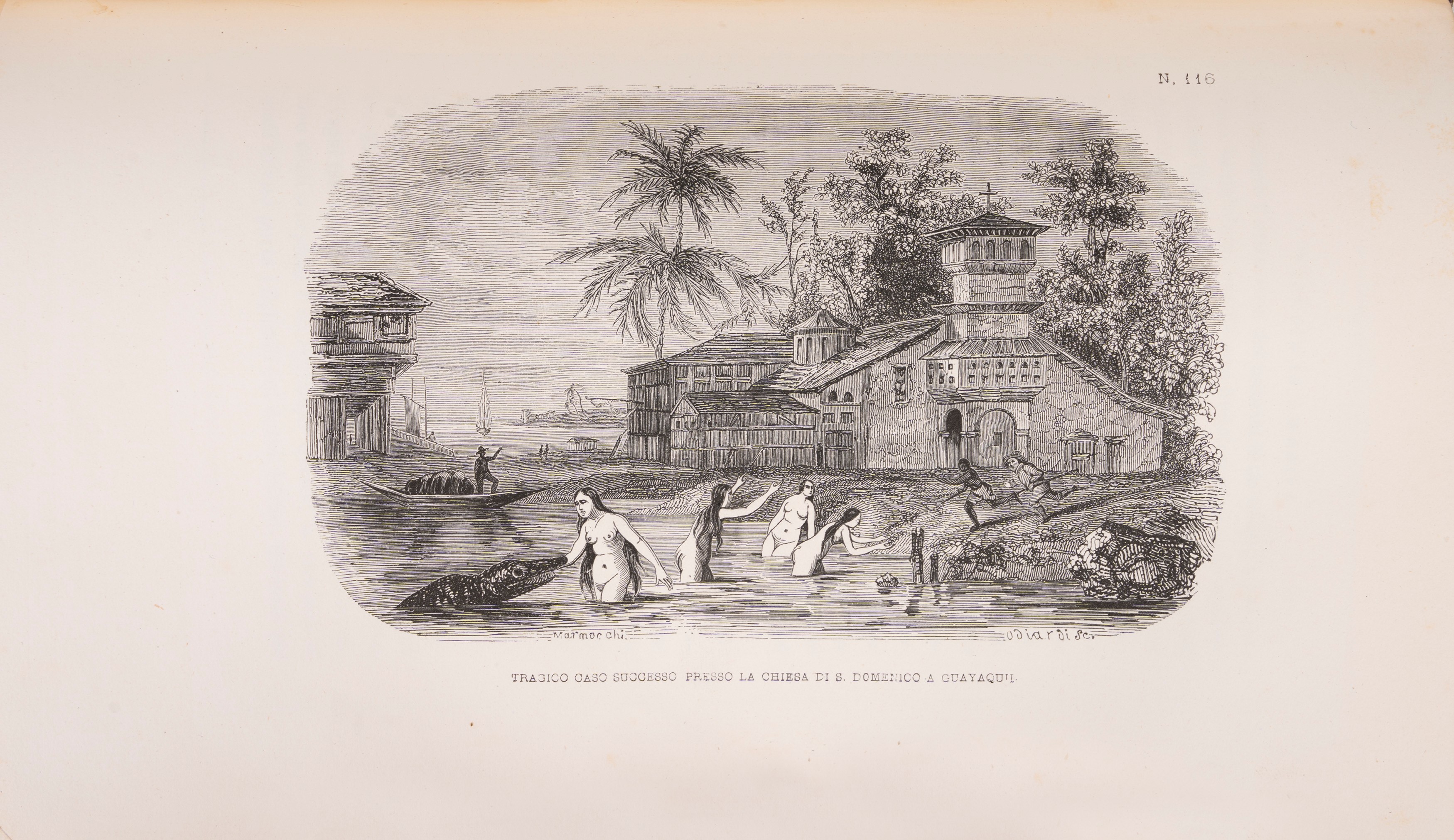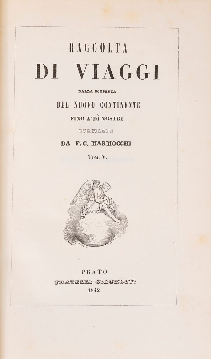 Prati, Fratelli Giacchetti, 1842. From Volumes 5 to 14 in 7 volumes. Edition with full-page black-and-white and color illustrations protected by tissue paper. Bound in green chagrin, gold title on the smooth spine, minor defects. Volume 5: Travels to the New Continent; Volume 6: Travels in Asia; Volume 7: Travels in Asia; Volume 8: Travels in Asia; Volume 9: Travels in Asia; Volume 10: Travels to the New Continent; Volume 11: Travels to the New Continent; Volume 12: Travels to the New Continent; Volume 13: Travels in Asia; Volume 14: Travels in Oceania.