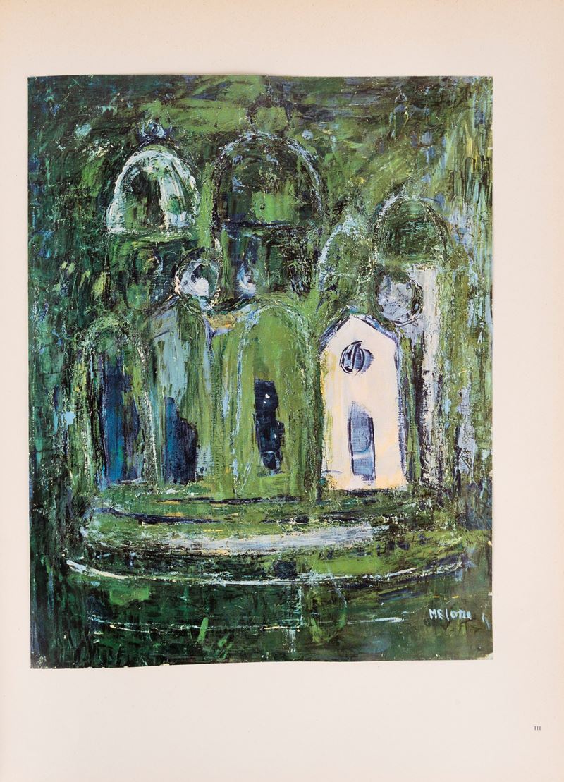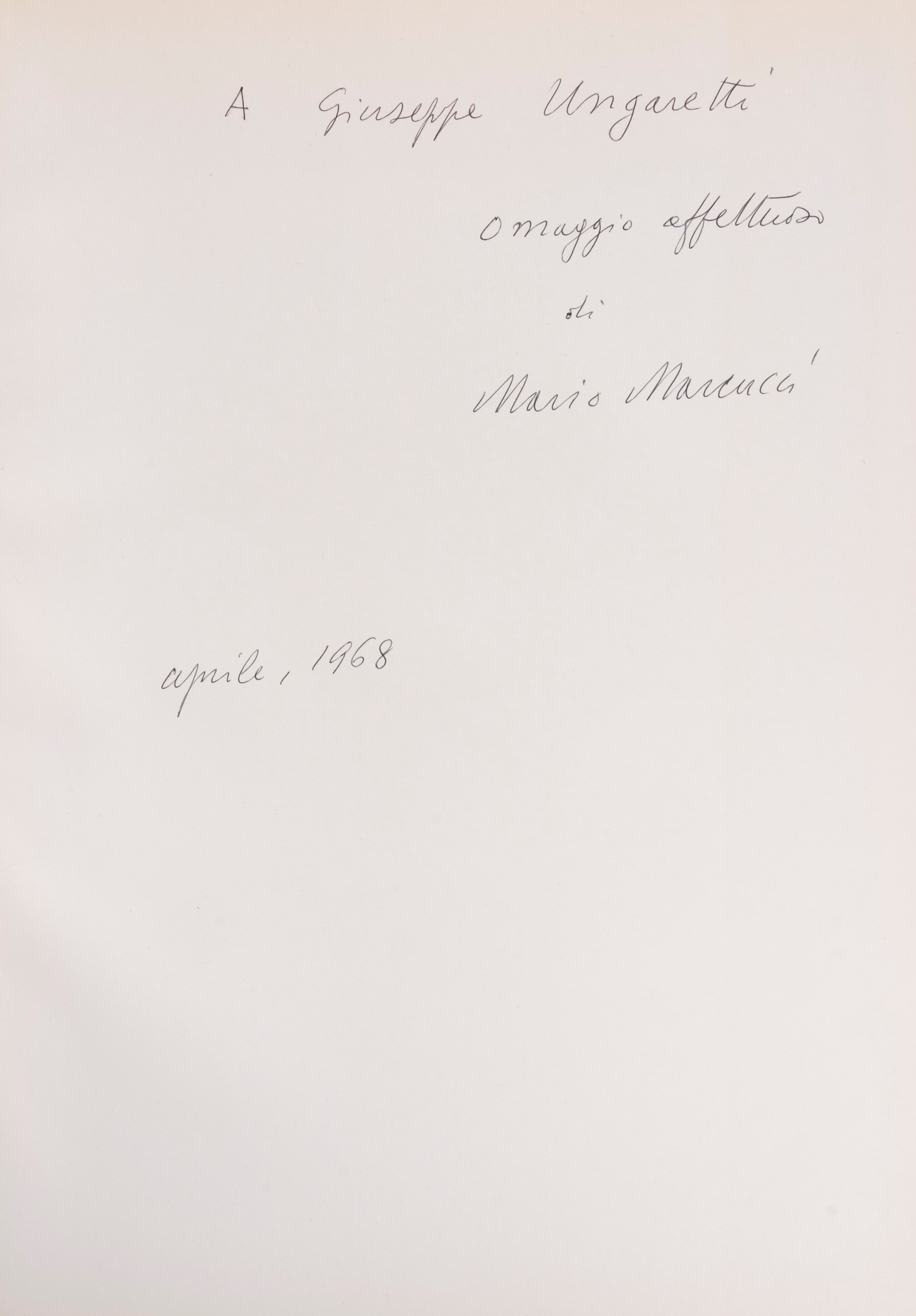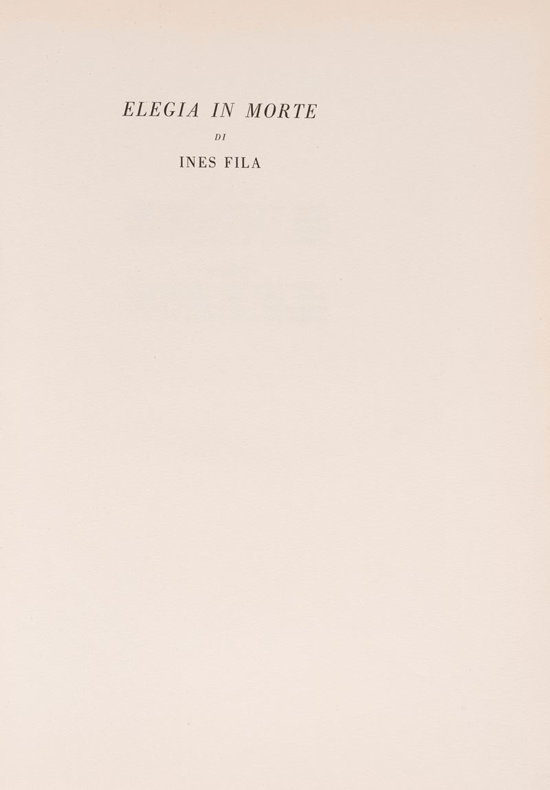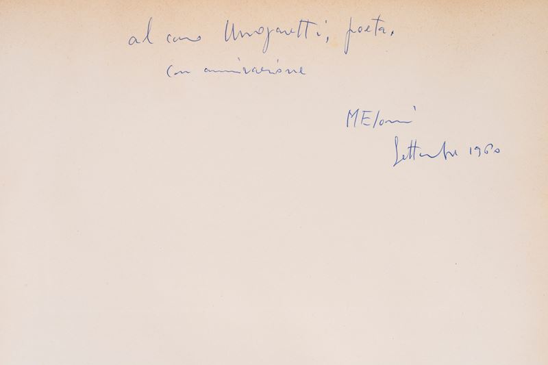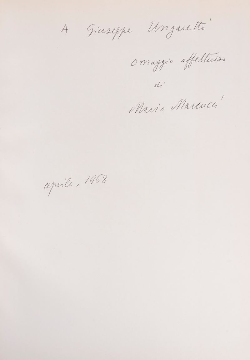 Milan, Ines Fila Foundation, 1948. With 10 plates outside the text by Bartolini, Borgese, Carletti, Carrà, Casorati, De Pisis, Marini, Manzù, Messina and texts by Bacchelli, Baldini, Cardarelli, Moravia, Repaci, Saponaro, Ungaretti, Vergani, Vittorini. Out-of-print edition printed in 750 numbered copies, copy no. 159. § Also in the lot: Mario Marcucci, Thirty Watercolors , Prato, Fratelli Farsetti, 1968. With a dedication from the author to Ungaretti. Out-of-print copy no. XXIII with the signatures of Leonetto Leoni and Mario Marcucci. § Meloni, text edited by Renzo Modesti. Milan, Antonio Vallardi Editore, 1960. With a dedication from the author to Ungaretti. § Bonajuti. Four original lithographs reproduced on zinc and unpublished text by Duchamps, poeme d'aujourd'hui . Rome, Edizione della salita, 1961.