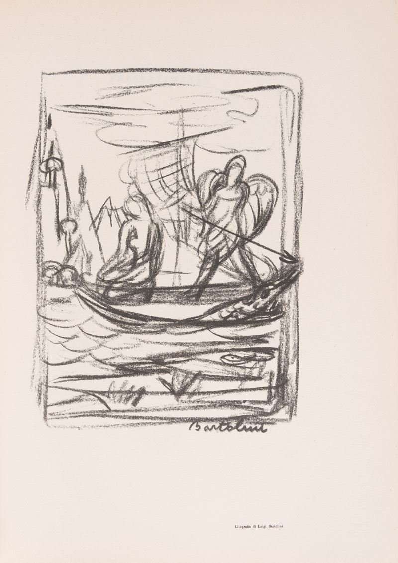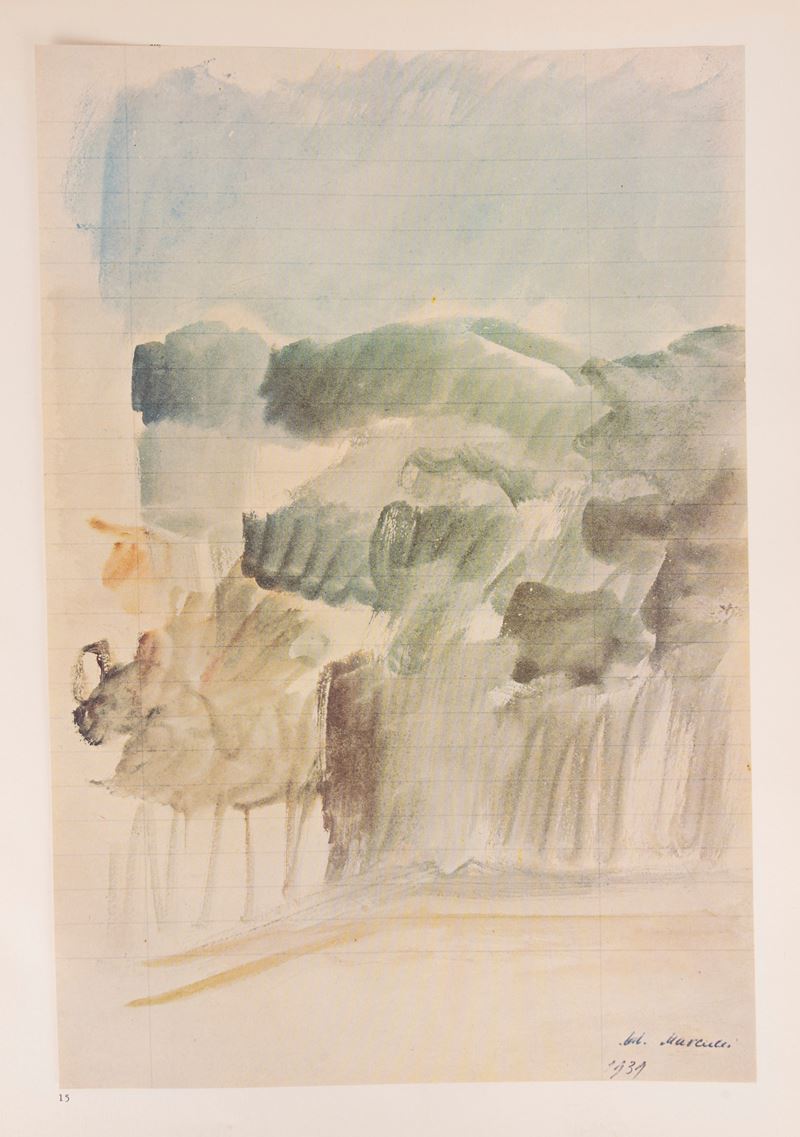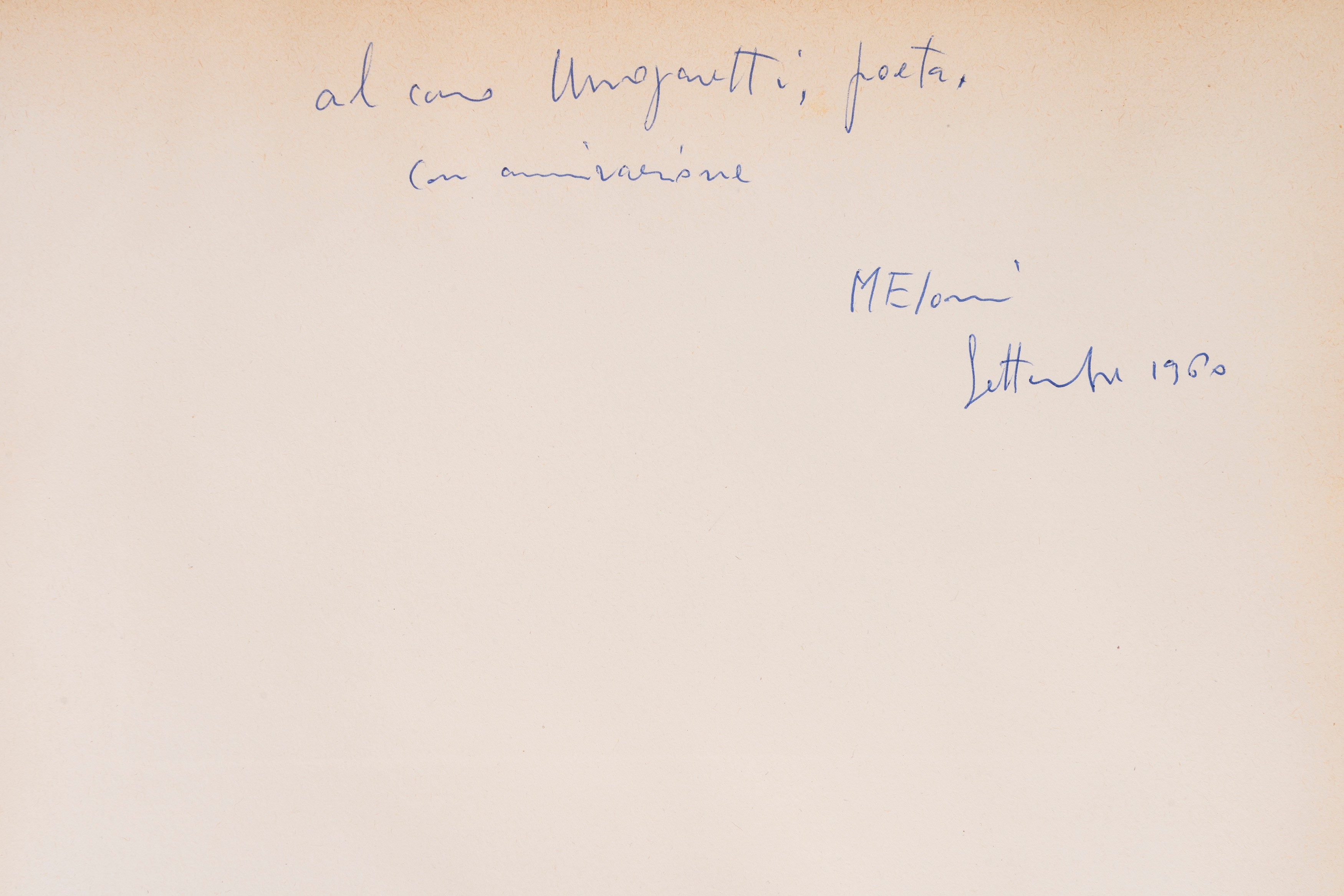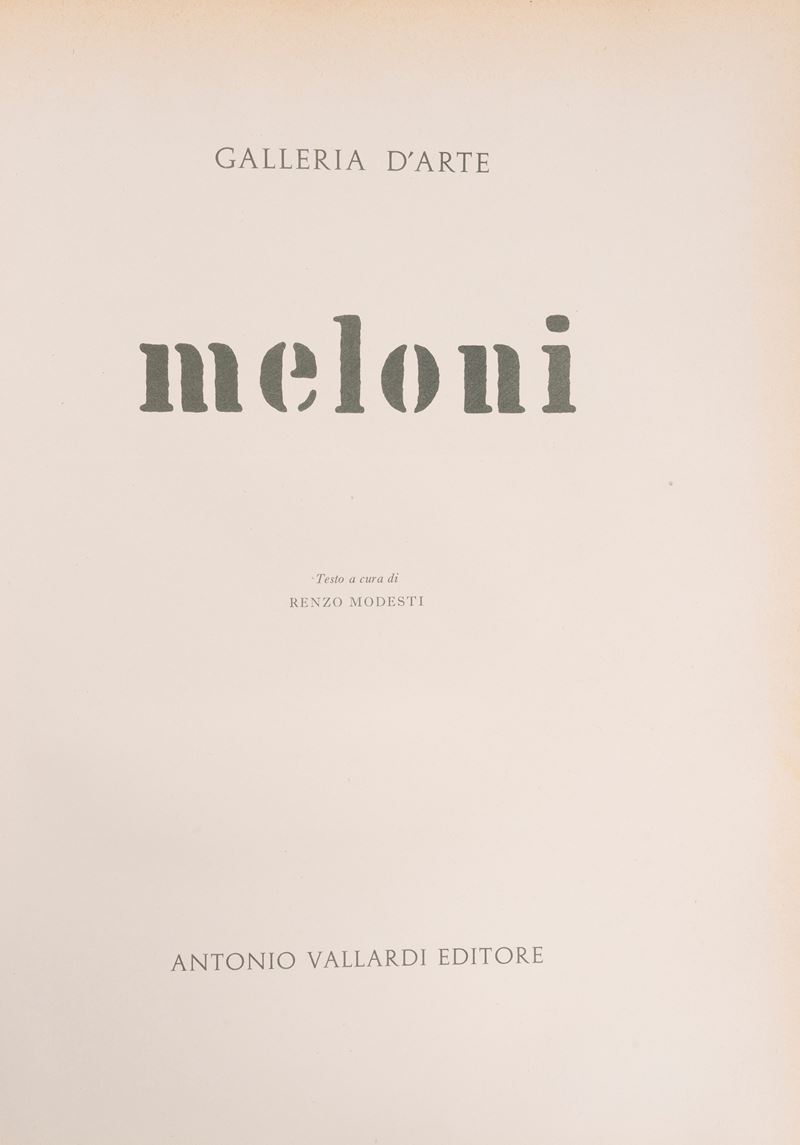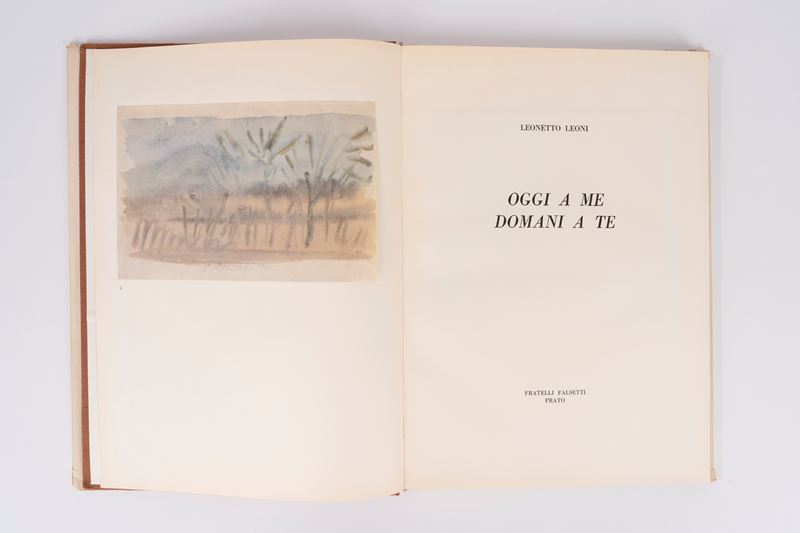 Milan, Ines Fila Foundation, 1948. With 10 plates outside the text by Bartolini, Borgese, Carletti, Carrà, Casorati, De Pisis, Marini, Manzù, Messina and texts by Bacchelli, Baldini, Cardarelli, Moravia, Repaci, Saponaro, Ungaretti, Vergani, Vittorini. Out-of-print edition printed in 750 numbered copies, copy no. 159. § Also in the lot: Mario Marcucci, Thirty Watercolors , Prato, Fratelli Farsetti, 1968. With a dedication from the author to Ungaretti. Out-of-print copy no. XXIII with the signatures of Leonetto Leoni and Mario Marcucci. § Meloni, text edited by Renzo Modesti. Milan, Antonio Vallardi Editore, 1960. With a dedication from the author to Ungaretti. § Bonajuti. Four original lithographs reproduced on zinc and unpublished text by Duchamps, poeme d'aujourd'hui . Rome, Edizione della salita, 1961.