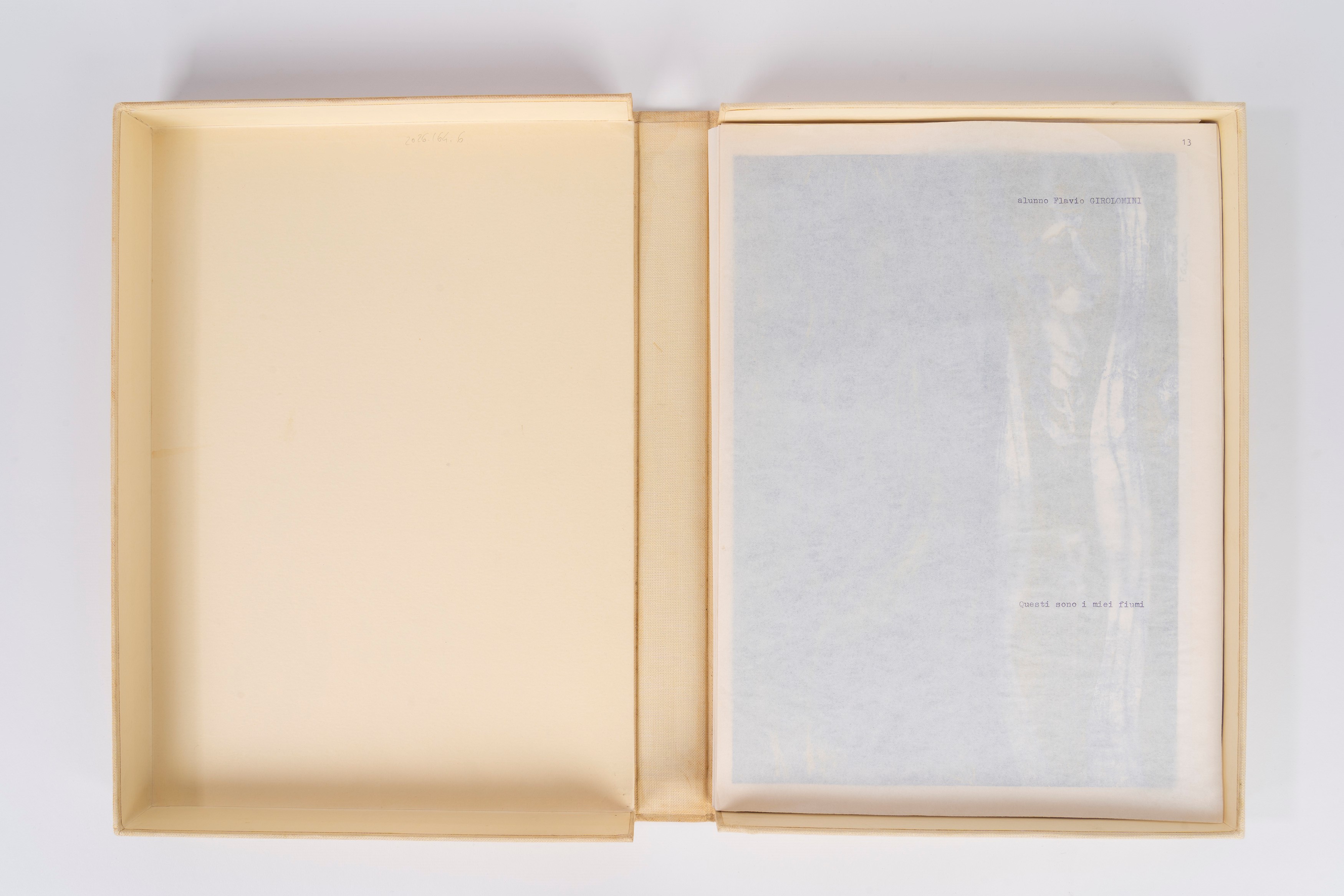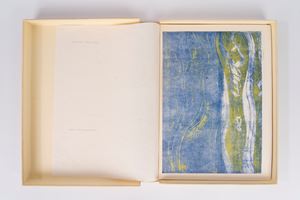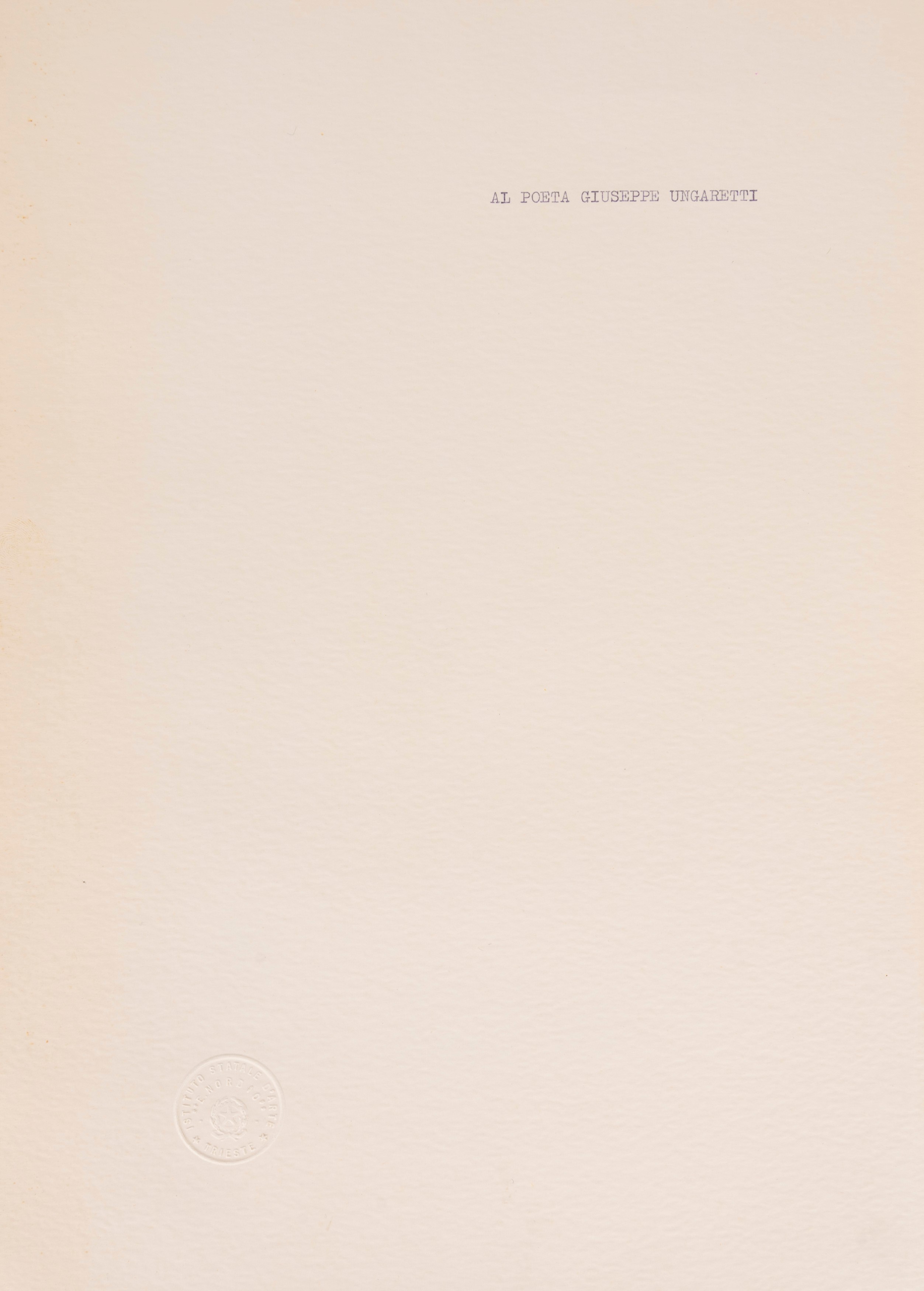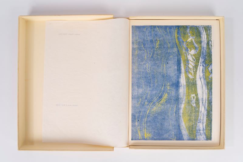 Beige canvas folder containing a loose sheet of dry-stamped art from the E. Nordio State Art Institute of Trieste and 23 plates created by students of the Trieste Institute, each protected by tissue paper with the artist's name and a verse from works by Ungaretti. A paper insert with the name of the Institute is attached to the front cover.