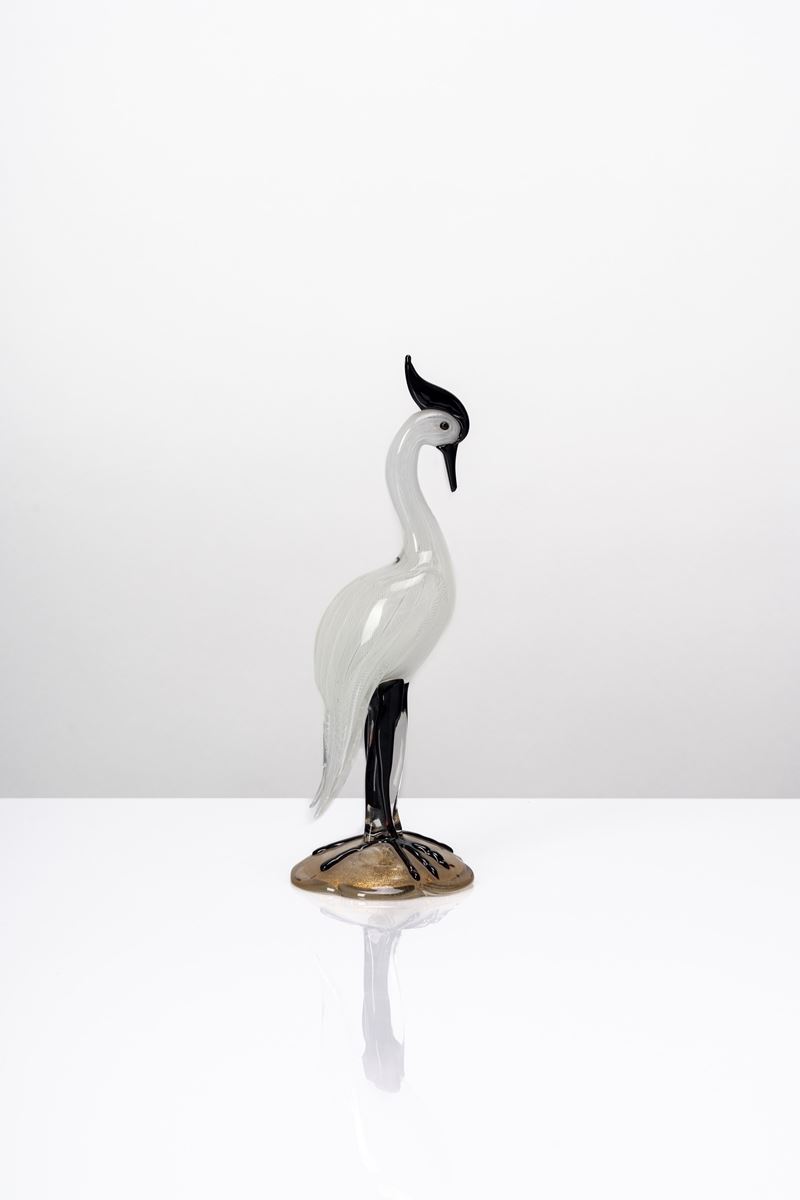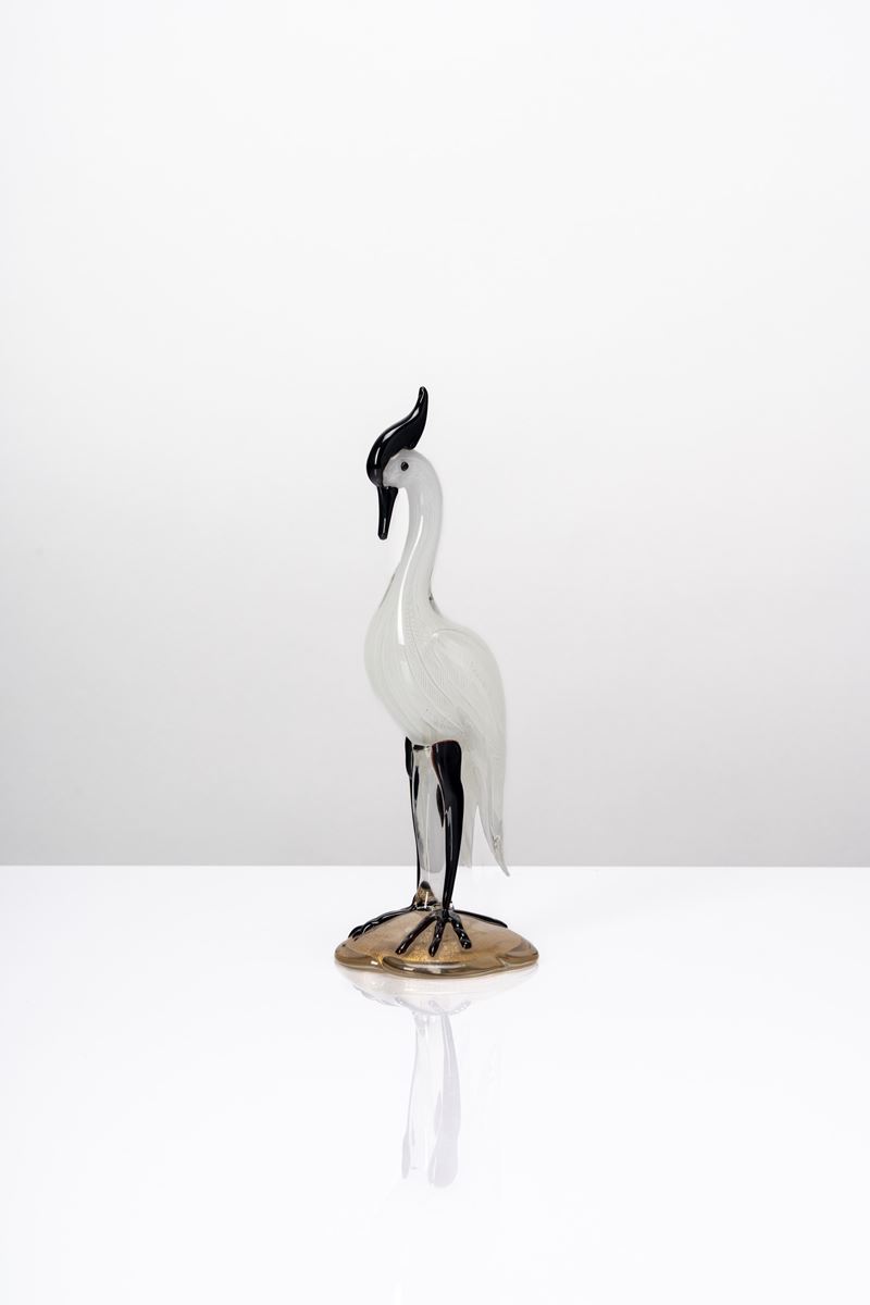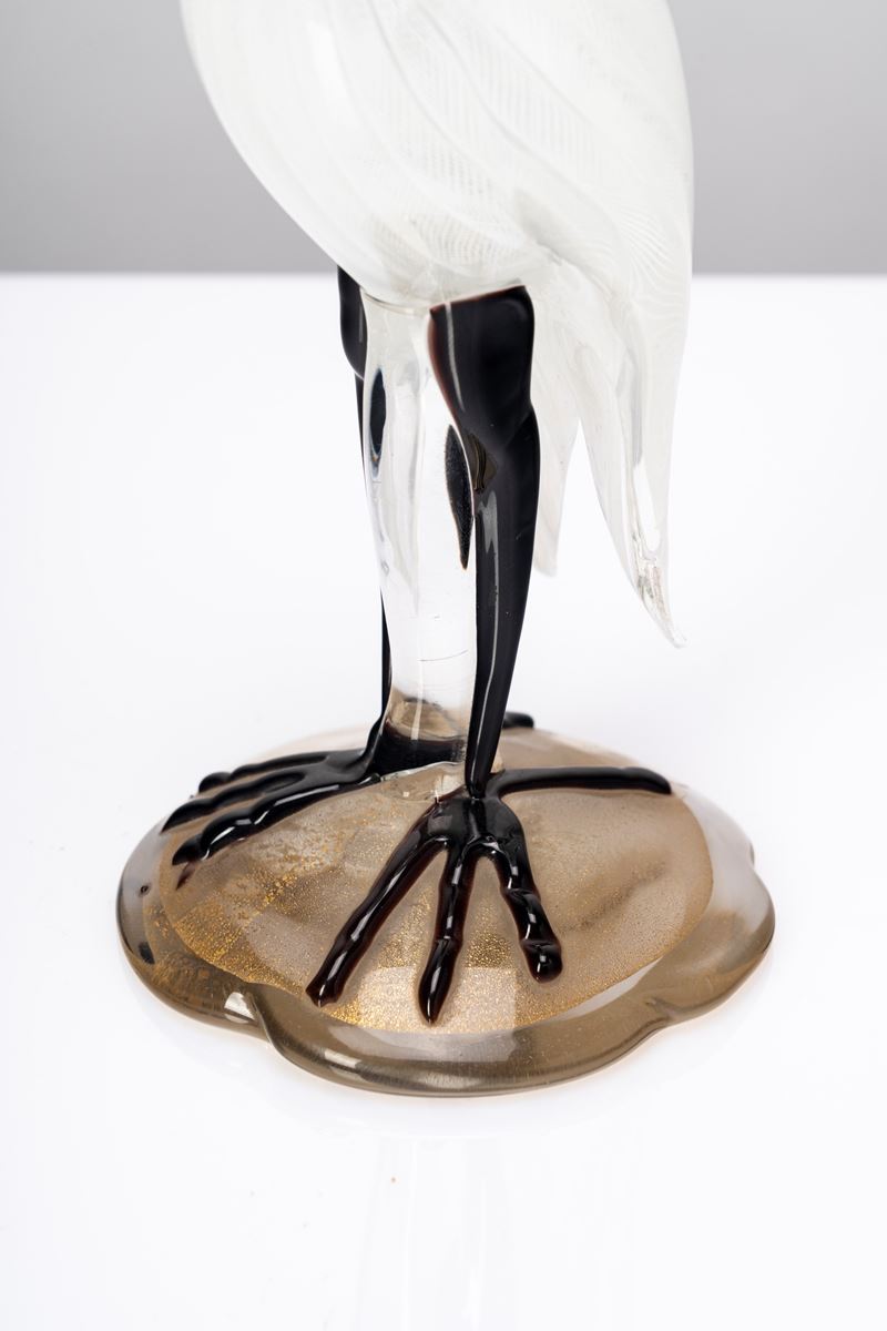 Heron-shaped figure with colorless glass body with zanphyric decoration, hot-applied amethyst glass details and base with gold leaf decoration