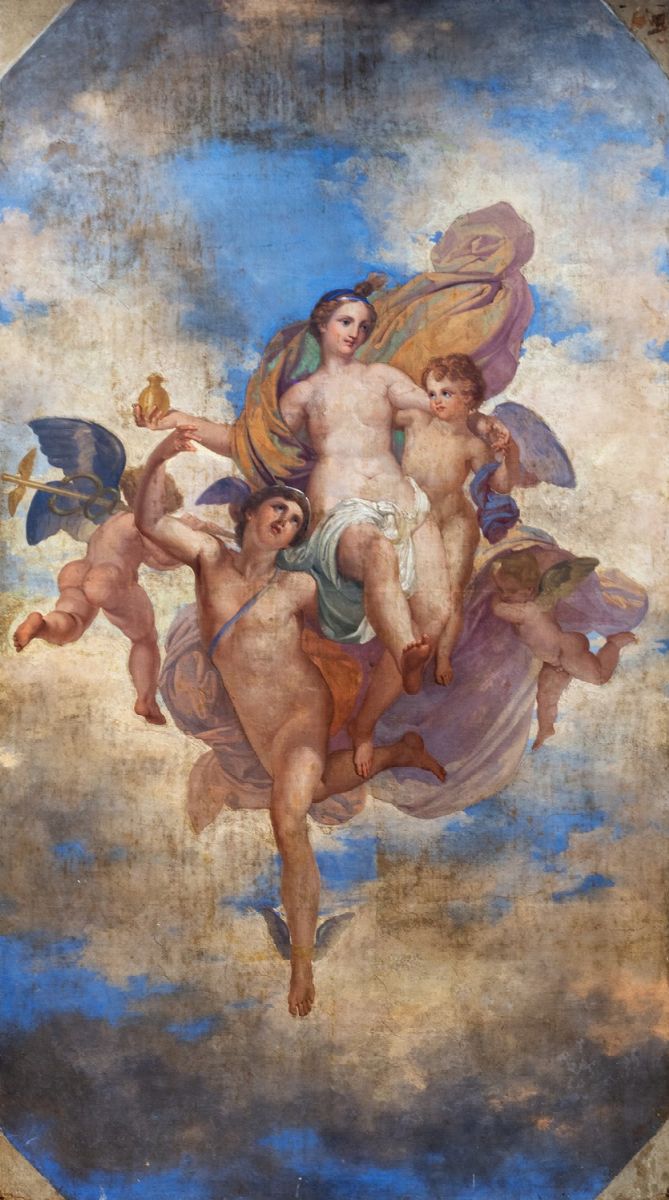 The work was originally located in the Octagonal Room known as del Coghetti or Psyche, of the representative apartments of the Torlonia spouses, on the second floor of the Palazzo, overlooking Piazza Venezia. Among the episodes of the fable of Cupid and Psyche painted by Coghetti, Mercury carrying Psyche to heaven is judged by Oliviero Iozzi to be "one of the best conducted" and for this reason illustrated in his volume on Palazzo Torlonia (cf. Iozzi, & nbsp; The Torlonia palace & nbsp; cit., P. 81). The episode is the last in history and follows: & nbsp; Love that tears the veil from purity; Ignorance makes Love jump, a child fed by Hope; the Marriage of Psyche and the people who honor it . The Raphaelesque quotations, which Don Alessandro Torlonia appreciated so much, are interpreted here by the painter with a neoclassical sensibility of singular visual impact, thanks also to the large dimensions of the work. & Nbsp; A preparatory cartoon by Francesco Coghetti, commissioned by Prince Alexander and depicting & nbsp; Mercure qui porte Hèbé [sic!] dans l'air , was exhibited at the Exposition Coghetti in Via Condotti 21 in Rome and published in a small catalog, with no indication of the year, at number 23, together with other works commissioned by Torlonia dei Coghetti father and son.