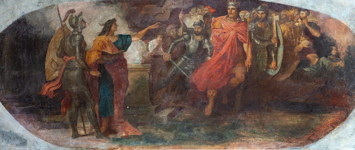 The work was in origin in the Room known as the Consoni or the four Poets, on the second floor of Palazzo Bolognetti-Torlonia. The episode is taken from canto III of Orlando Furioso: the sorceress Melissa prophesies her future and her descendants to the warrior Bradamante; the characters on the right are the spirits of the Estense family who will descend from Bradamante and Ruggero. In the room the four great poets are represented on the walls with as many episodes inspired by their work: Dante shown by Virgil to Homer, Bradamante offered in the lot, Laura appearing in a dream to Petrarch, Erminia del Tasso.