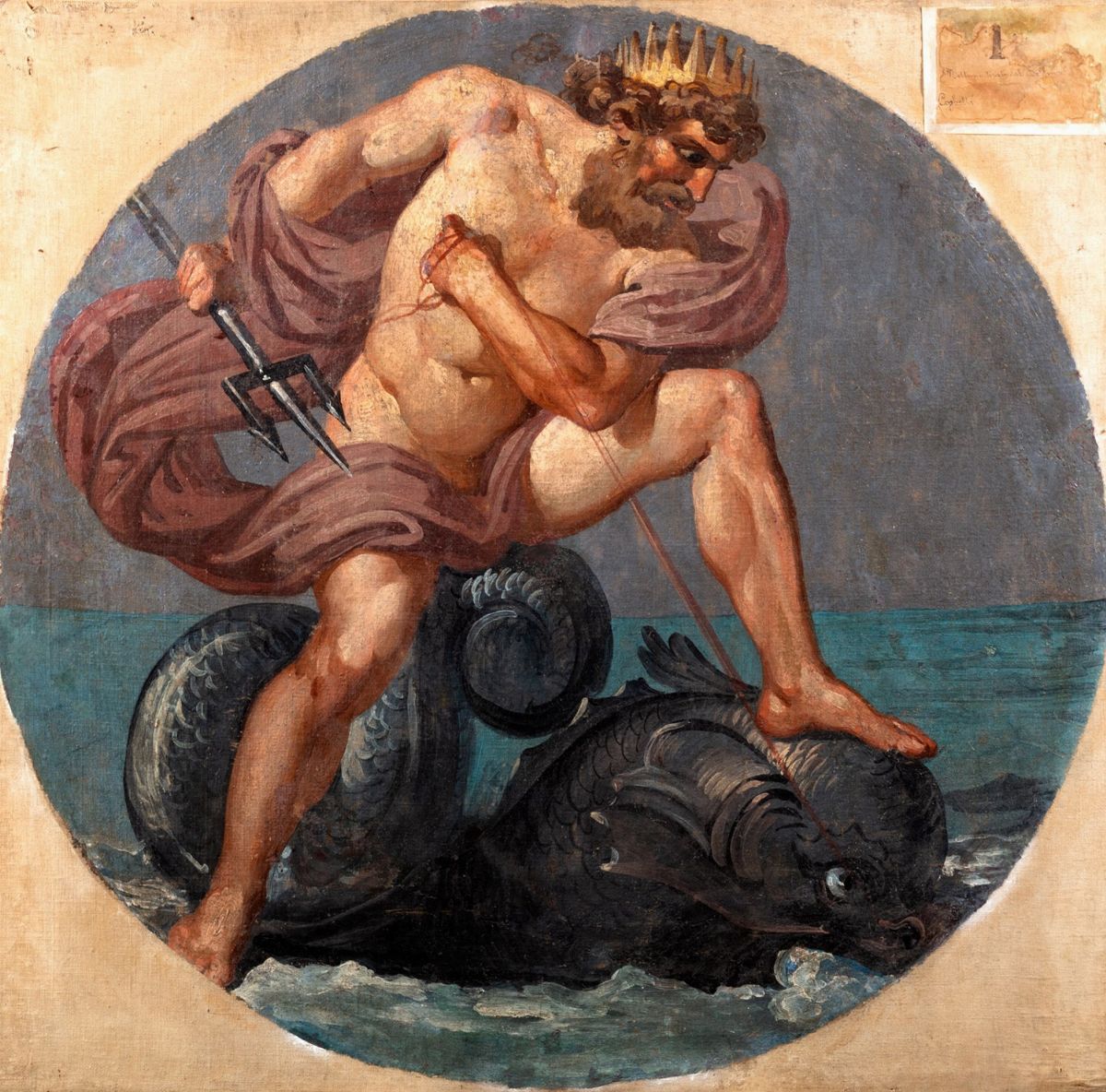 Fresco reproduced on canvas, without frame, 74 x 74 cm upper right sale: & nbsp; 1 [2] / Neptune pulled from & nbsp; dolphin / Coghetti