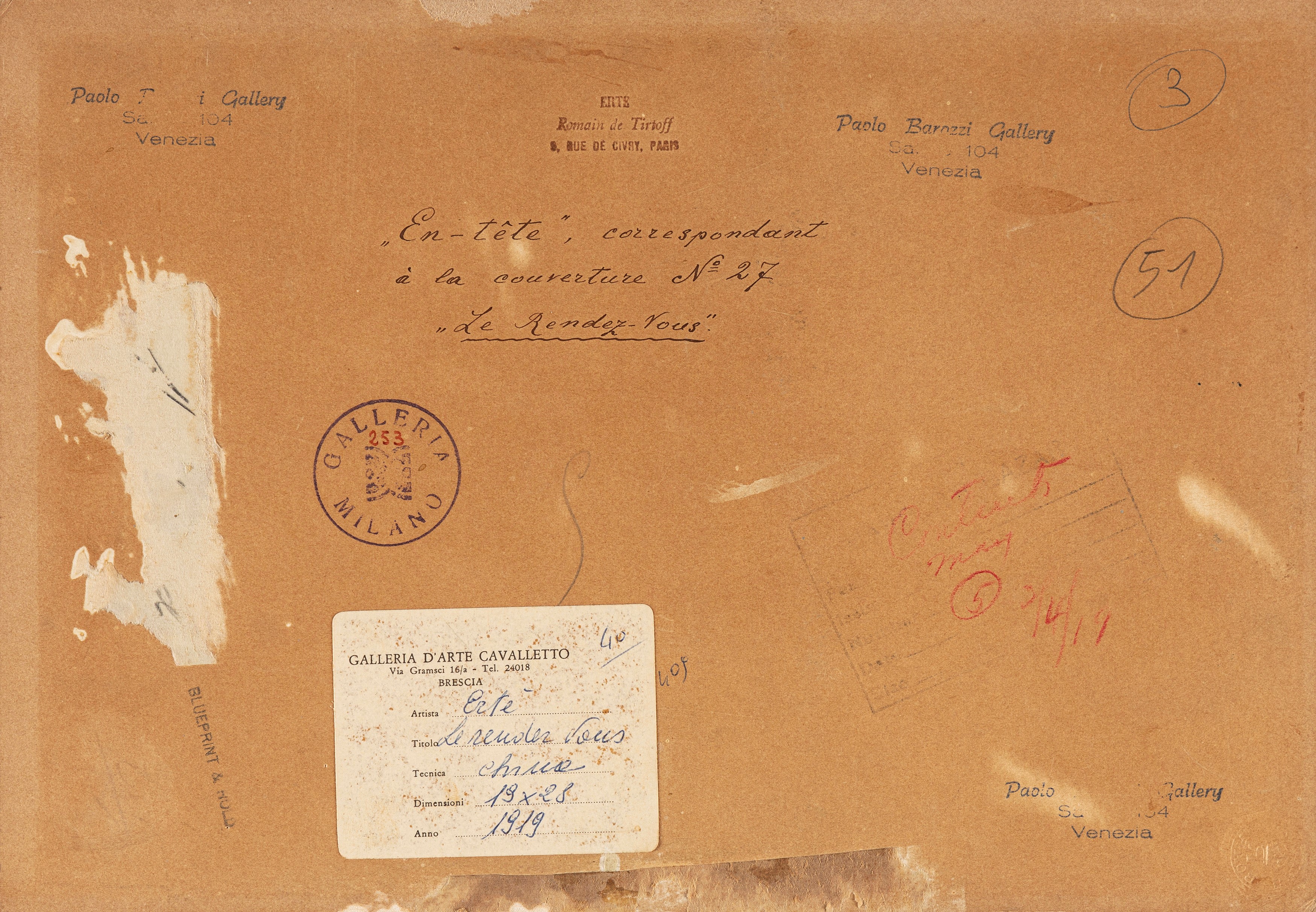 Original drawing made by Erté in 1919 for the famous Harper's Bazaar magazine. Bearing the title, the artist's stamp, the editorial stamp and the stamps of some galleries of origin on the back. Signed.