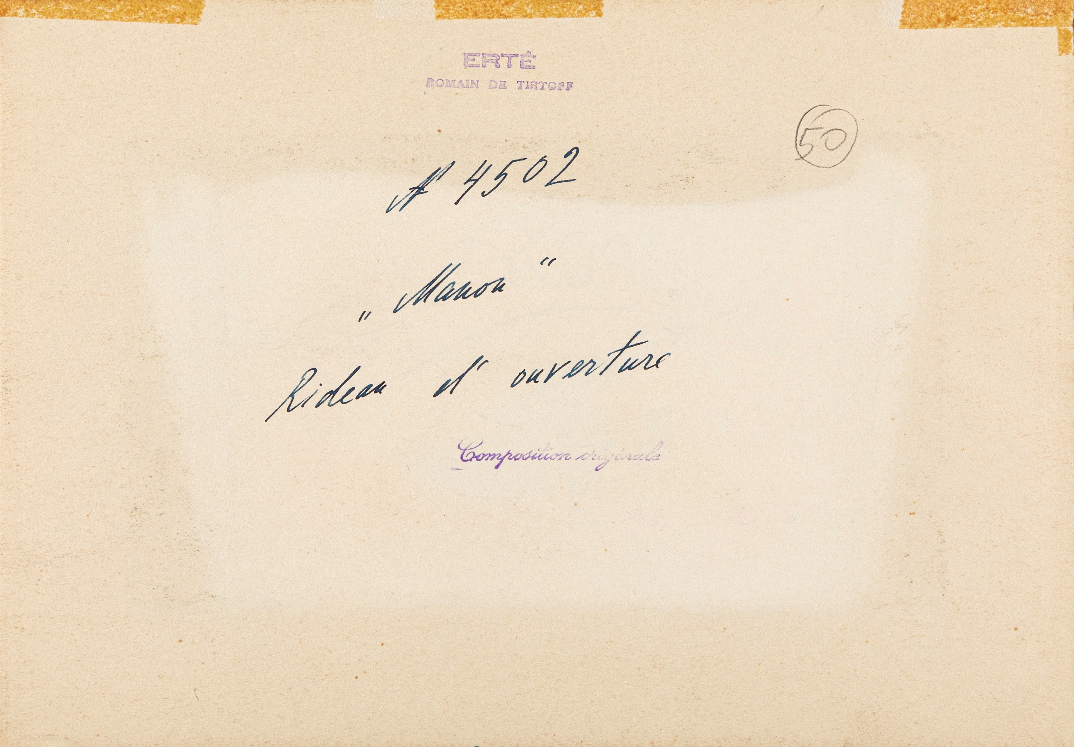 Original drawing made by Erté in the late 1930s for the scenography of the famous theater work "Manon Lescaut" by Giacomo Puccini. Bearing the title, the artist's stamp and the archive number 4502 on the back. Signed.