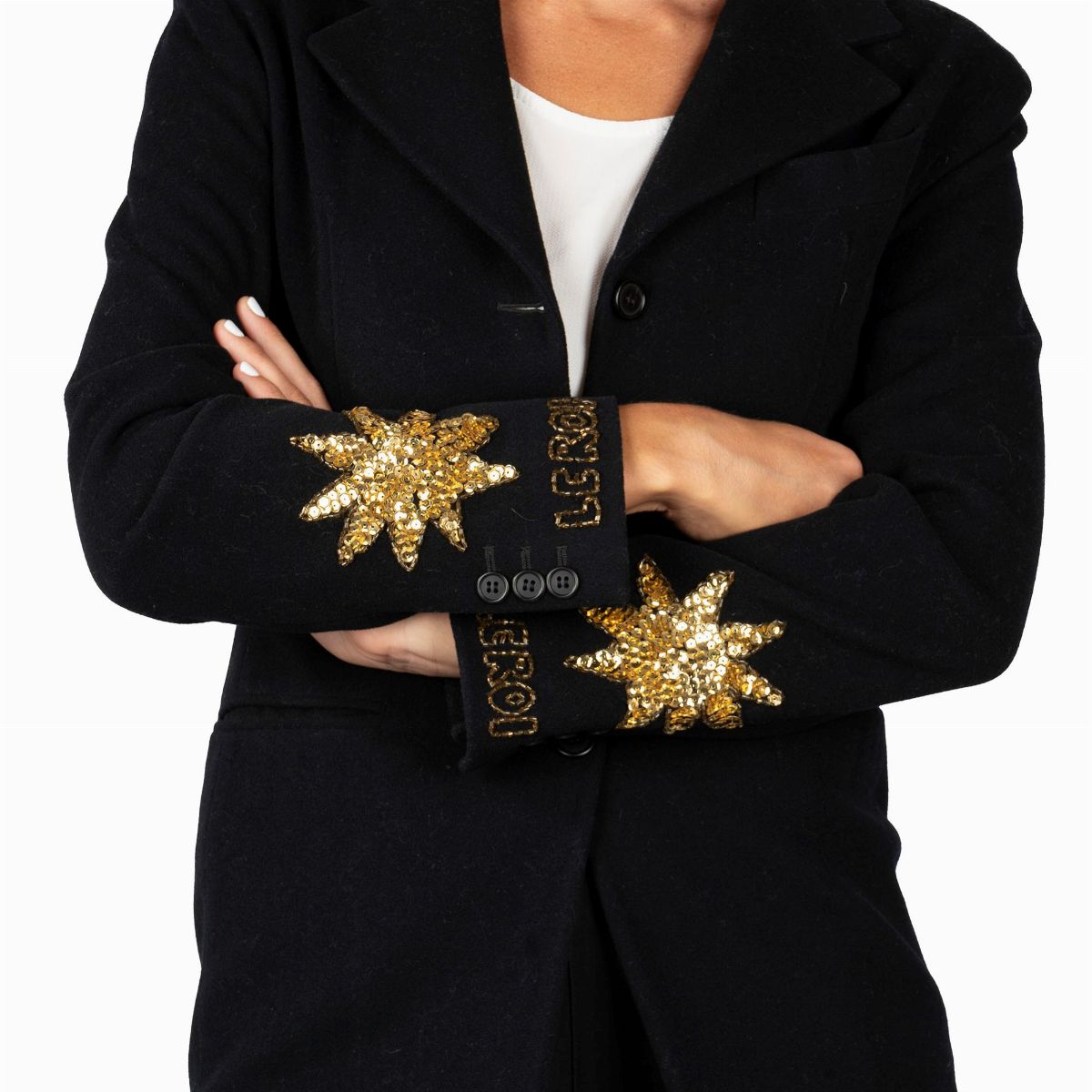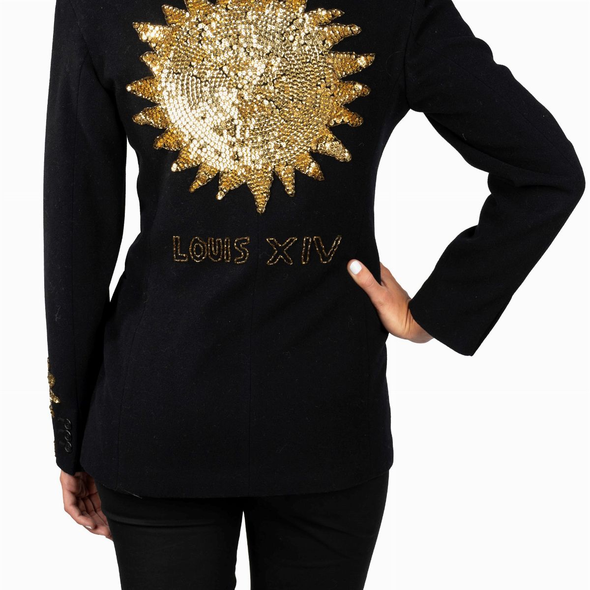 in black wool with golden sequin appliqués and embroidery with brown glass cannons, Italian size 42