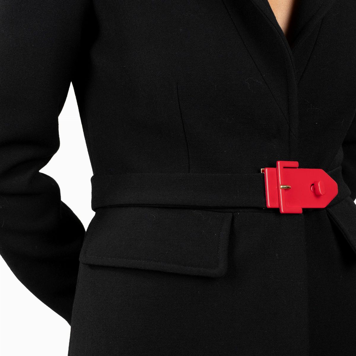 in black wool, belt with red composite material detail, Italian size 42